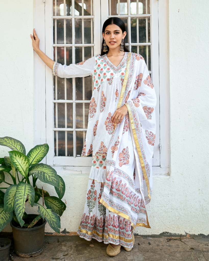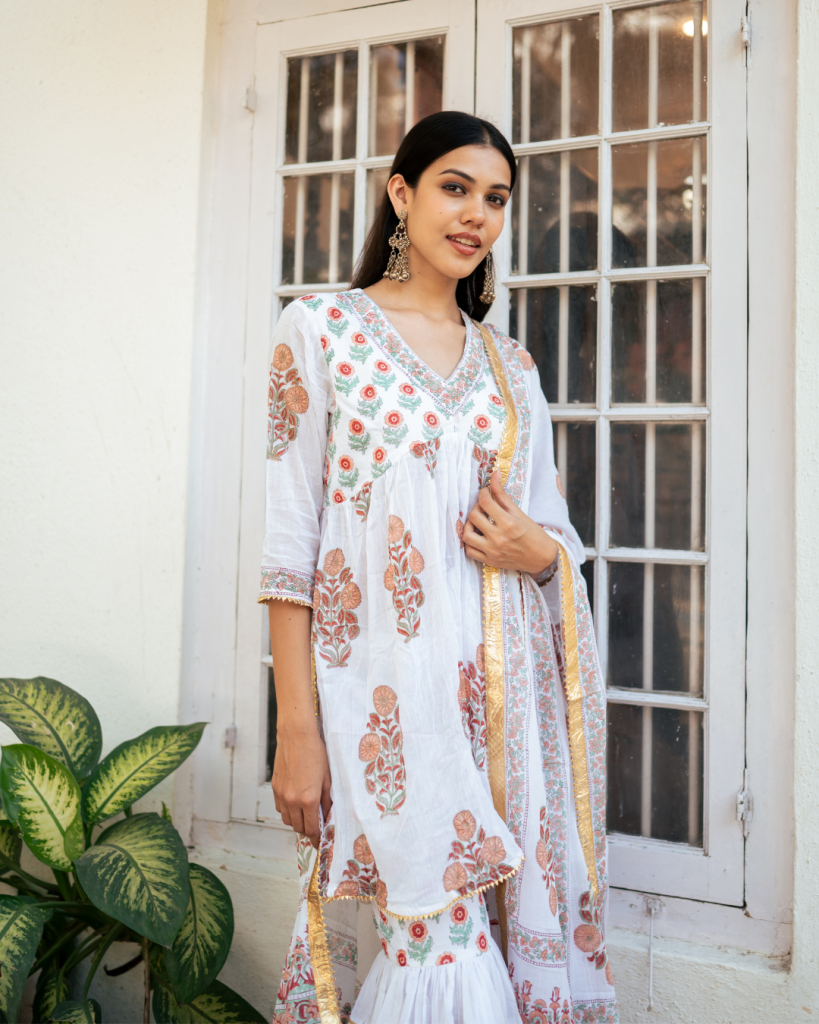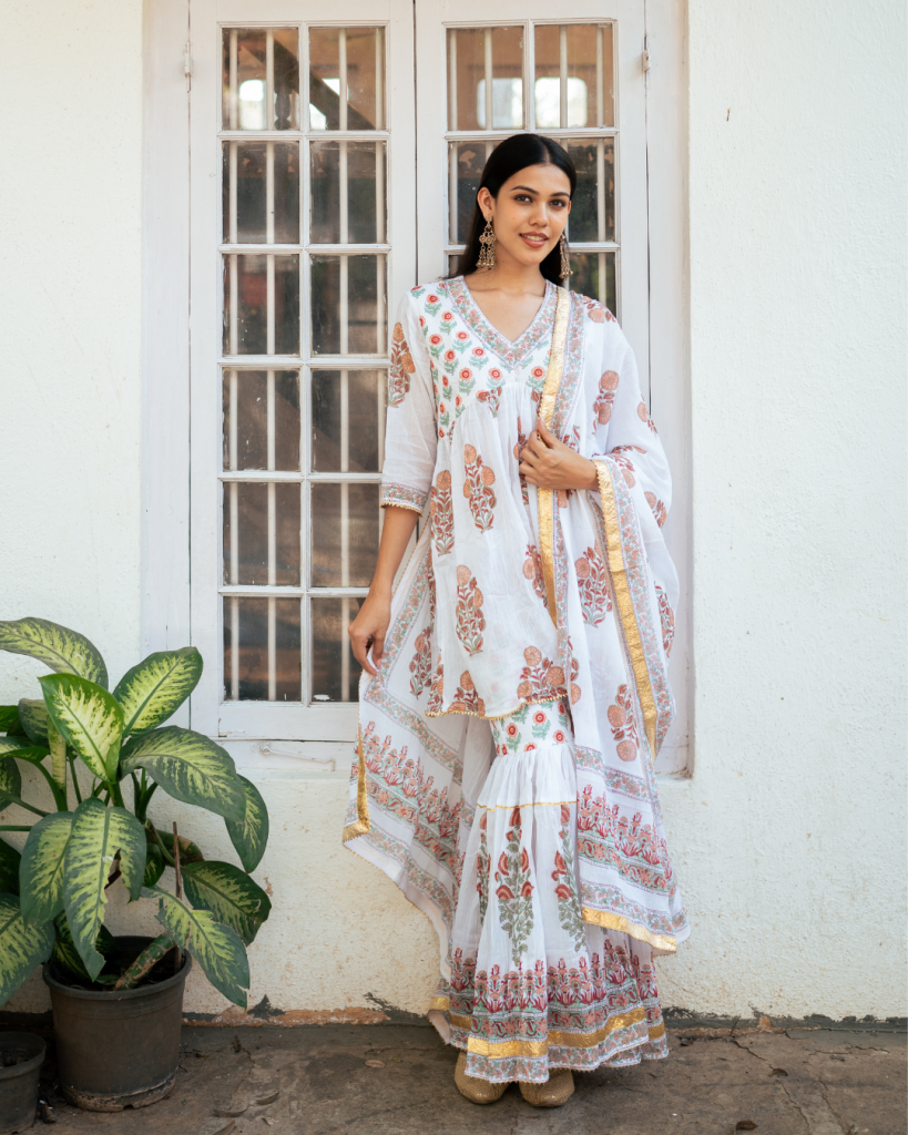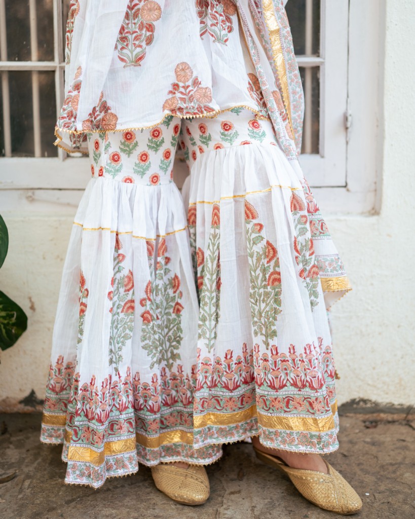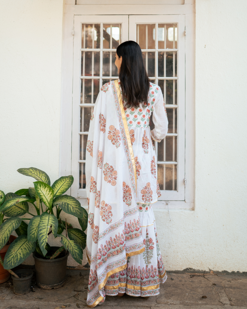 Translating prayer in Persian "Dua" is an amalgamation of our signature block prints, gota patti and classic silhouettes handcrafted on the most delectable base of cotton and Mul Mul.