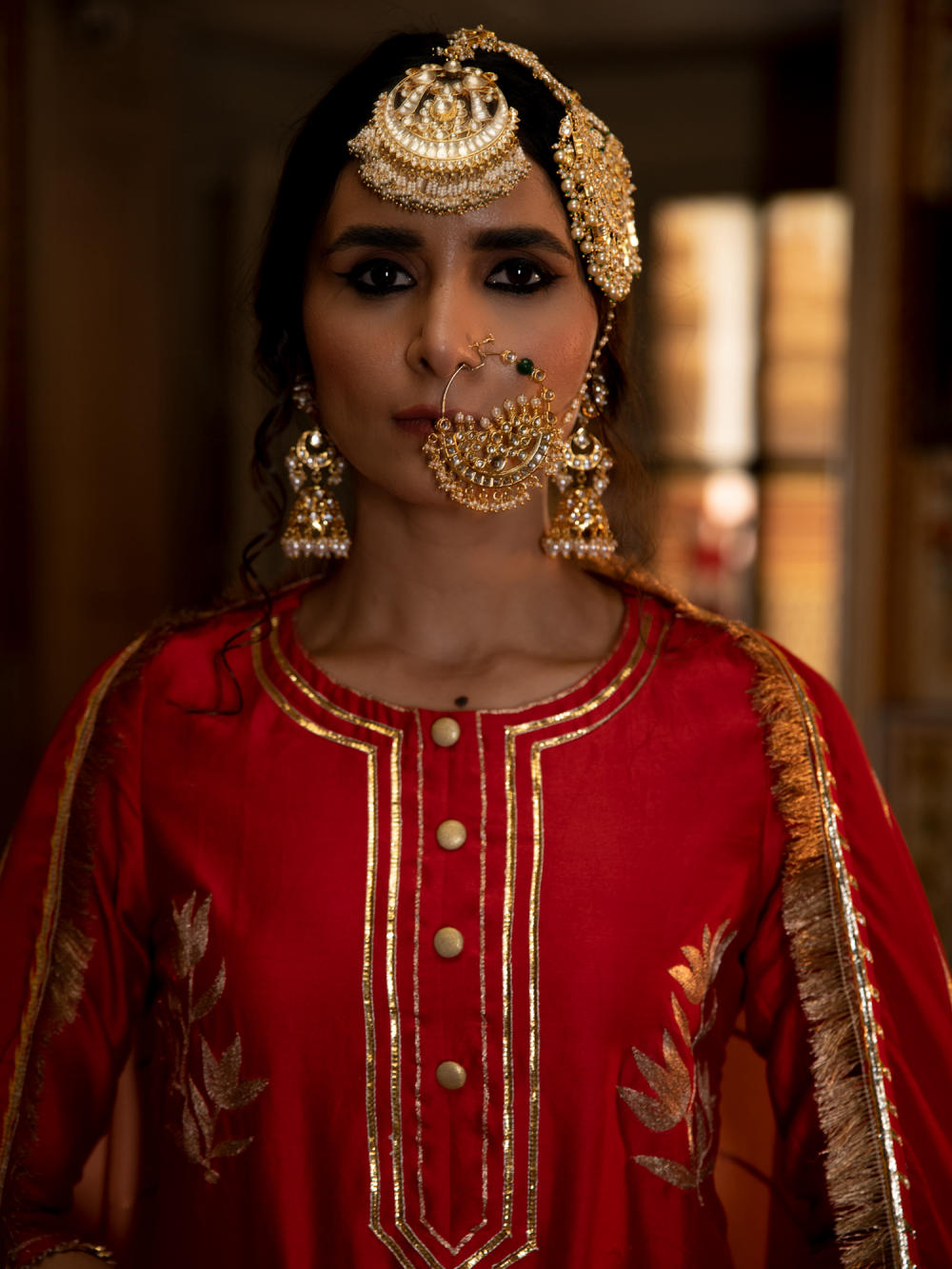 Enter the world of luxurious & regal clothing with Sahiba. Celebrate the grandeur of beauty, celebrations, dressing up and womanhood with vintage textiles and silhouettes. Set of 3 consists of kurta, salwar and dupatta. KURTA: A red chanderi silk kurta is detailed with with hand embroidered floral bunches in pittan. SALWAR: Red cotton silk salwar is detailed with gota dhari embroidery. DUPATTA - An ombre dyed muslin silk dupatta in peach and red is detailed with gota dhari embroidery finished with contrast magzi and kiran detailing.