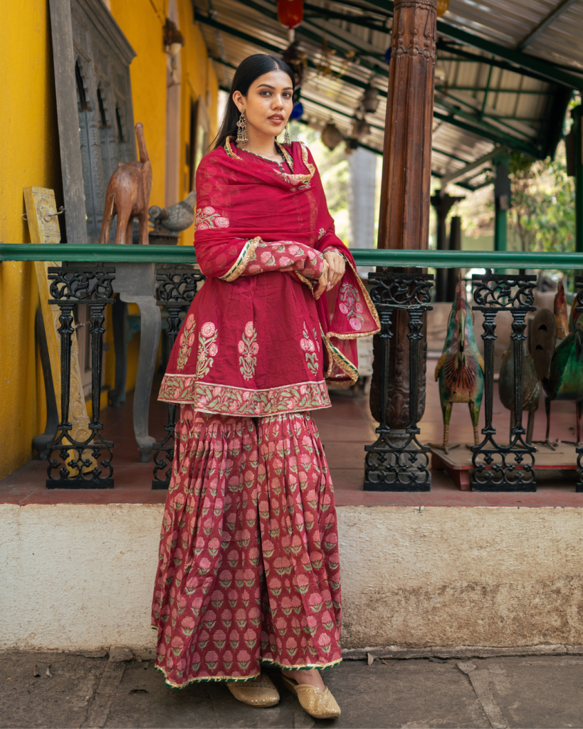 Introducing our Wine Block Printed Anarkali Set with a regal touch, complemented by a matching sharara, adorned with intricate patterns inspired by Indian heritage for a classic ethnic look.