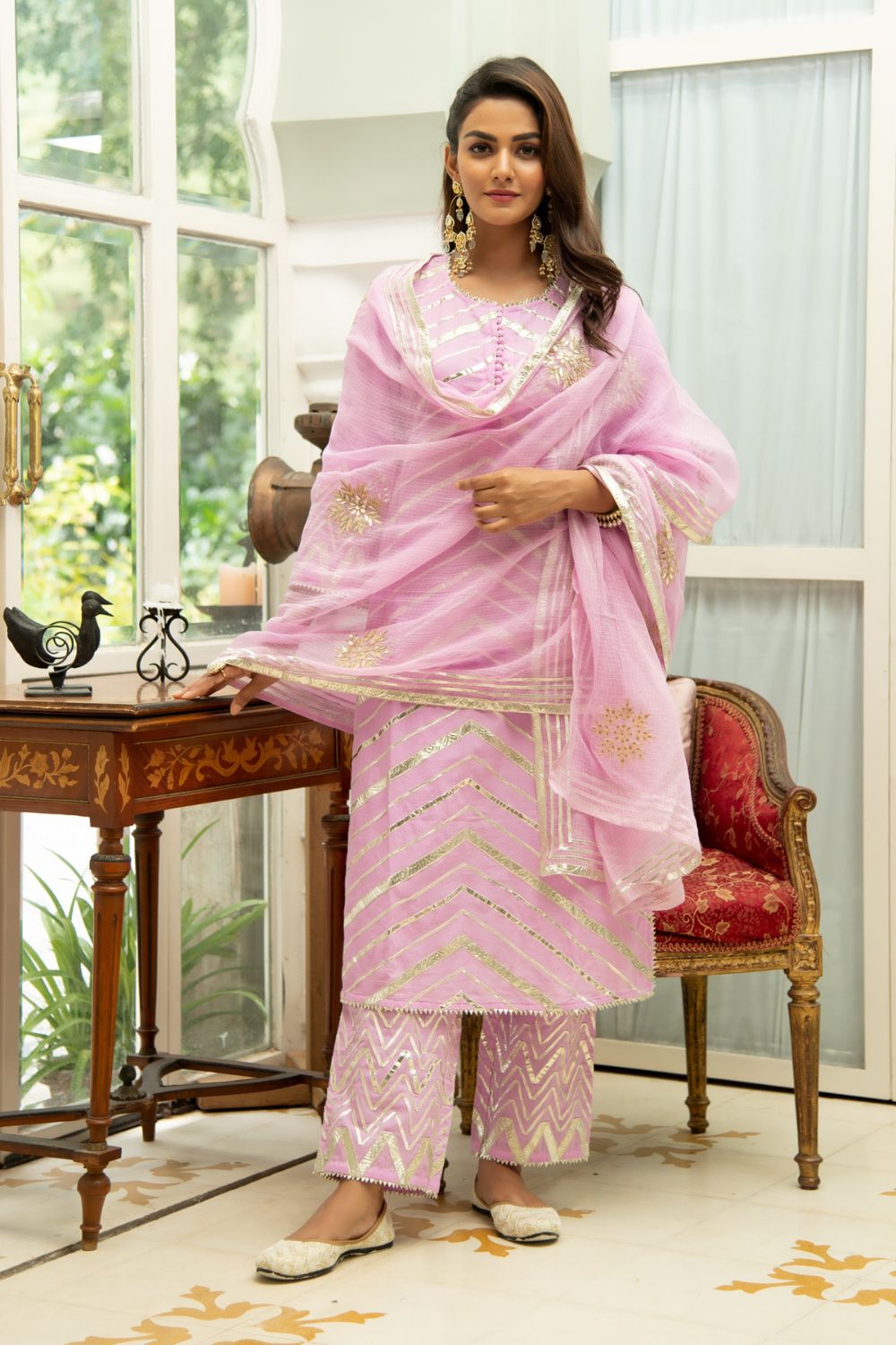 Set of 3 consists of kurta, palazzo and dupatta. Noor, bringing the magic of festivities straight to your closet in shades of pastels. Delicately adorned with lehirya gota detailing. KURTI: A delicated baby pink kurti with lehriya gota detailing on the neckline, sleeves & hemline. Adorned with potli buttons. DUPATTA: An elegant sheer kota doria dupatta, complete with handwork gota motifs. PANTS: Straight fit cotton pants enhanced with gota work.