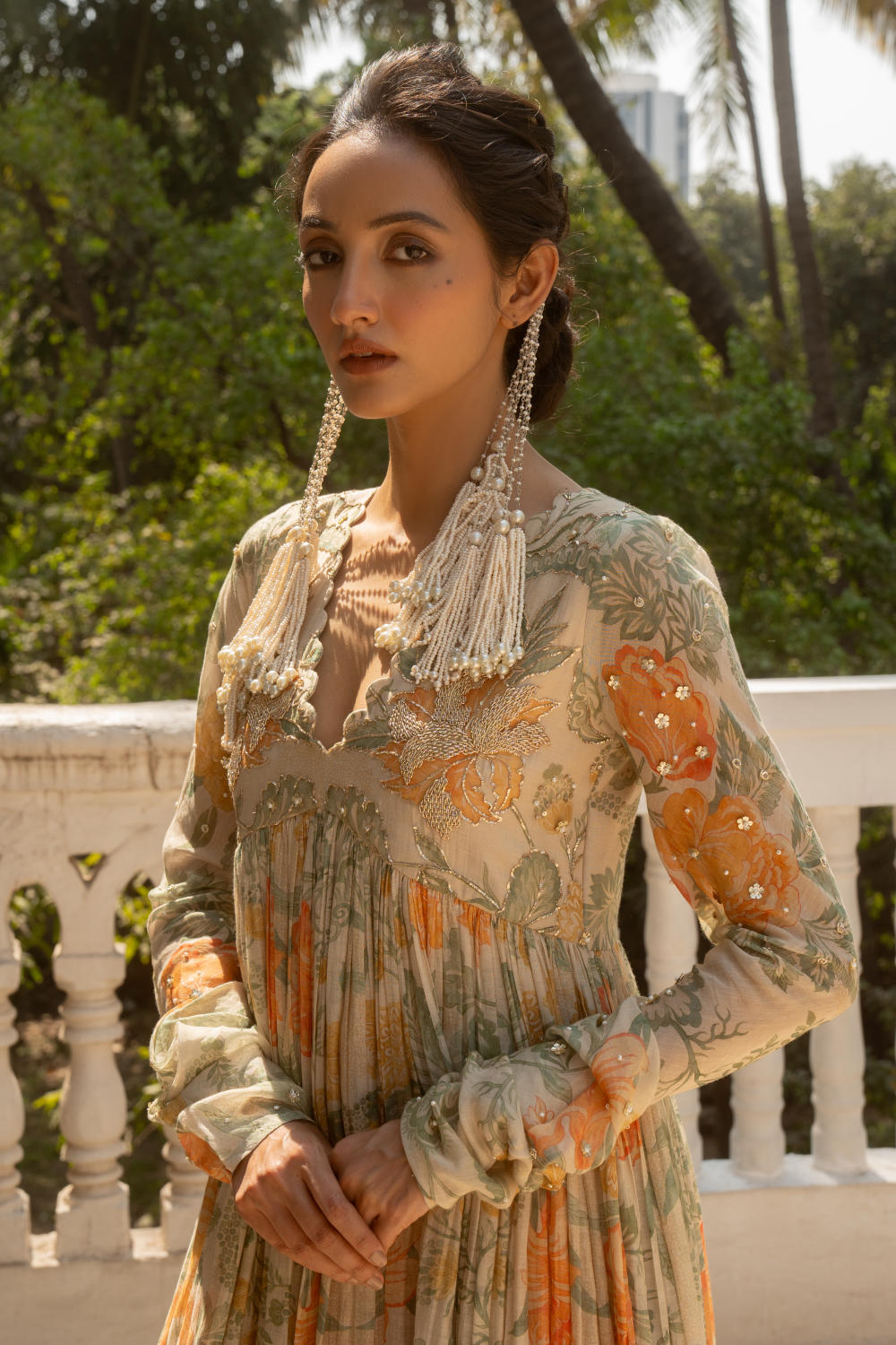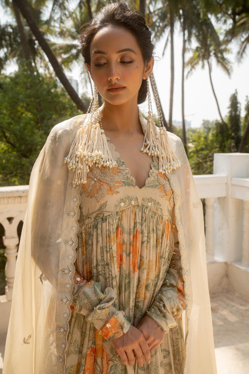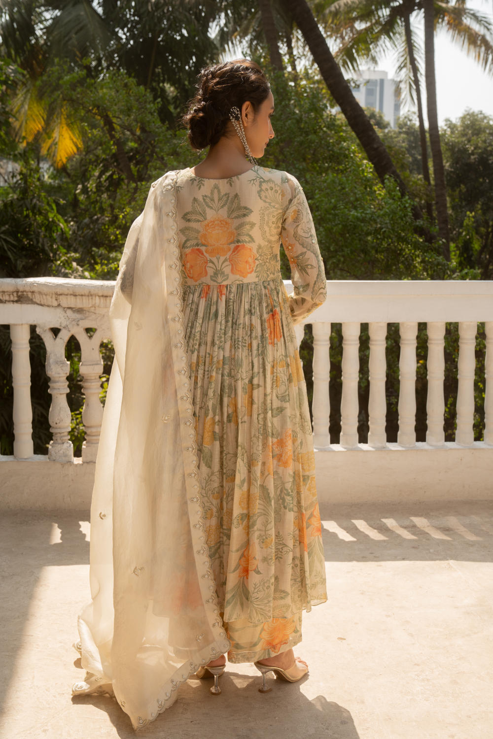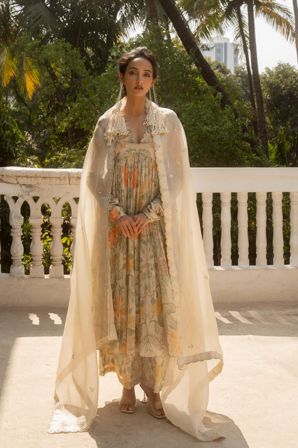 Featuring this scallop neck detailed anarkali set in our signature floral print. It has hand embroidered details. The look is completed with an embroidered dupatta and pants.