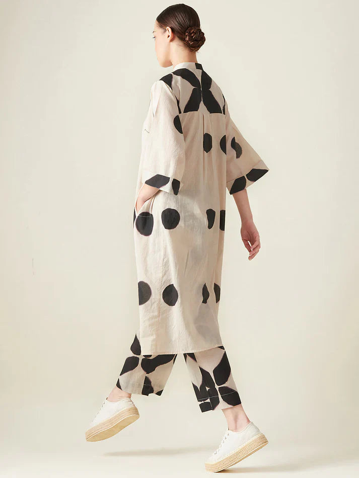 Aavidi’s language is one of soft architecture: silhouettes that breathe, fabrics that hold memory, and surface techniques — from clamp dyeing to block printing — that carry the imprint of time. Here, simplicity isn’t minimalism; it’s clarity. A grounding. A return.