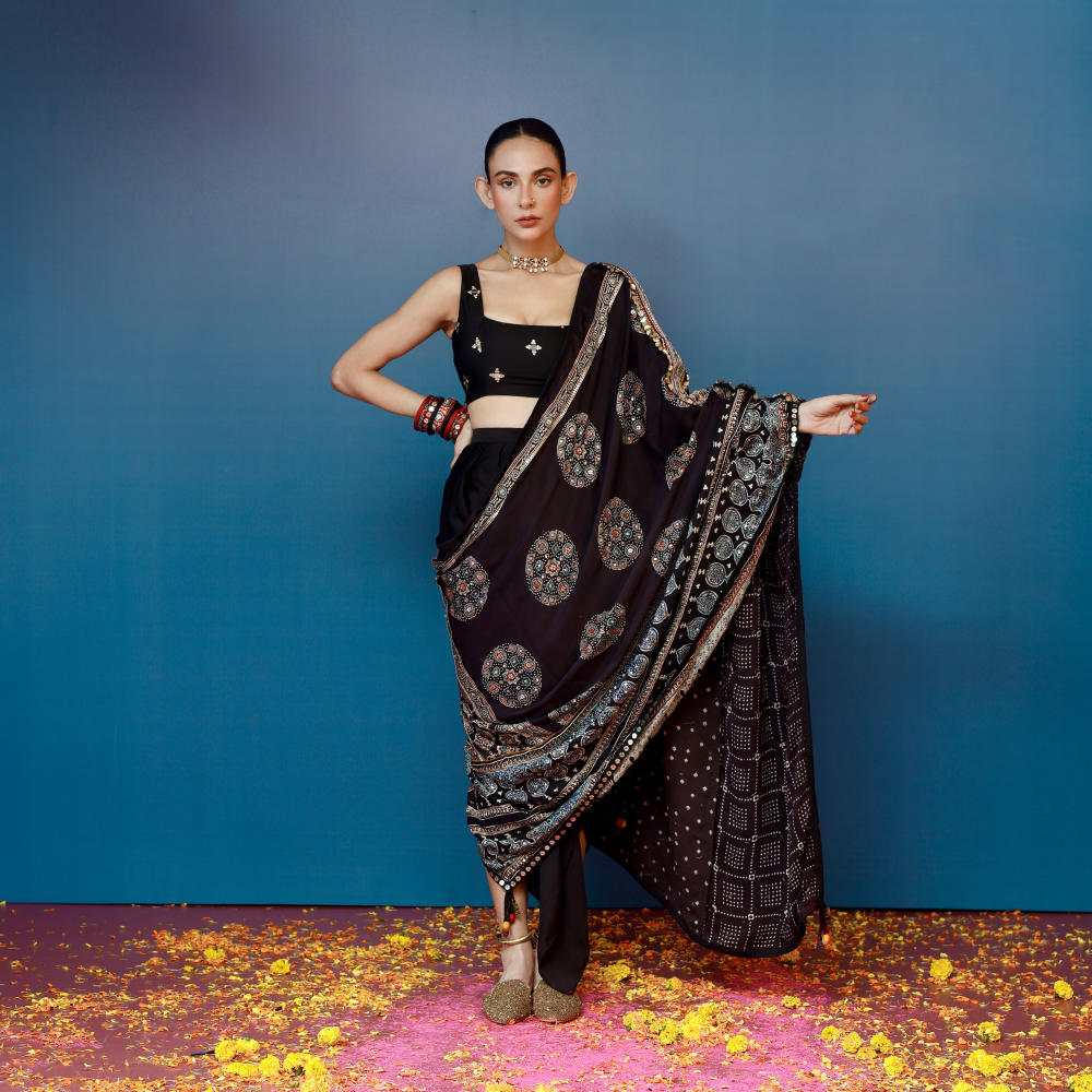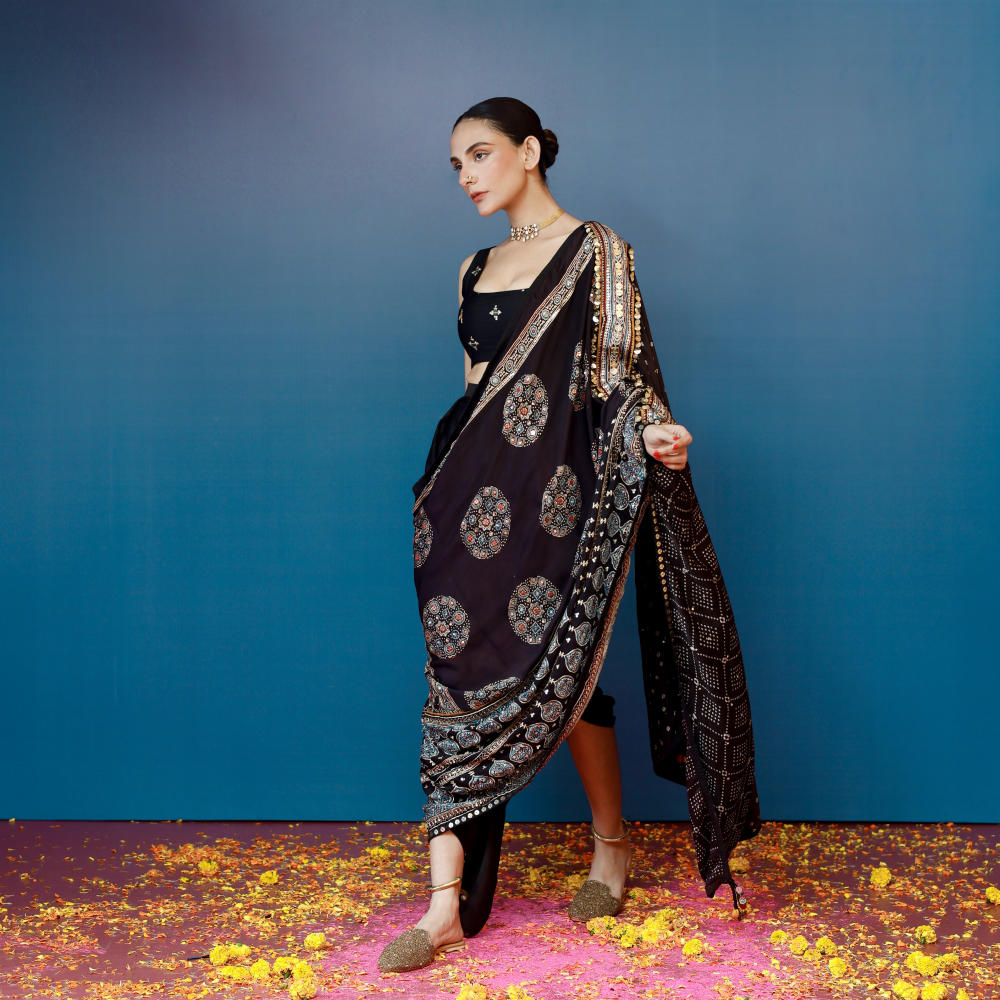 This stylish Ajrakh hand-embroidered half cape drape, paired with handembroidered satin blouse and skirt, is the perfect ensemble for all your Indo-western style needs. A seamless fusion of traditional embroidery and contemporary design, this outfit offers both elegance and comfort. Part of our Aaram series, it’s designed for effortless dressing—get ready in a giffy without compromising on style. Ideal for weddings, festive events, or upscale gatherings.