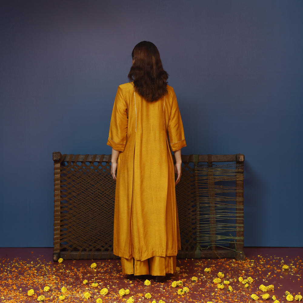 This simple relaxed kurta with box pleats, paired with palazzo pants, offers both comfort and elegance. Designed to be versatile, it can be styled with dupattas, dusalas, capes, or bundi jackets for added flair. Whether you're going for a casual look or dressing up for an occasion, this kurta can be paired with chokers or chand balis for a minimalistic yet stylish appearance. Perfect for those who value simplicity, comfort, and adaptability in their wardrobe.Here its paired with Ajrakh hand embroidered half cape in abstract setting.