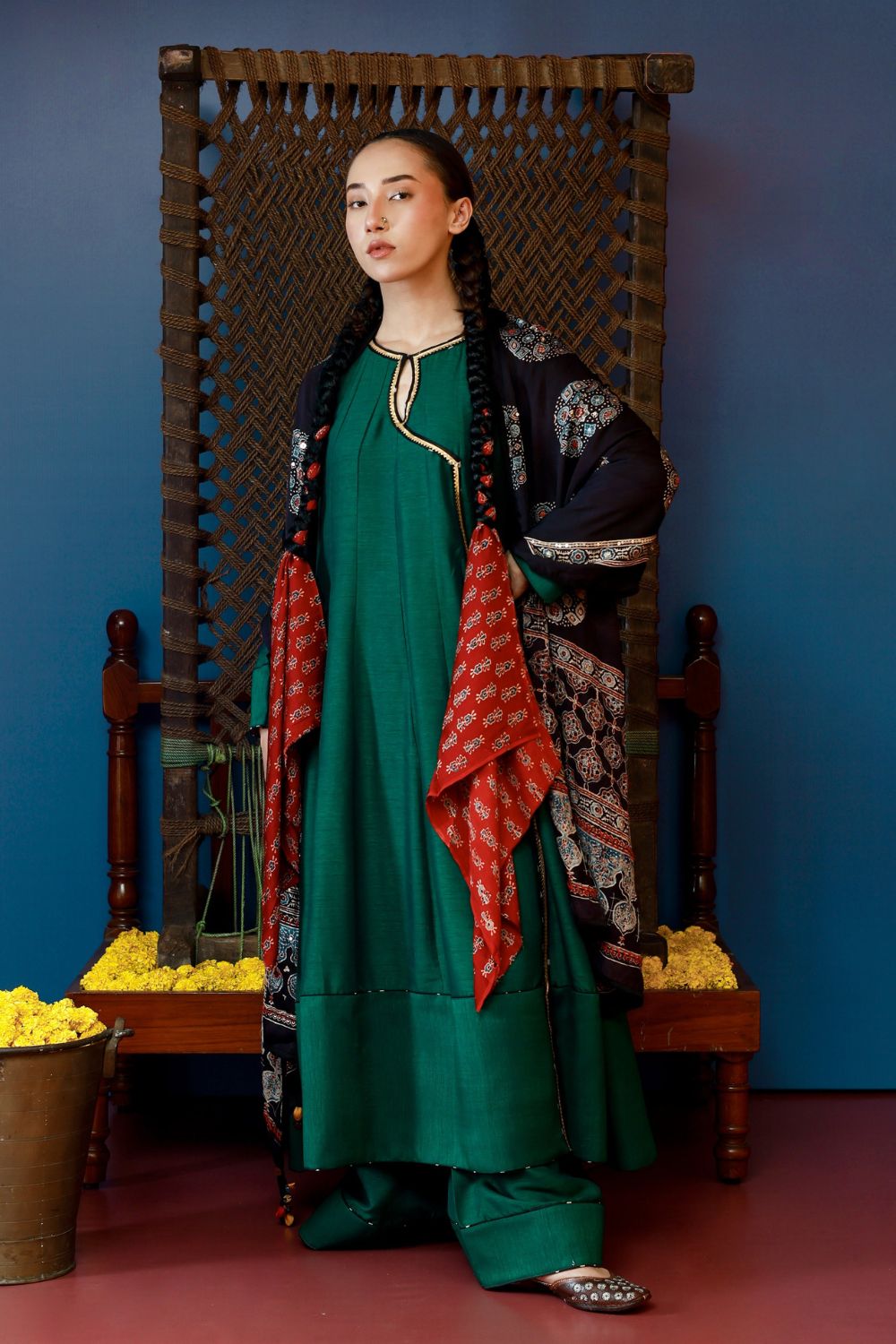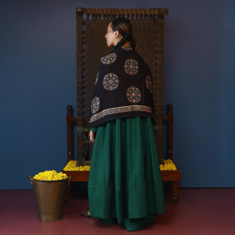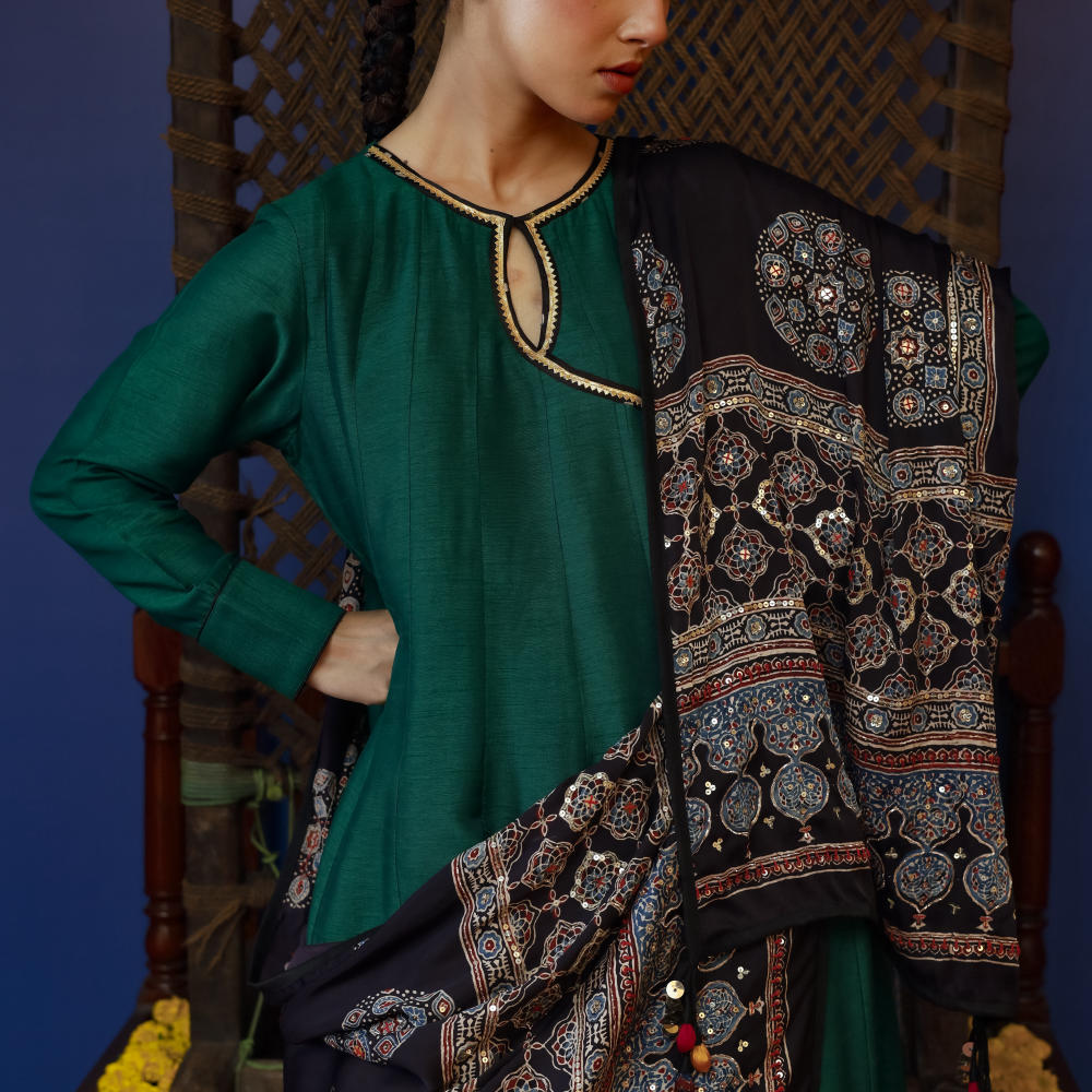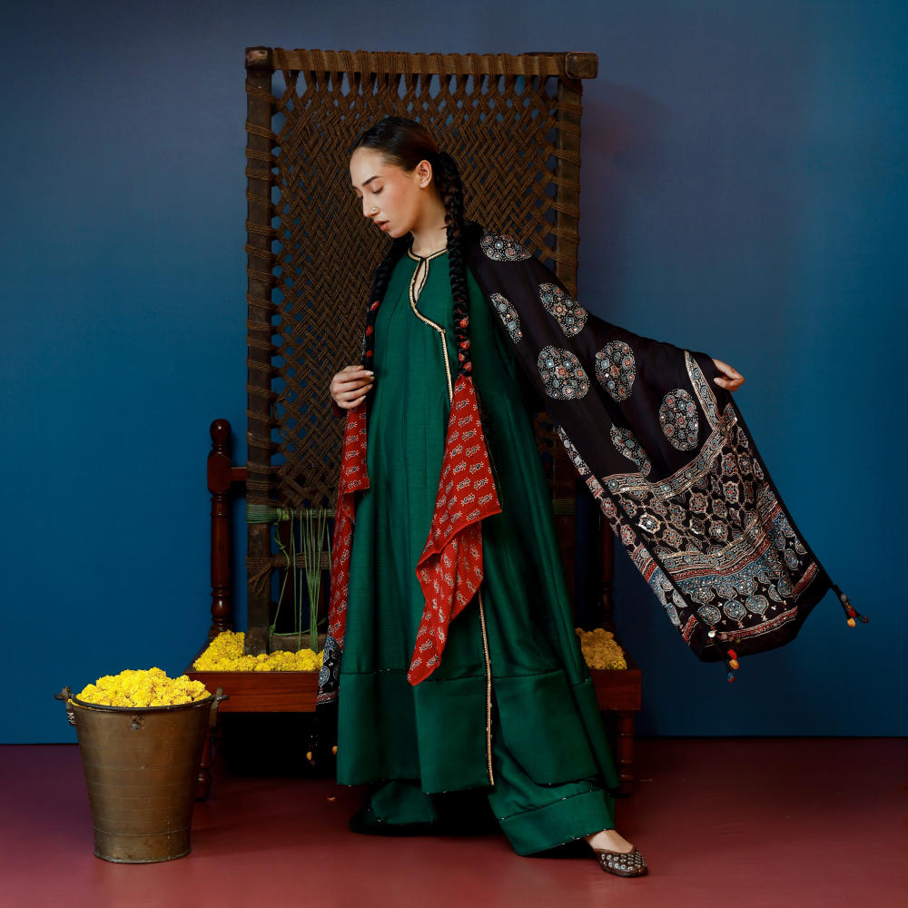 This green long kali overlap style kurta set is paired with wide palazzo pants, offering a formal yet stylish look. The set is completed with hand embroidered Ajrakh dupatta,perfect for formal occasions or pre-wedding wear, this ensemble blends traditional detailing with modern design