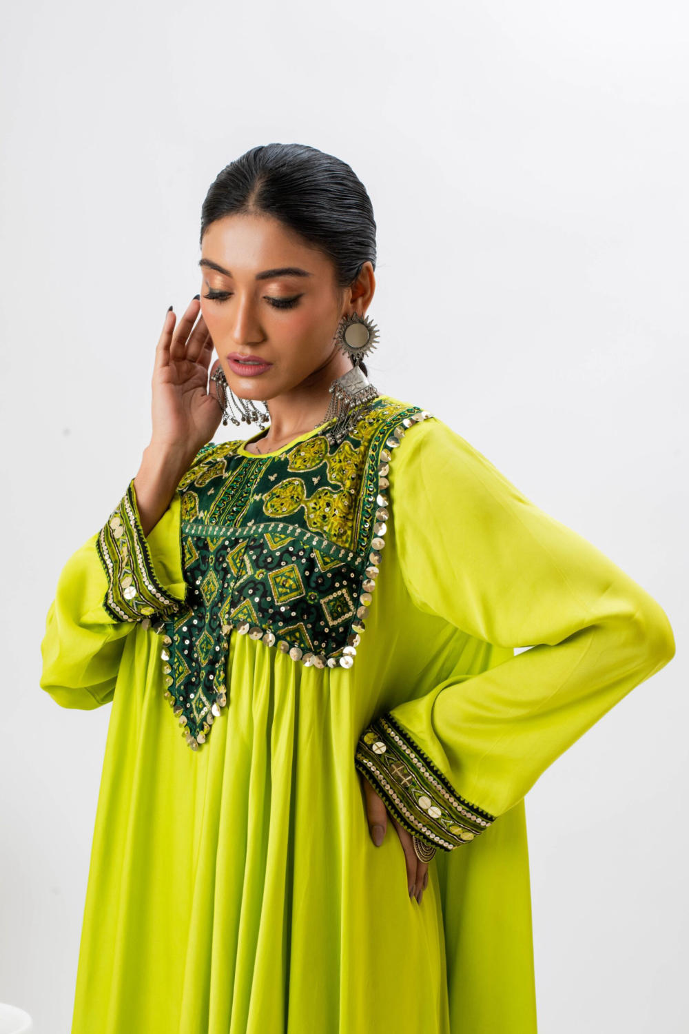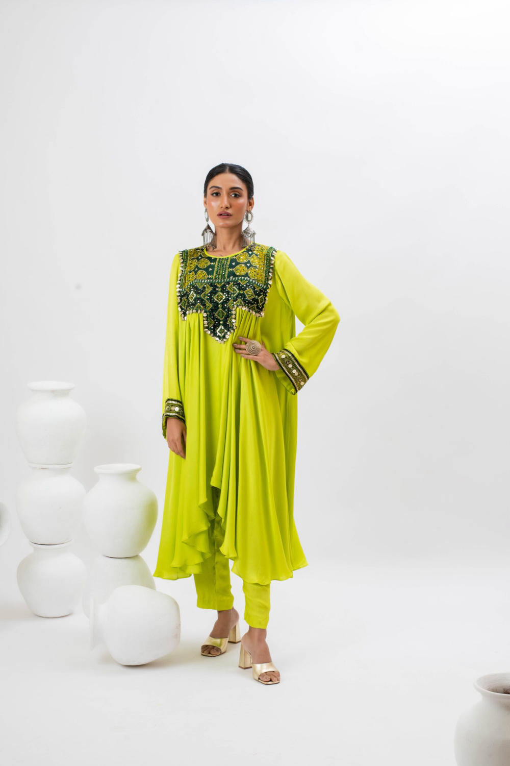 Long Kurta with hand embroidered ajrakh patch yoke in front.The set os completed with hand-embroidered ajrakh dupatta in black handprint