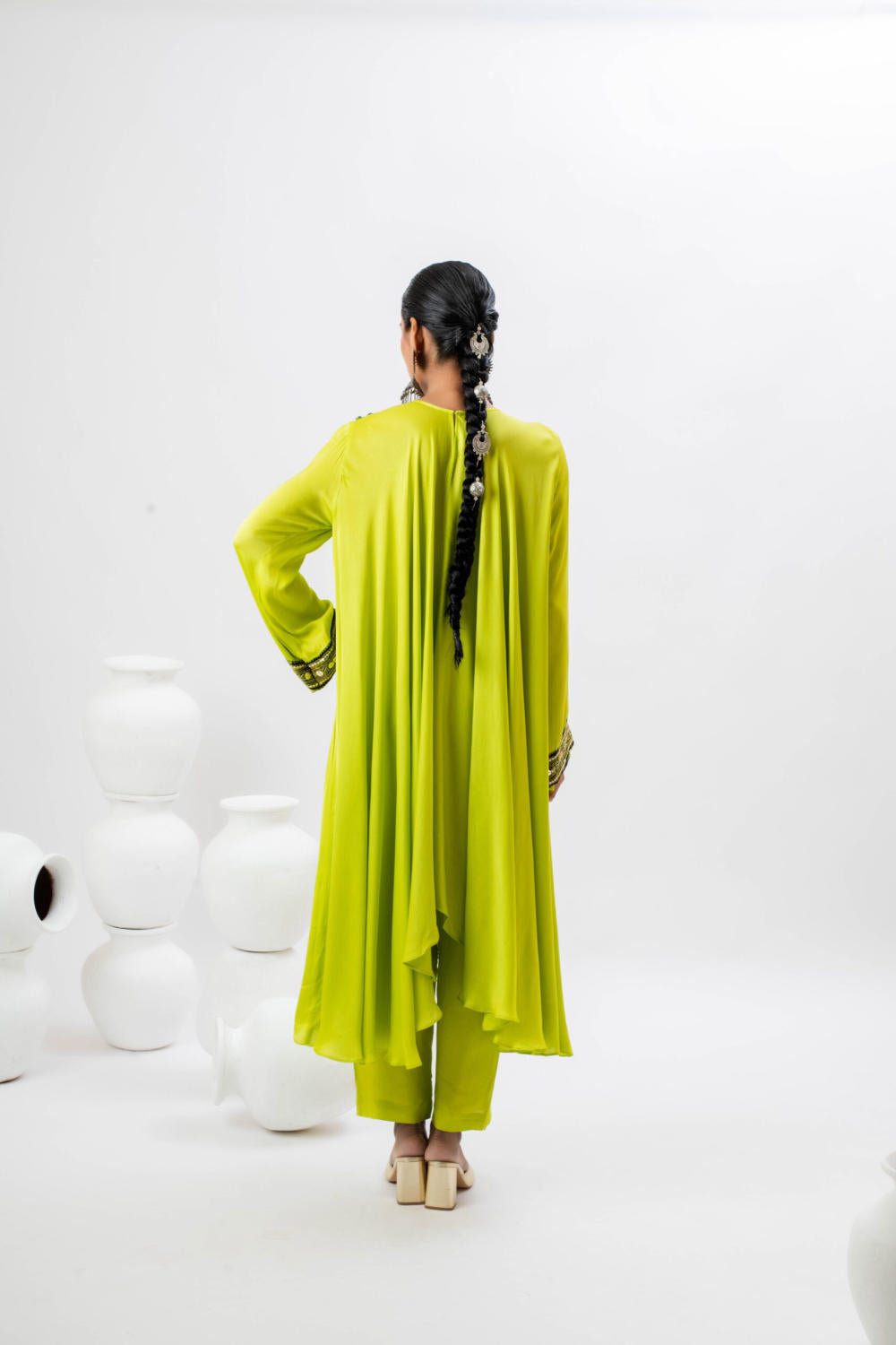 Preeti’s design philosophy is refreshingly modern: she takes silhouettes we know — the salwar set, the kurta, the lehenga-inspired skirt — and strips away the weight, quite literally. Fabrics rooted in heritage such as ajrakh and handwoven textiles become unexpectedly playful under her lens. A burst of neon here, a reworked motif there, a dash of embroidery that feels artisanal but never ornate.