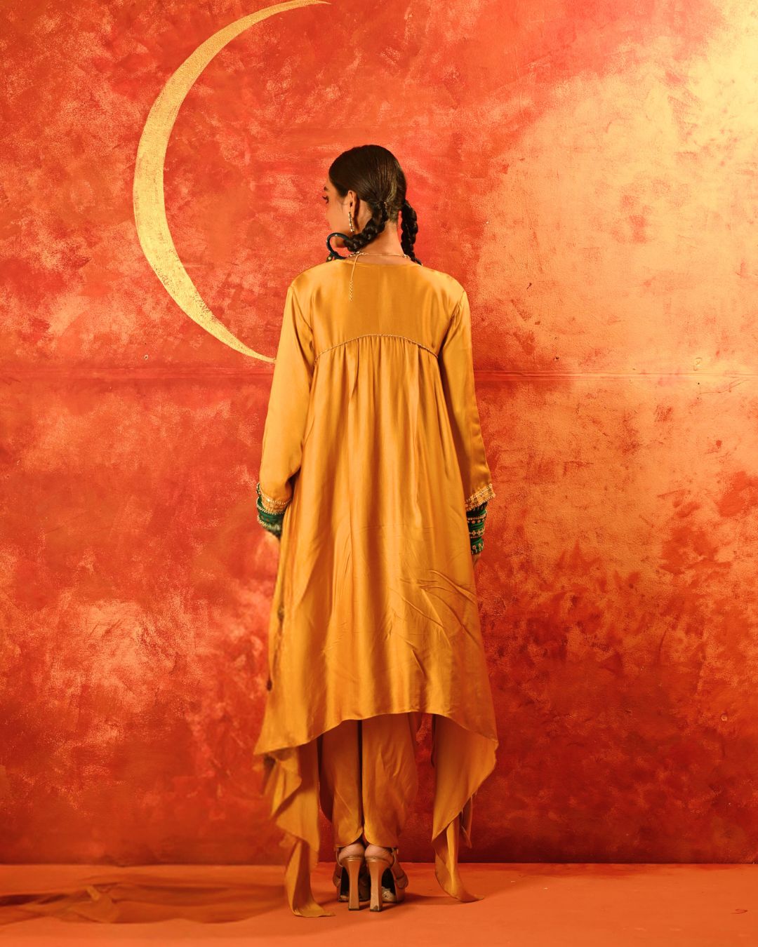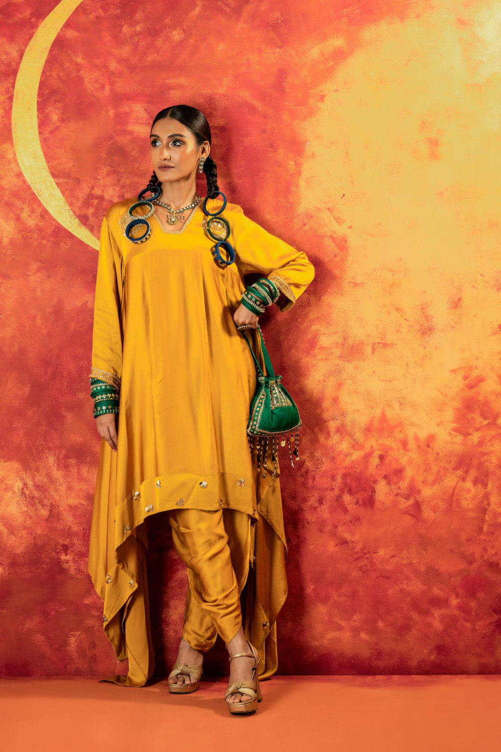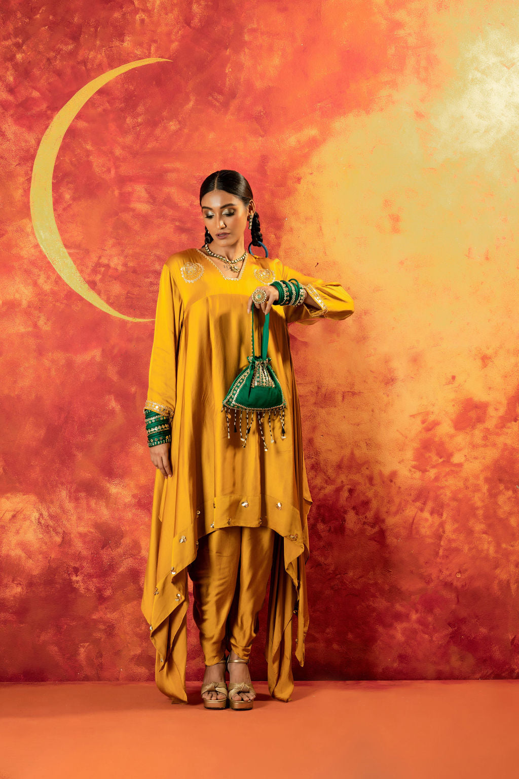 A stylish asymmetric kurta with dhoti set in vegan satin highlights the signature Luna motif for an ornamental touch. Designed with intricate hand embroidery featuring light gold sequins and pearl bead detailing, it is perfect for festive and pre-wedding occasions.
