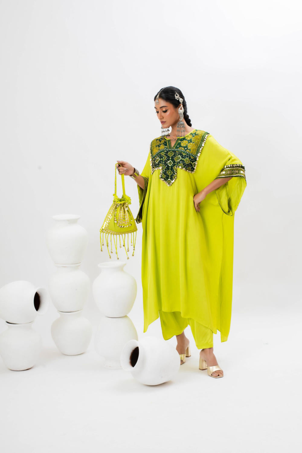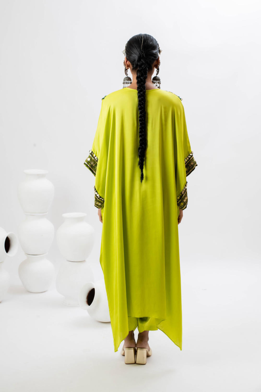 Long Kurta with hand embroidered ajrakh patch yoke in front & on pants with boho detailing