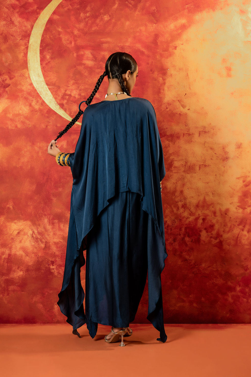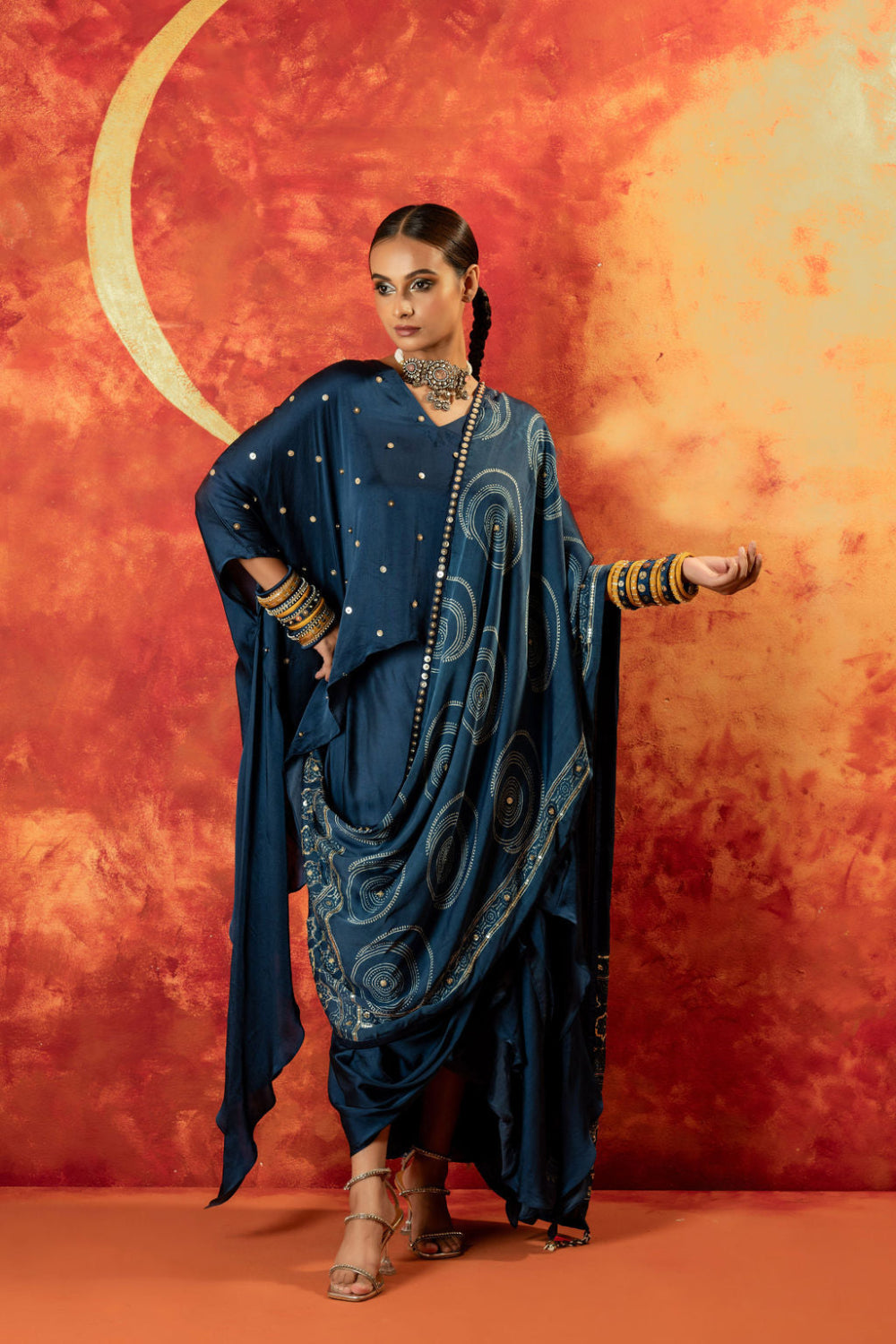This signature anti-fit asymmetric tunic features exquisite hand embroidery with sequin, pearl beads, and zari. Paired with a matching signature cowl skirt and an added drape, it’s perfect for pre-wedding and festive events, offering a blend of elegance, versatility, and sophisticated charm.