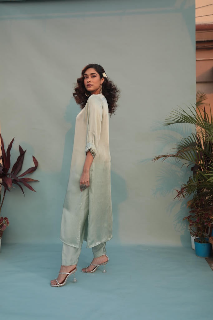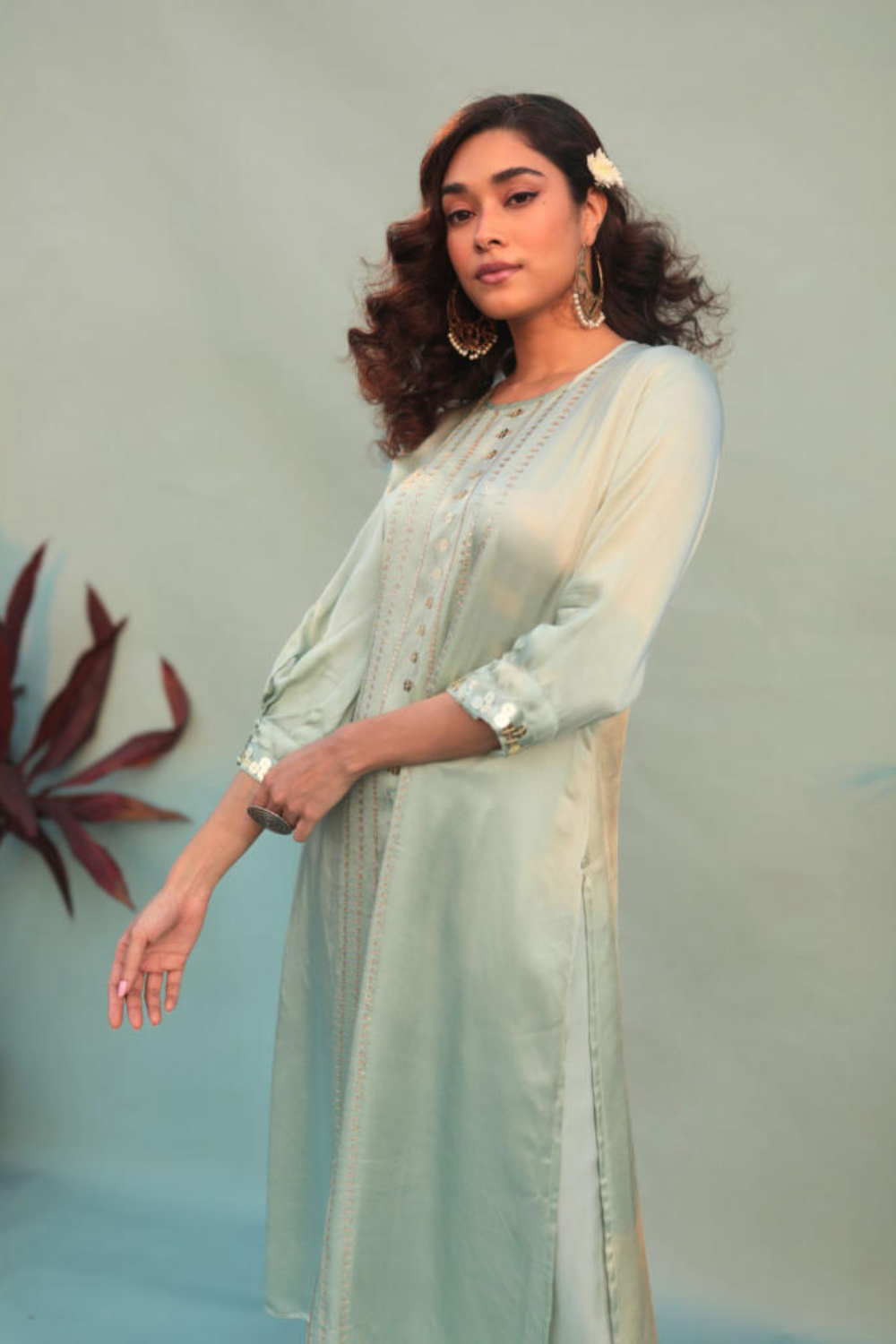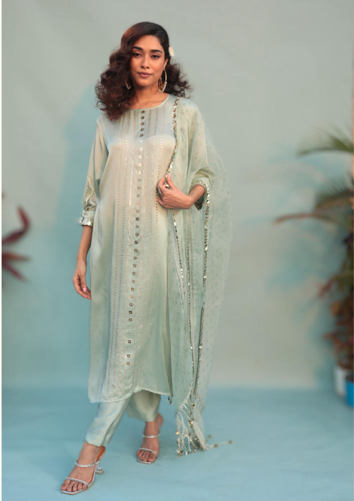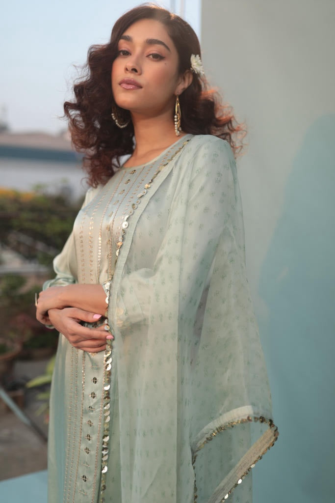 Introducing our pastel green hand-embroidered kurta with multiple styling option.Kurta is hand embellished with mirror-like sequins. Paired with delicately handblocked silk organza dupatta and pants to complete the set.