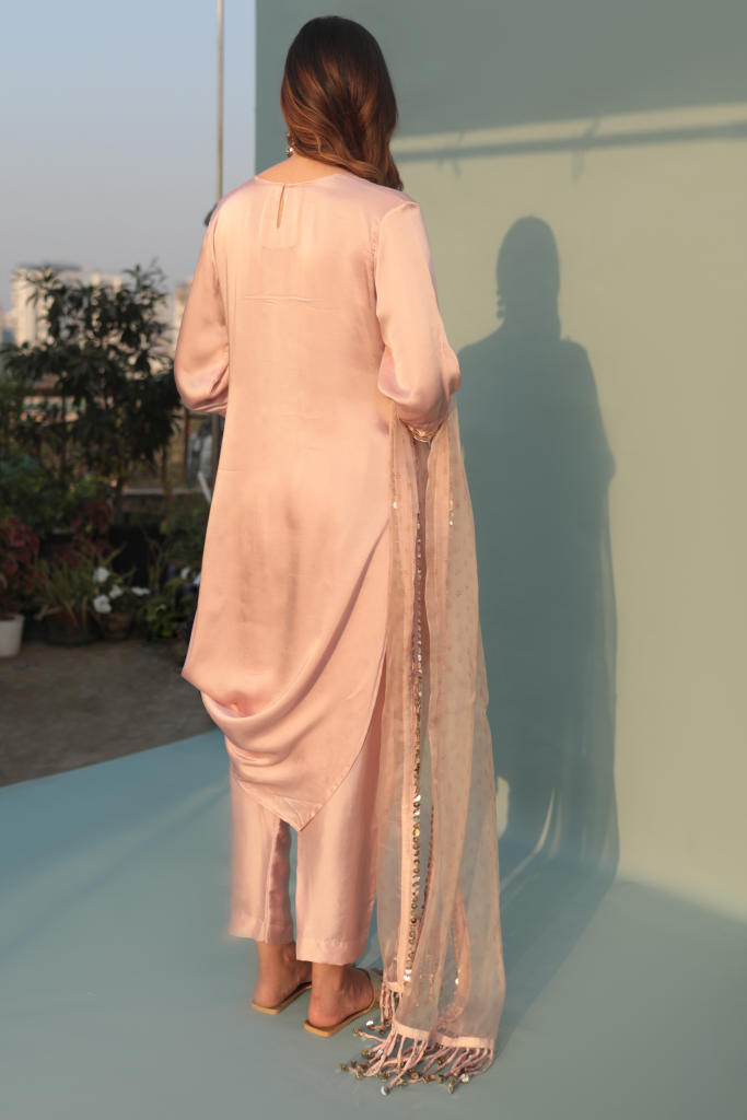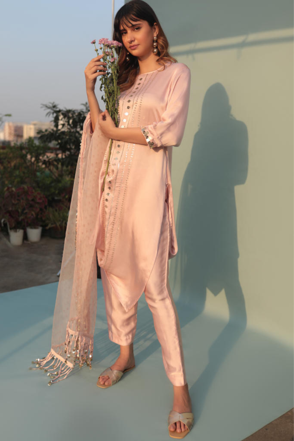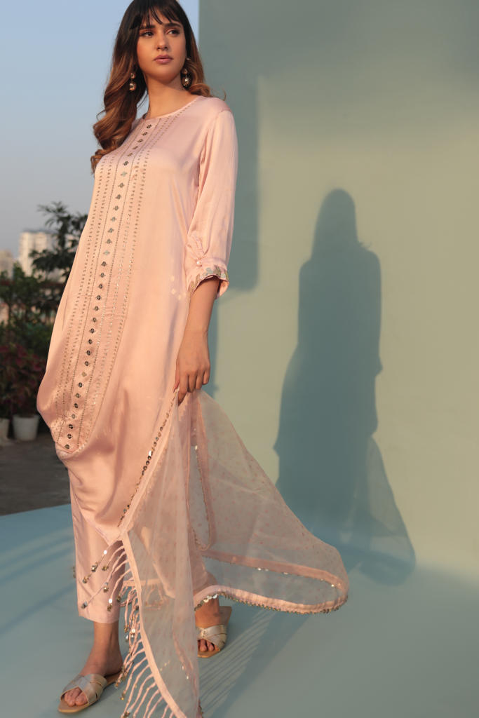 Introducing our pastel pink hand-embroidered kurta with multiple styling option.Kurta is hand embellished with mirror-like sequins. Paired with delicately handblocked silk organza dupatta and pants to complete the set.