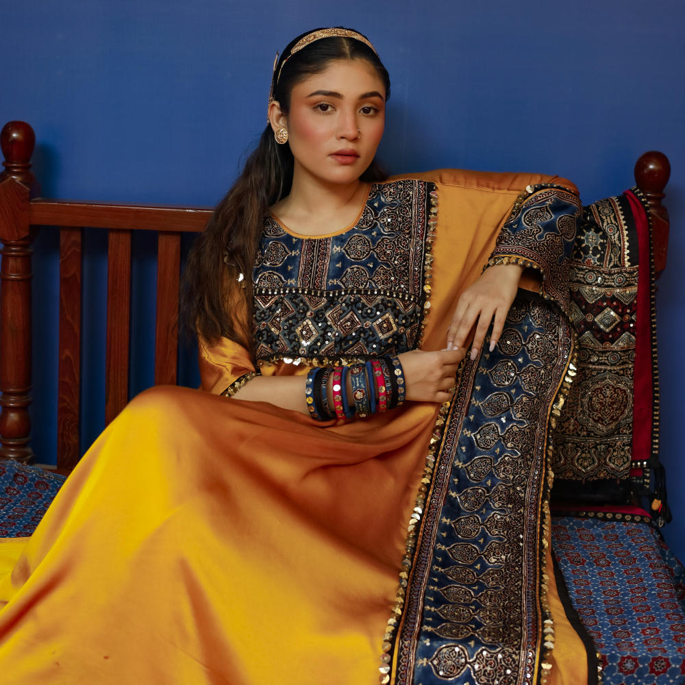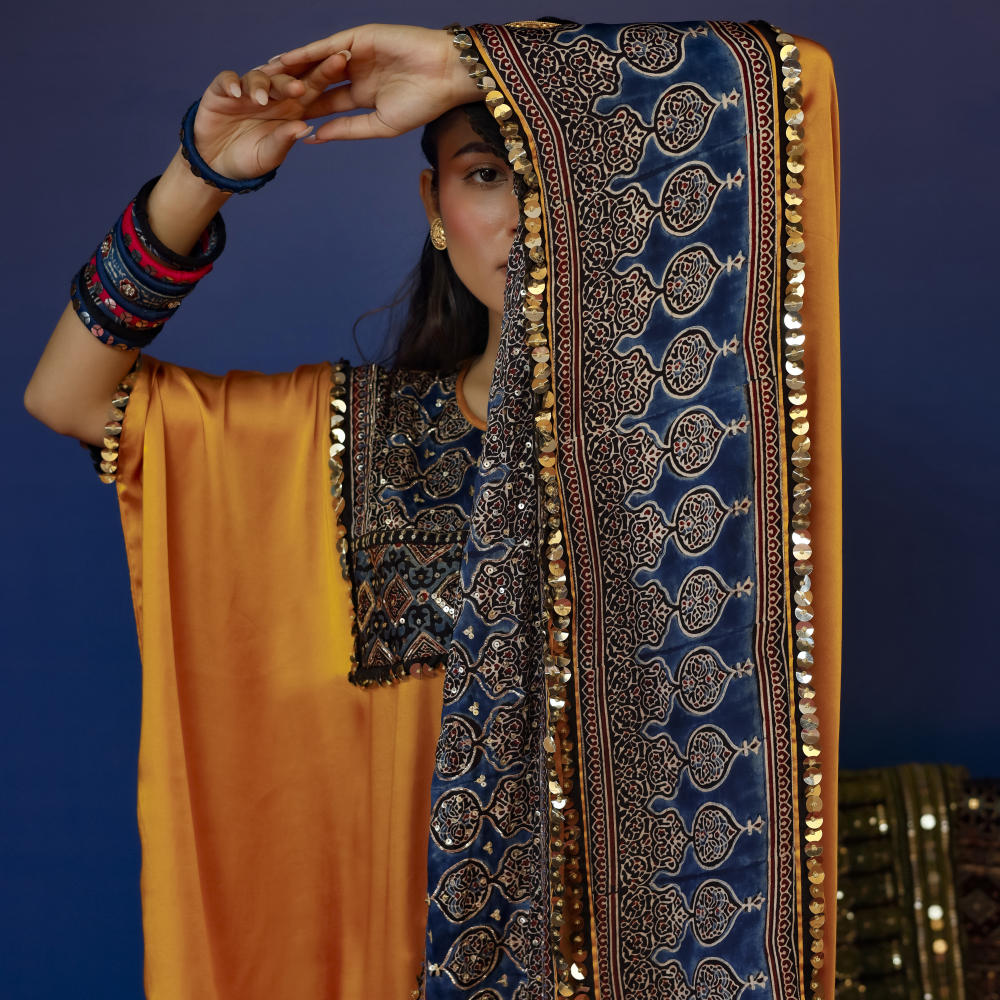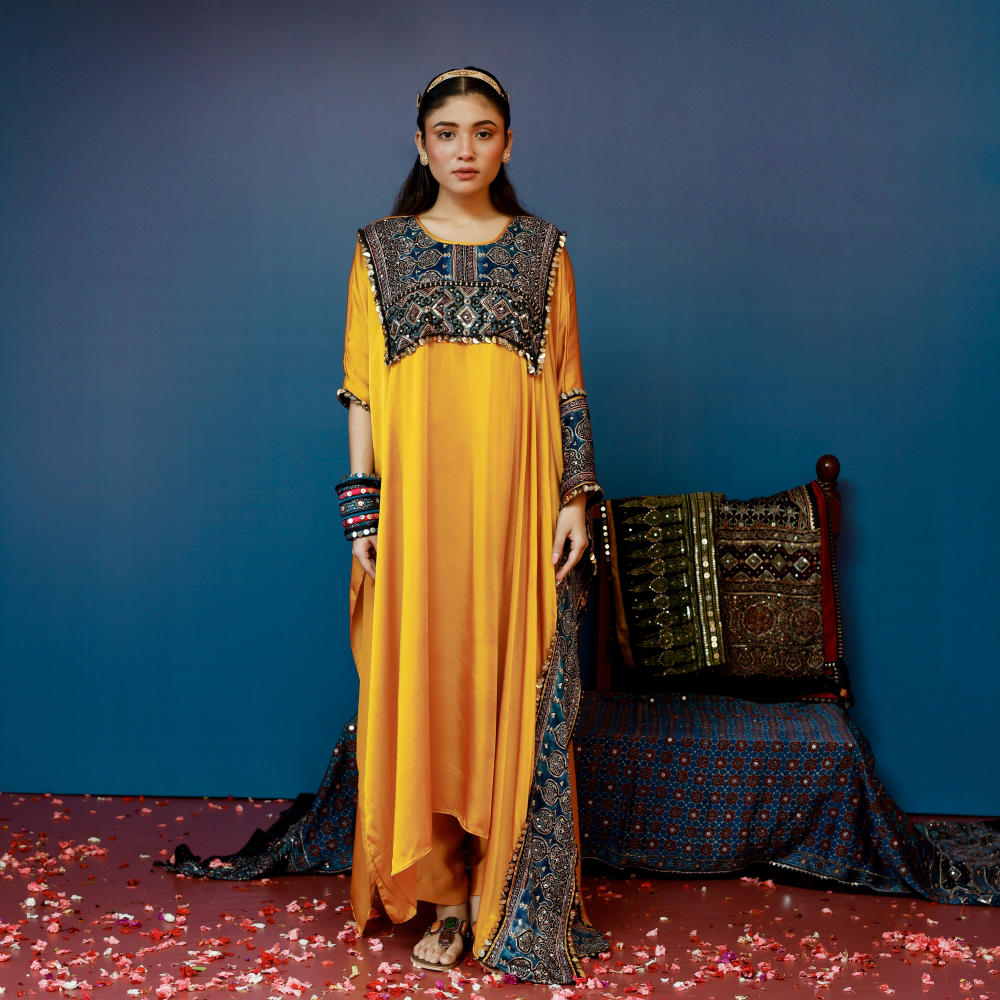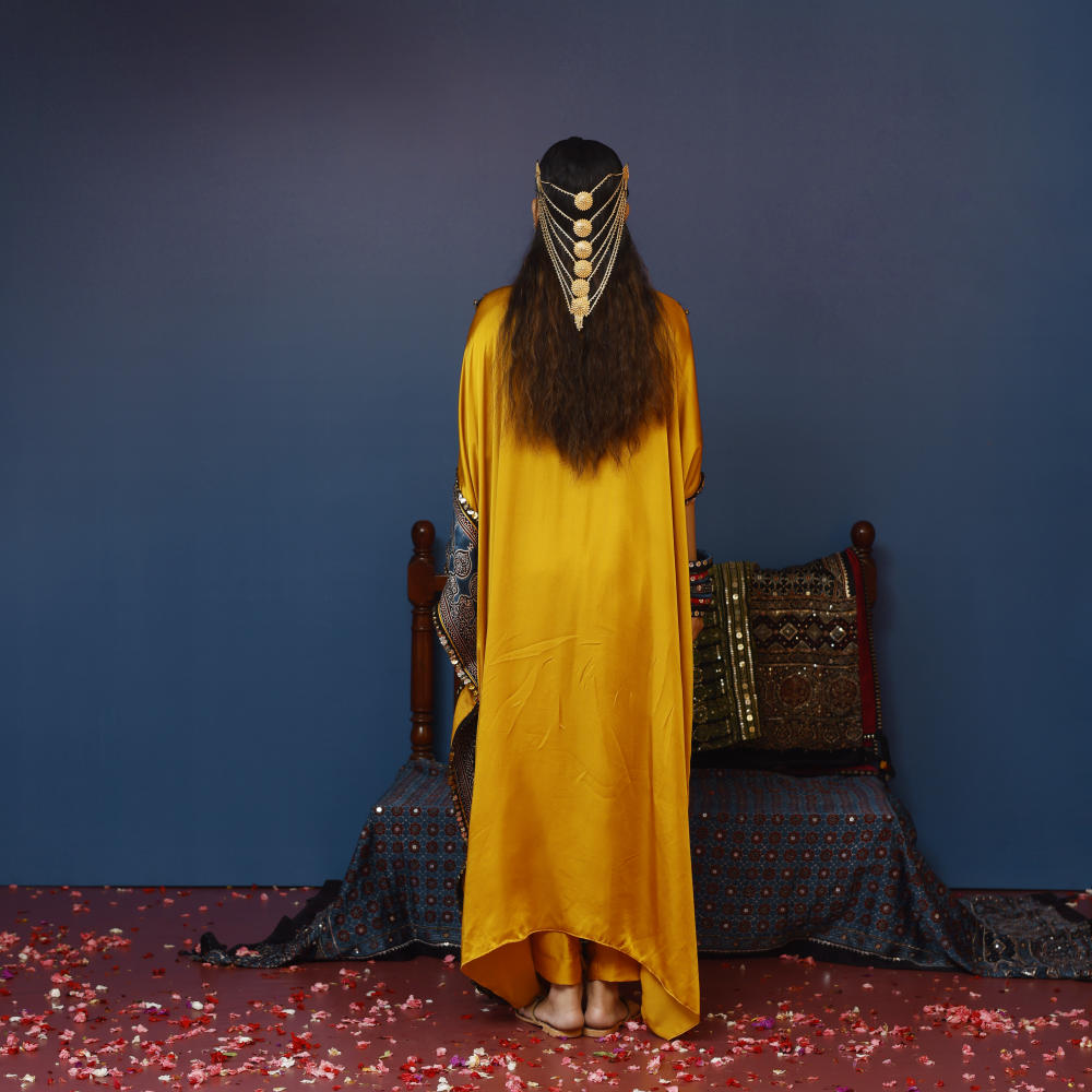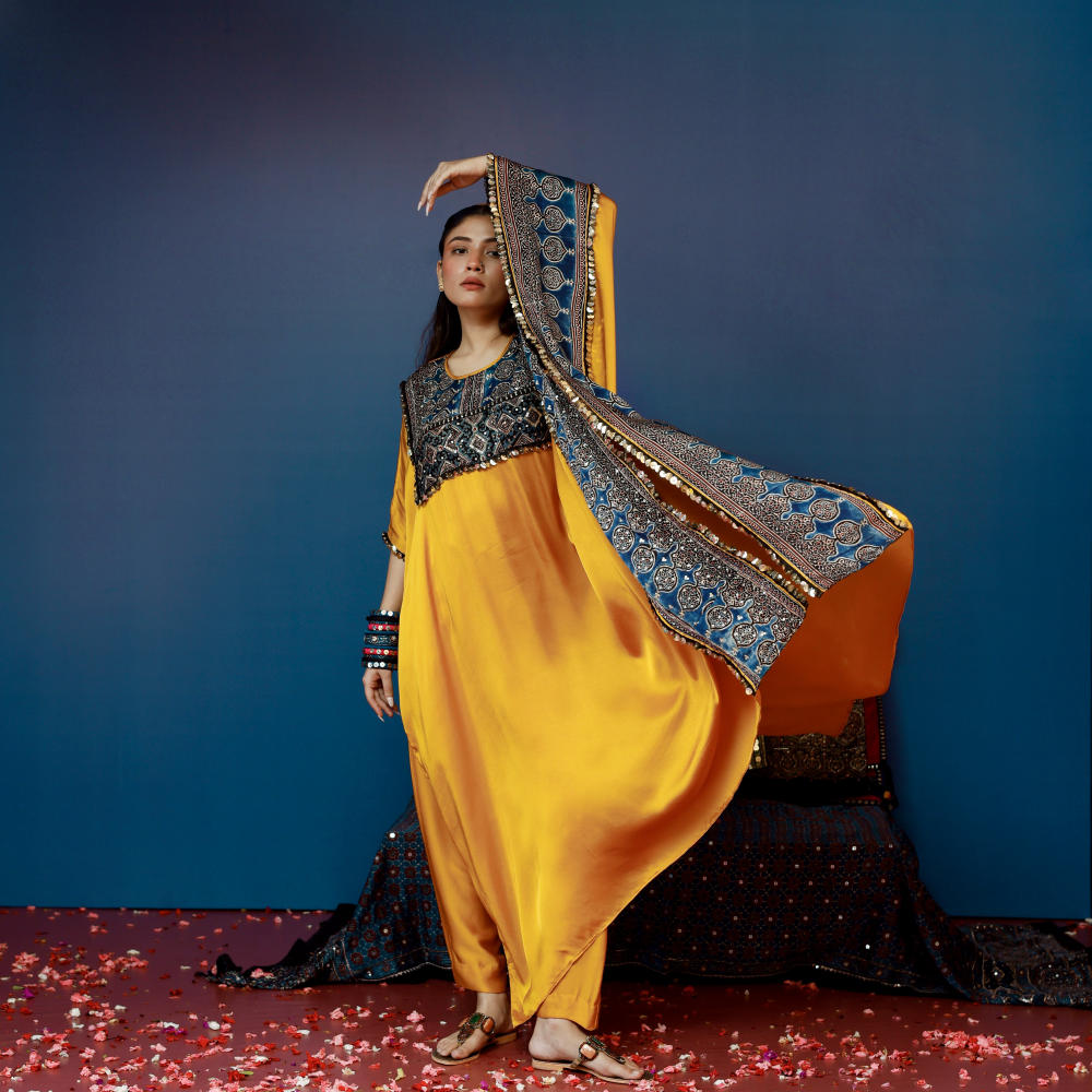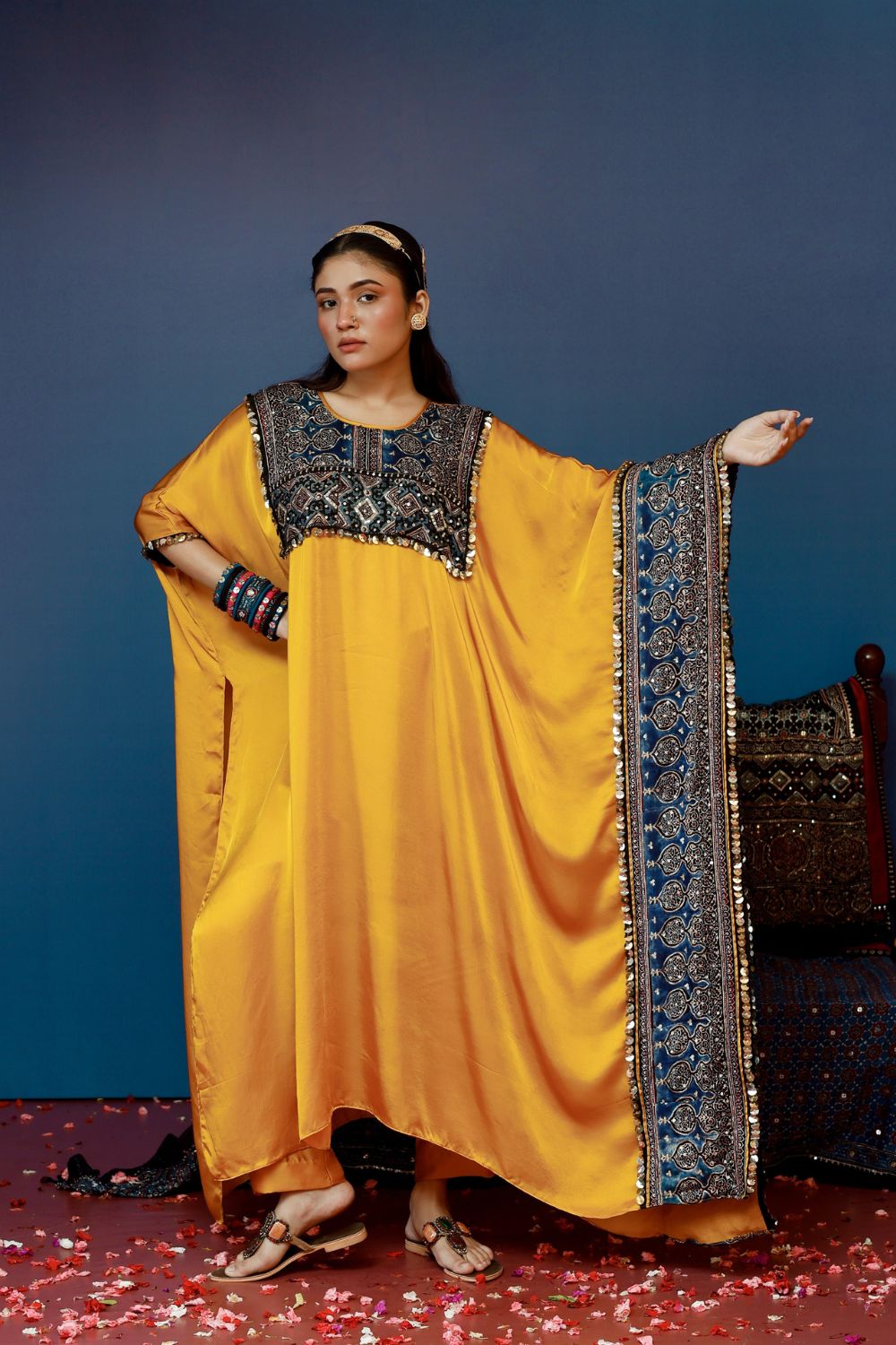 This mustard kaftan set features exquisite hand-embroidered Ajrakh applique and an extended droop for a unique dupatta-inspired style. The flowy silhouette and intricate craftsmanship make it a standout piece for any occasion. Paired with matching pants, it’s perfect for those seeking comfort and elegance in artisanal fashion.