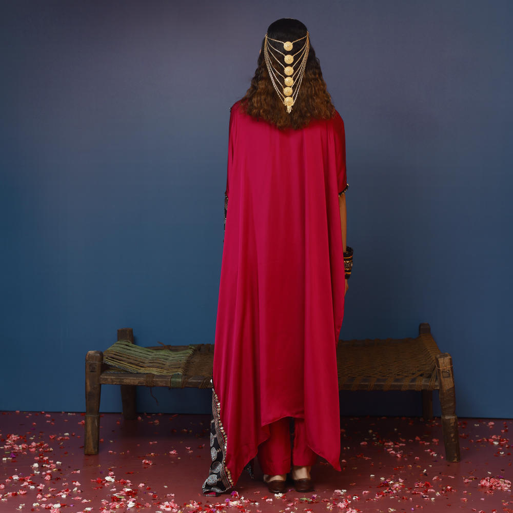 This pink kaftan set features exquisite hand-embroidered Ajrakh applique and an extended droop for a unique dupatta-inspired style. The flowy silhouette and intricate craftsmanship make it a standout piece for any occasion. Paired with matching pants, it’s perfect for those seeking comfort and elegance in artisanal fashion.