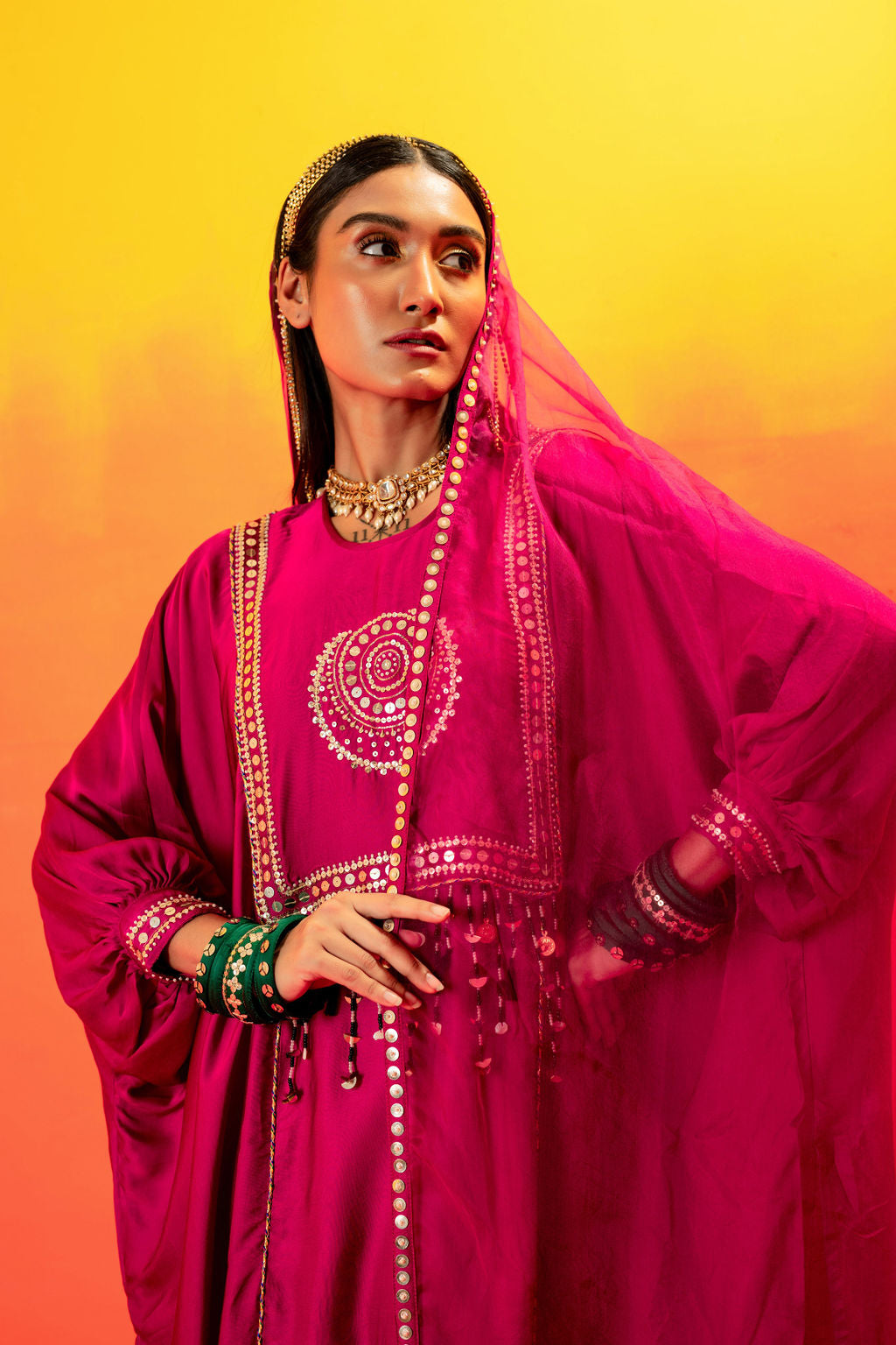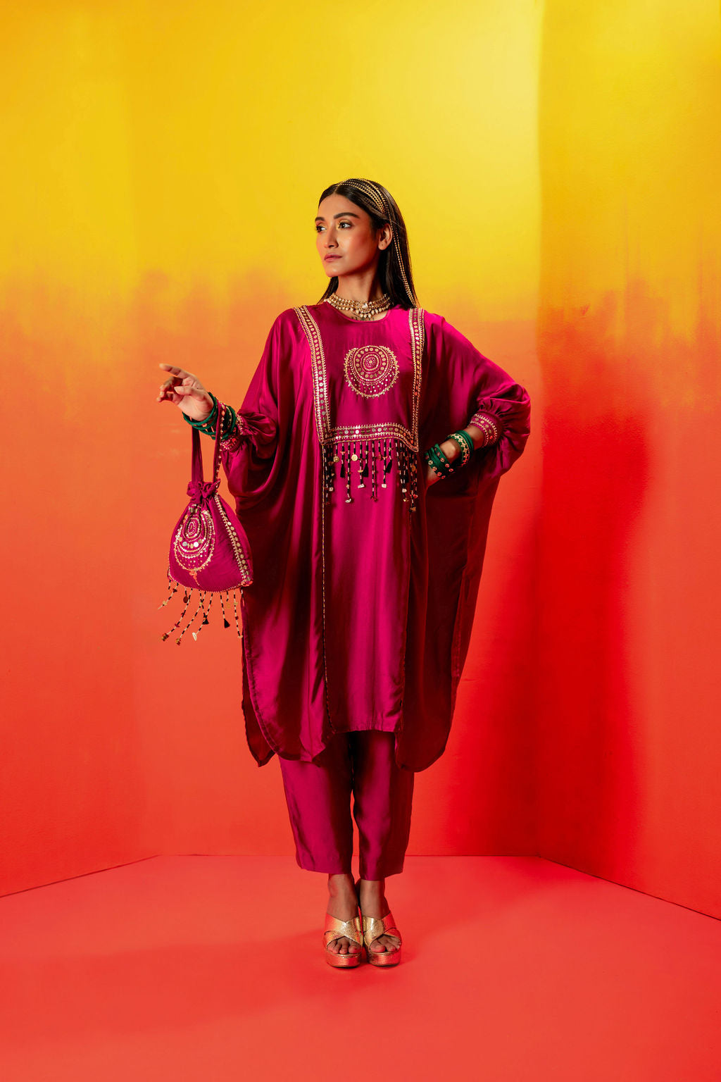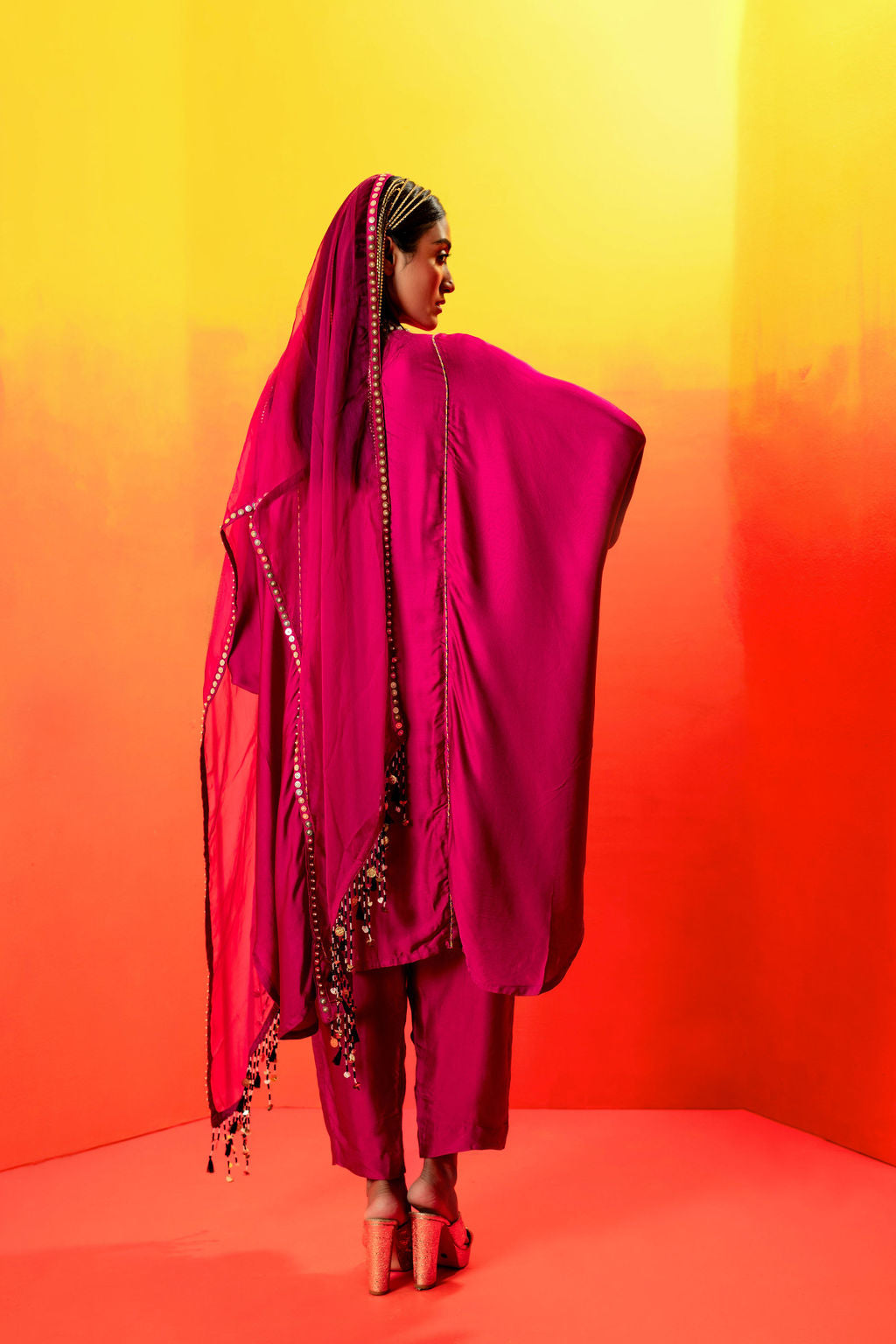 This anti-fit kurta and straight slim pants set in vegan satin features a stunning signature Luna motif for an ornamental touch. Designed with bat-style sleeves and enhanced by intricate hand embroidery with light gold sequins and pearl bead detailing, it is perfect for festive and pre-wedding occasions. The ensemble is completed with an organza silk dupatta, adorned with all-rounded, originally designed sequin lace and handcrafted beaded tassels
