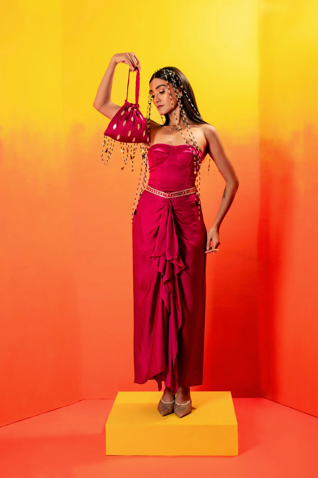 Experience the perfect blend of simplicity, chic elegance, and trendy style with this fitted corset-style blouse paired with a ruffled skirt. Enhanced with intricate hand embroidery at the waist, this outfit offers versatile styling options