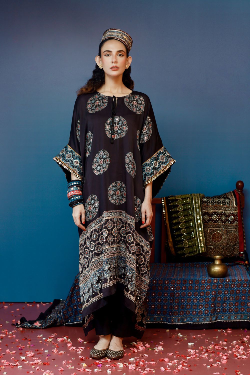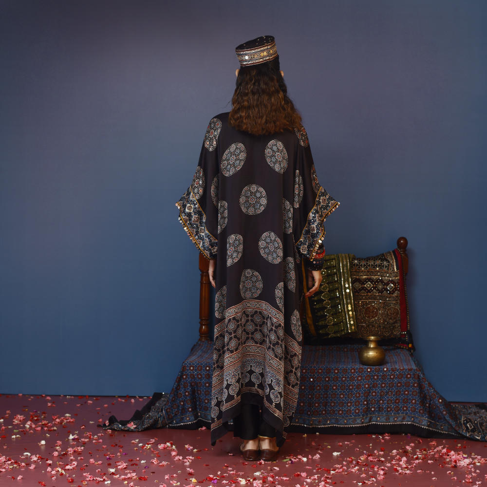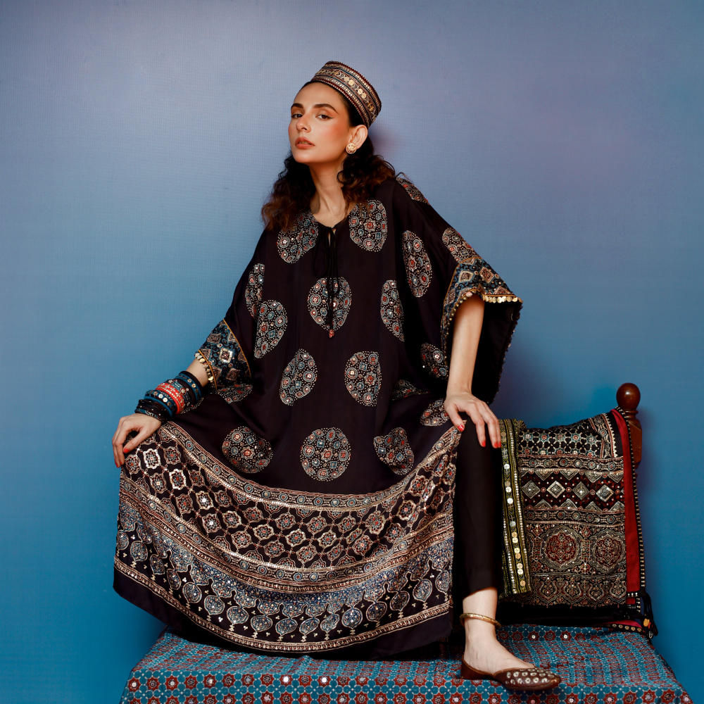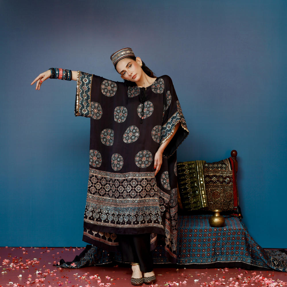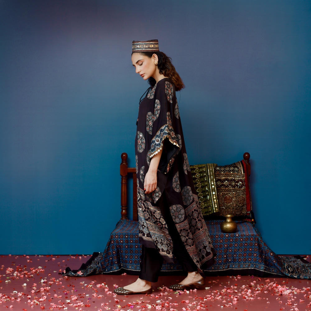 Elegant organic black Ajrakh kaftan set with hand embroidery, paired with slim pants. Lightweight, stylish, and perfect for pre wedding ocassions.