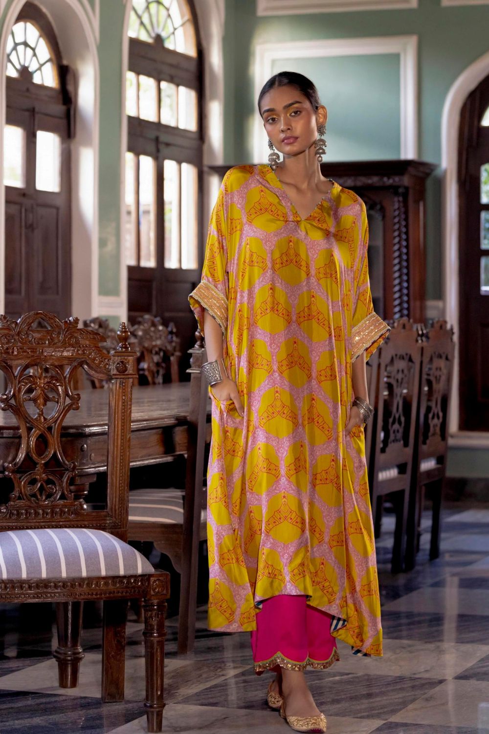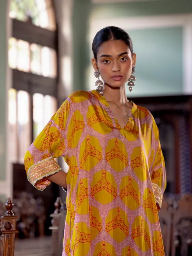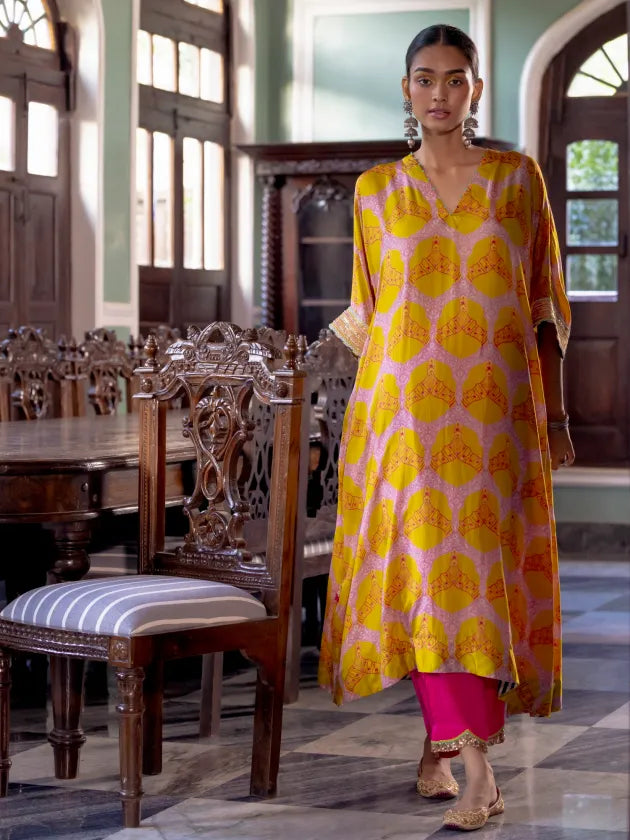 Yellow printed silk kaftan kurta with intricate hand embroidered sleeves paired with Hot Pink modal satin palazzo with scalloped embroidery.