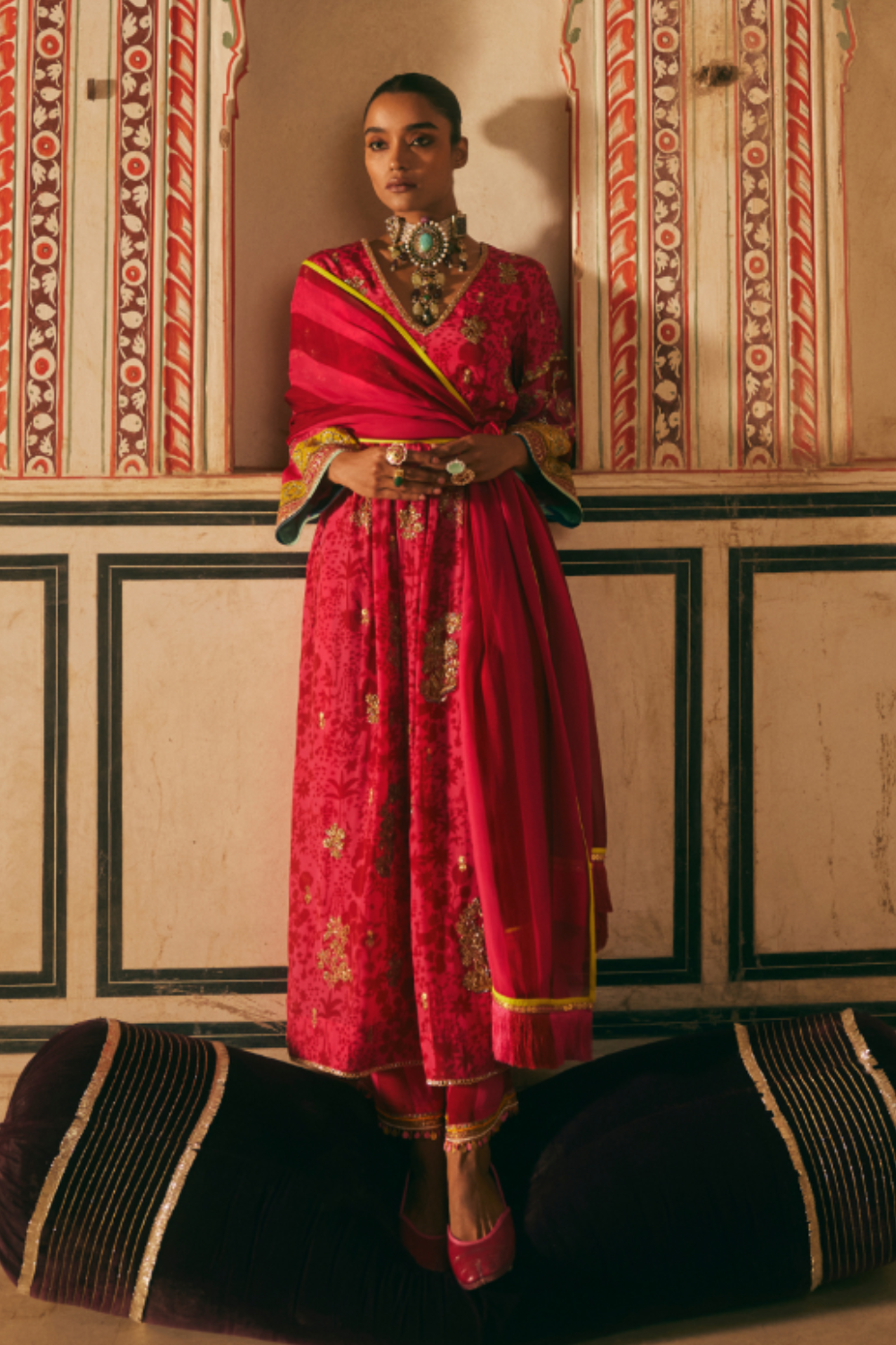 Dive into elegance with our Hotpink -Red crepe kurta set, featuring intricate shadow print and all over hand embroidered Kurta for an aura of grace and sophistication. The heavy embroidery on sleeves elevates its charm , paired with embroidered stripe palazzo and a fringe organza dupatta. This ensemble is a stunning fusion of tradition and modernity making a perfect style statement.