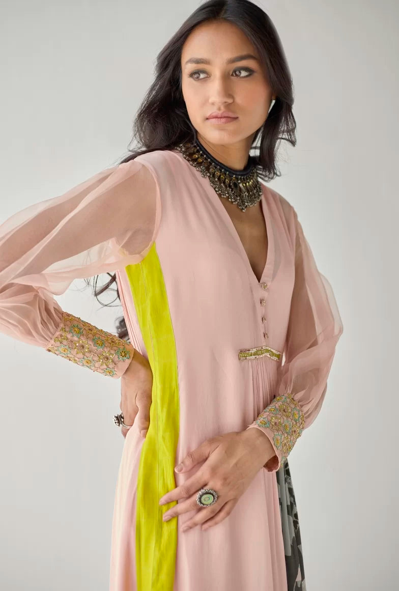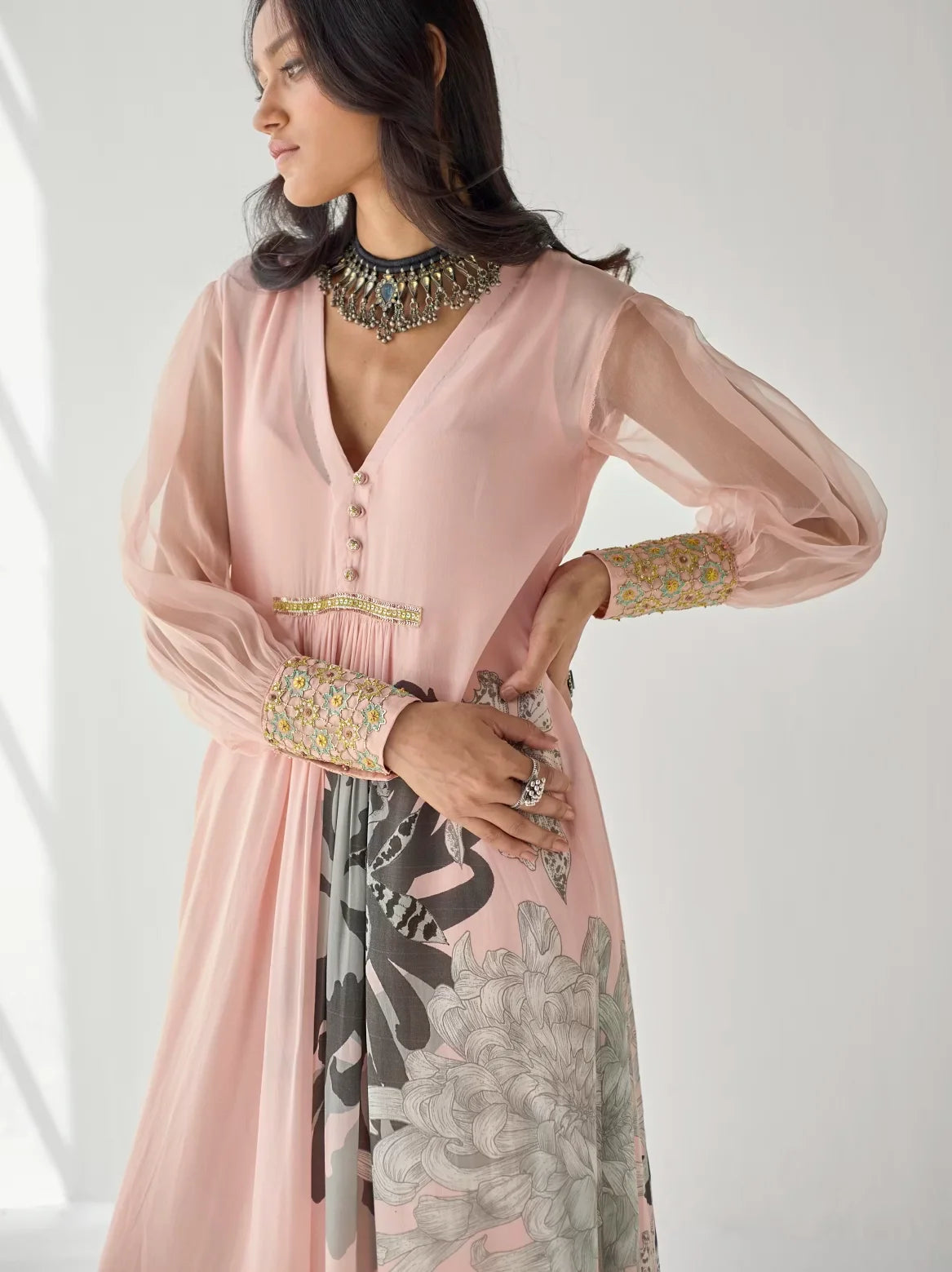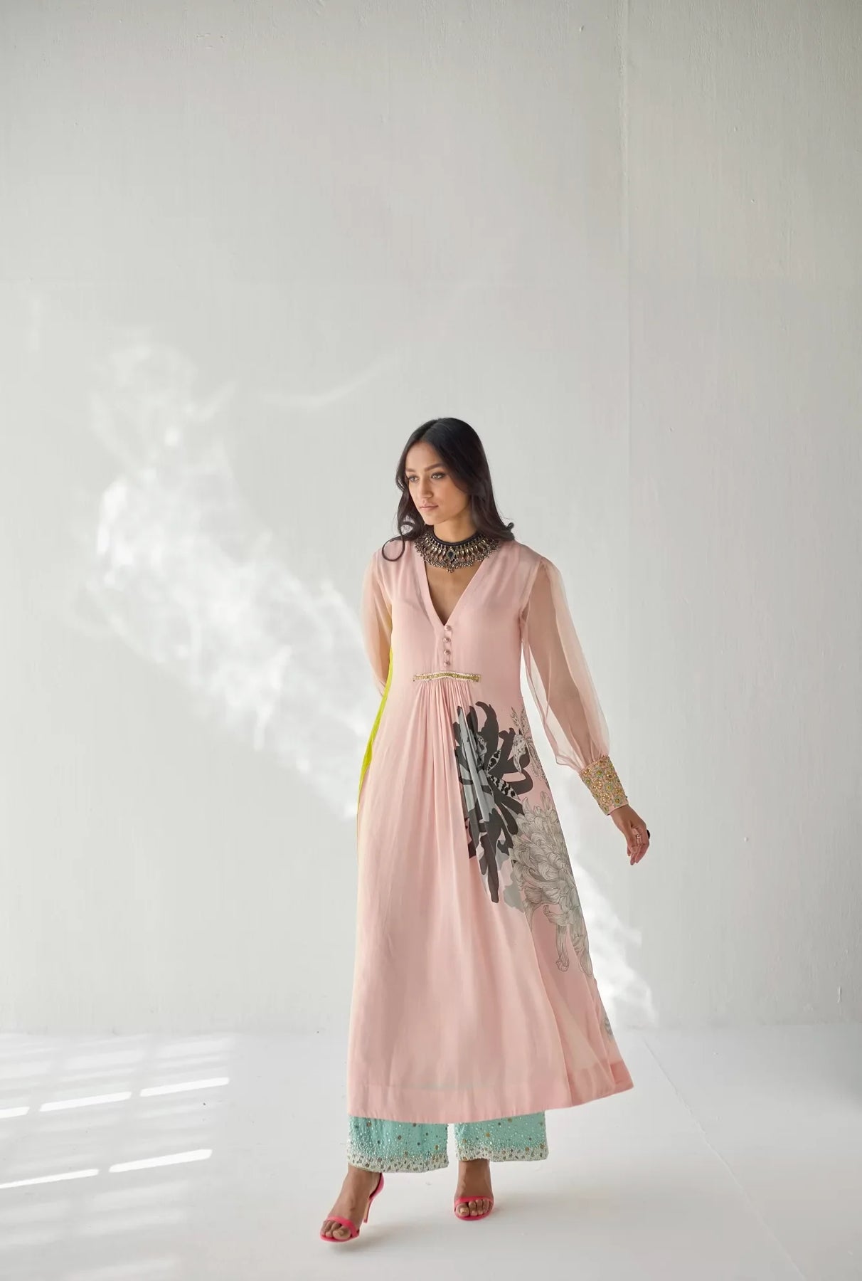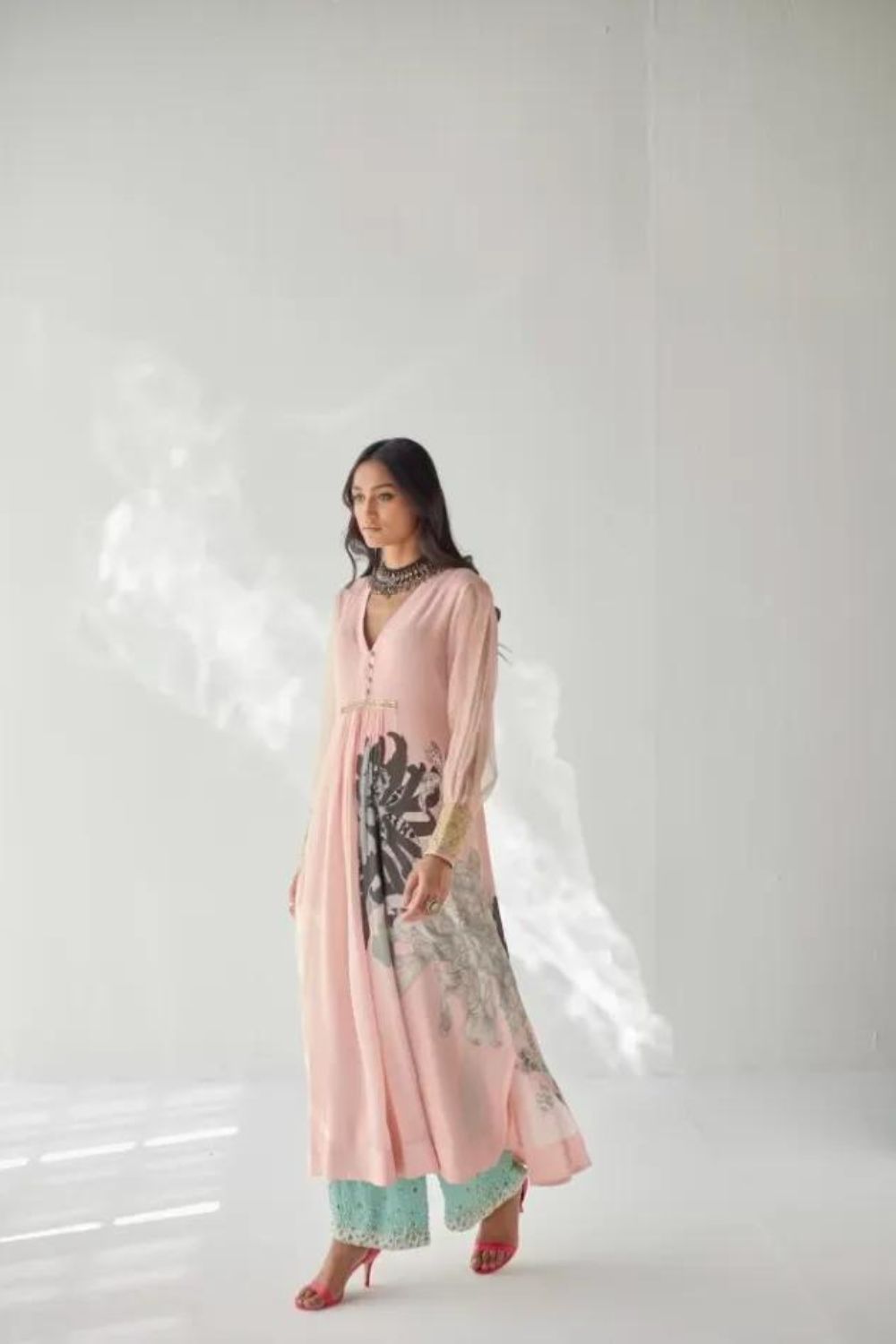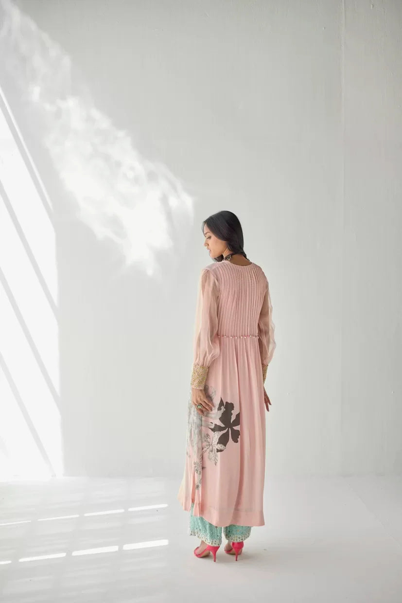 Nude Pink printed crepe front puckering kurta with hand embroidered cuffs and pintucks detailing on back. Paired with Dreamy Blue pearl hand embroidered palazzo.