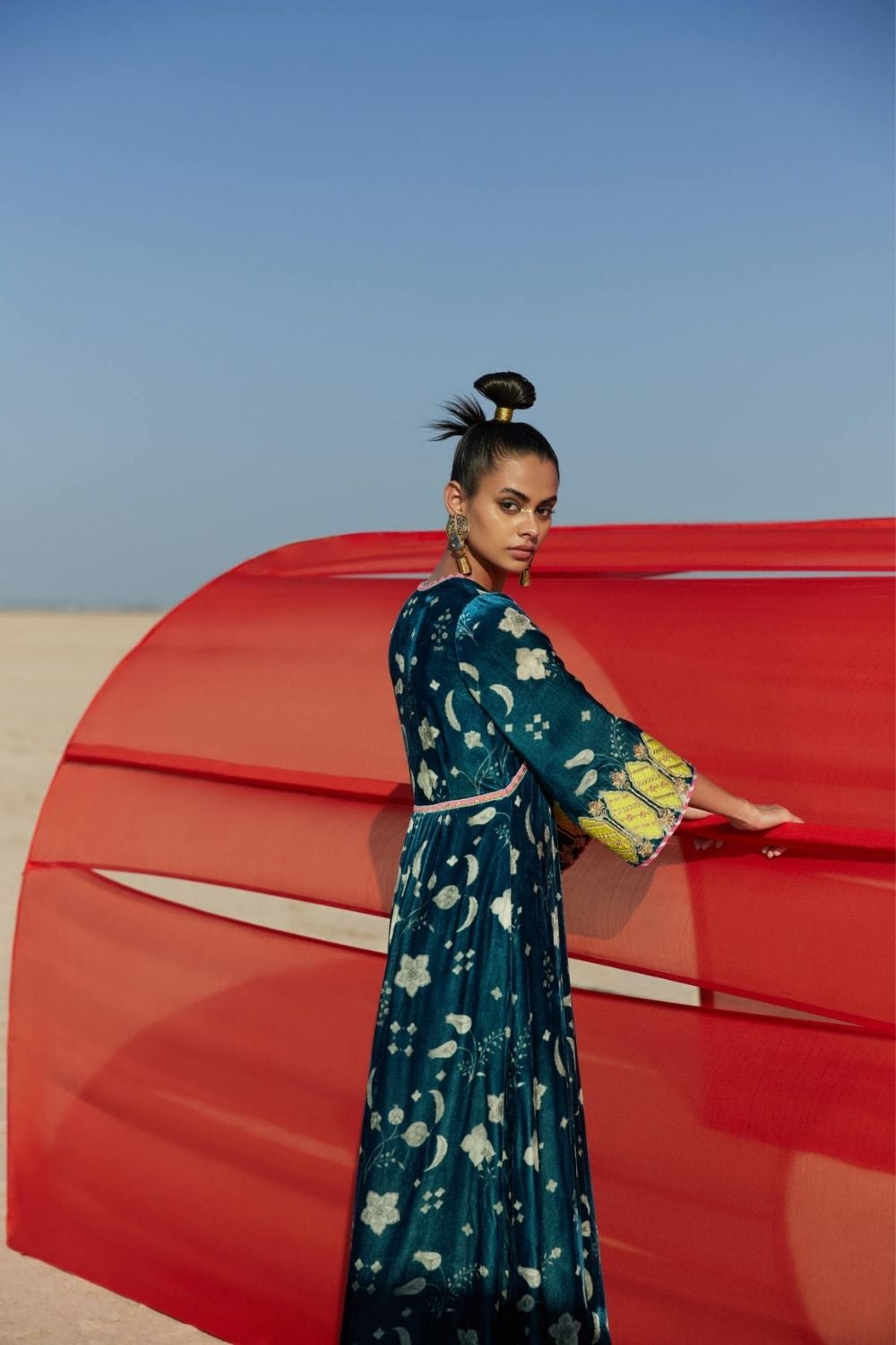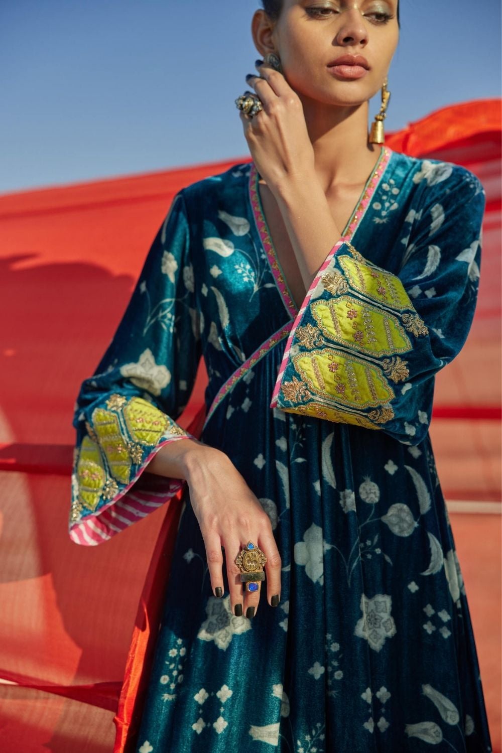 TEAL BLUE PRINTED BELL SLEEVE SILK VELVET KURTA SET Fashion Rajiramniq