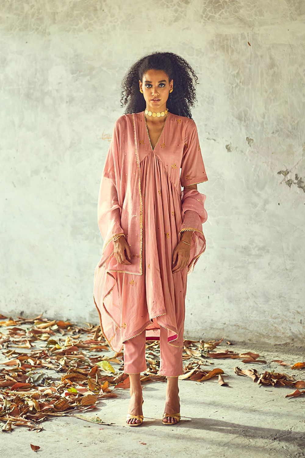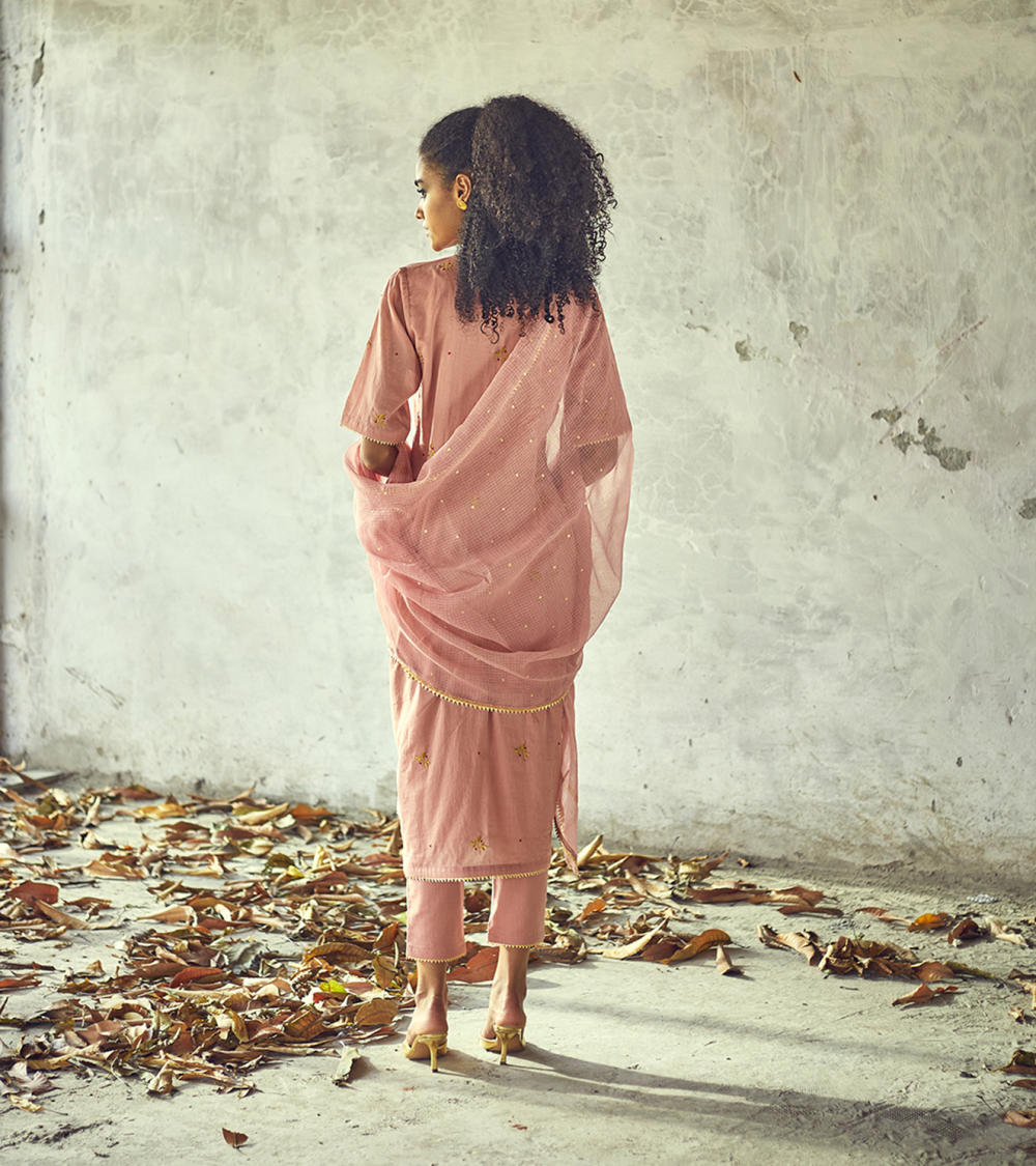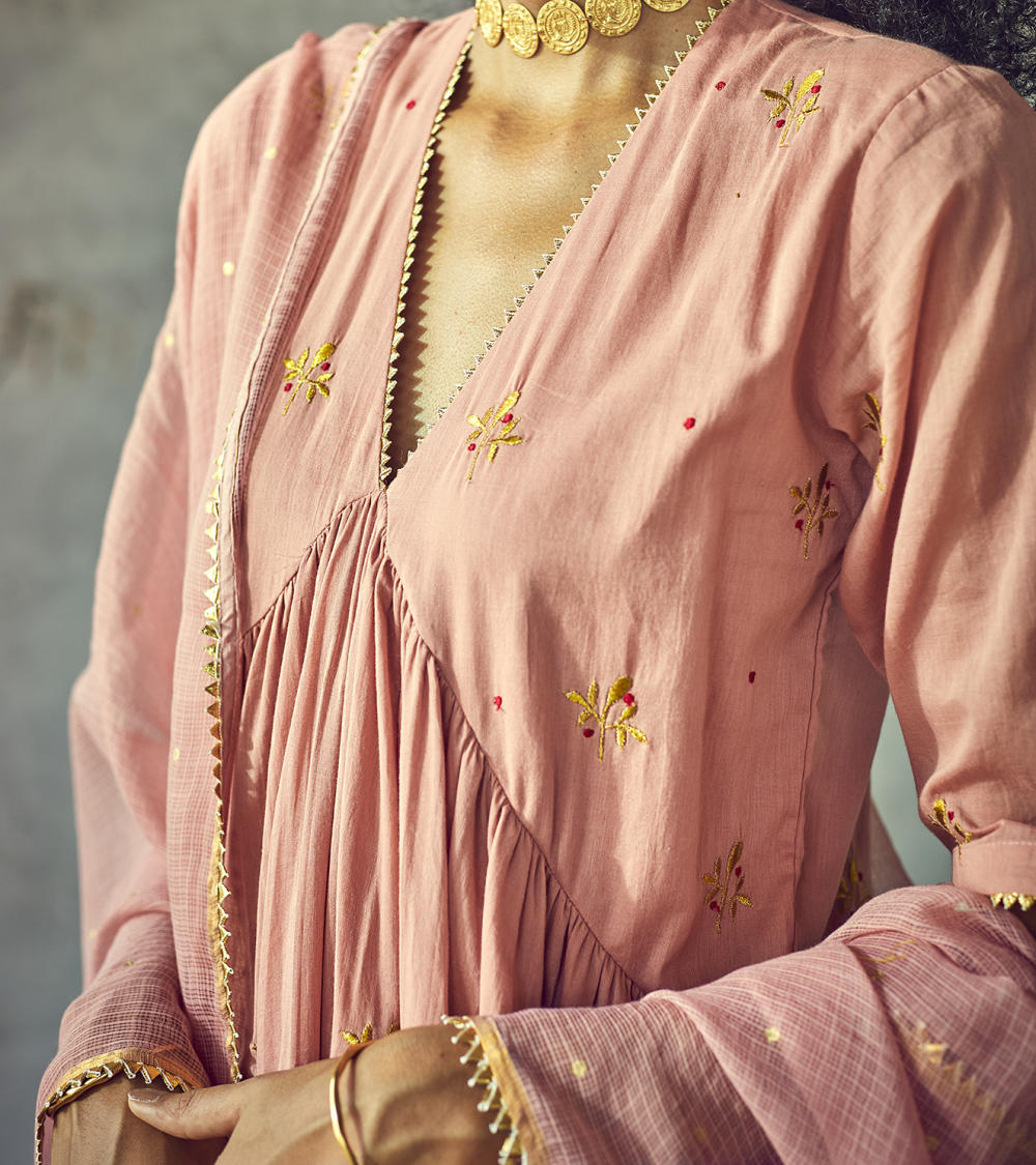 Handcrafted in pure cotton, our kamal poshak comes with an asymmetric hemline kurta, embroidered with gold and pink floral motif and plum peek-a-boo detailing across the hemline. Paired with straight fit mul pants and gold splashed polka kota doria dupatta. delicate hints of gold gota finishing can be seen all across the outfit.