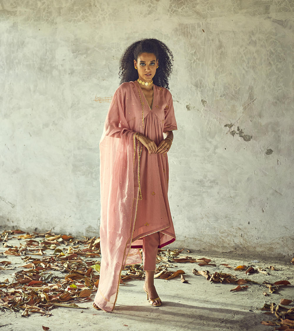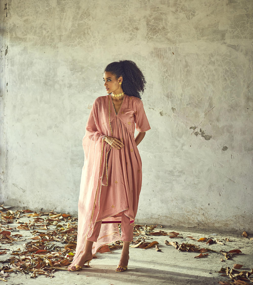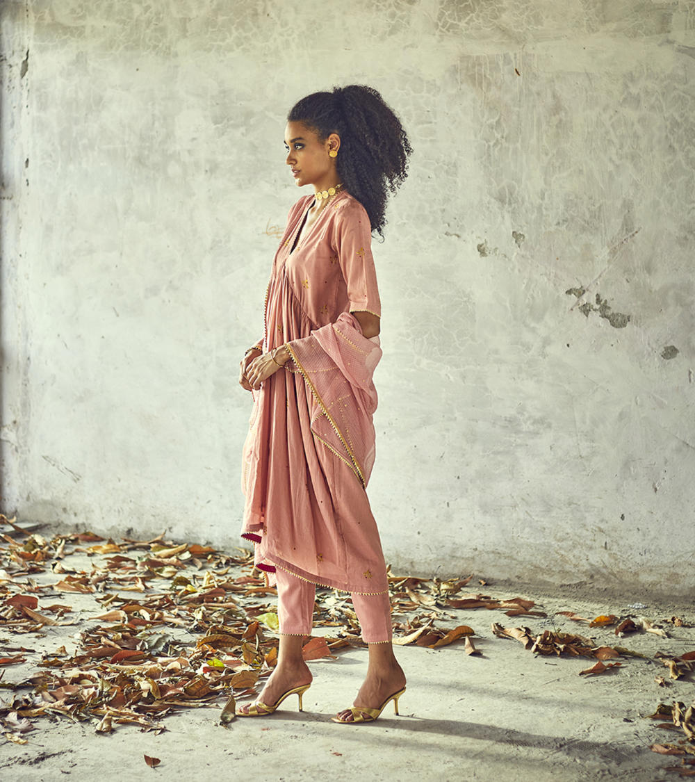 Handcrafted in pure cotton, our kamal poshak comes with an asymmetric hemline kurta, embroidered with gold and pink floral motif and plum peek-a-boo detailing across the hemline. Paired with straight fit mul pants and gold splashed polka kota doria dupatta. delicate hints of gold gota finishing can be seen all across the outfit.