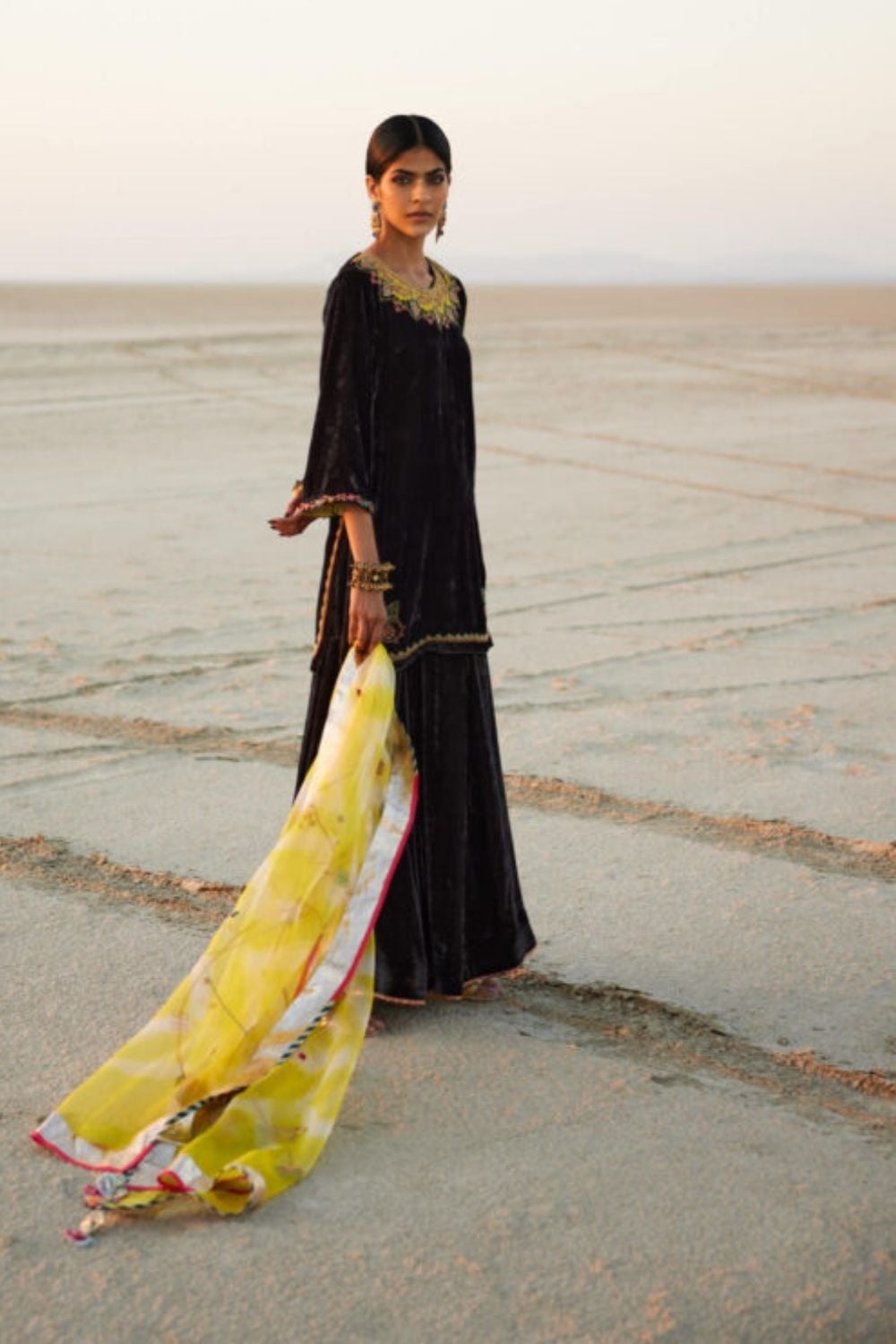 Charcoal black silk velvet kurta with intricate hand embroidery on neck, sleeves, ghera and back butta along with gharara with gotta detailed hemline. It is paired with lime tie n dye organza hand embroidered jaal dupatta with silk n gotta finish.