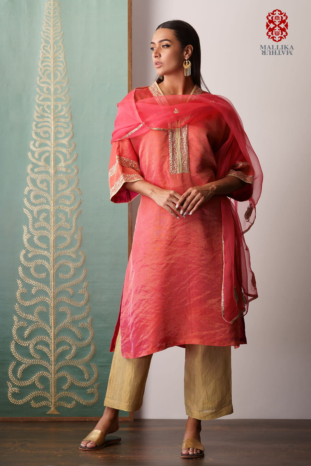 Coral orange kora dupatta hand embroidered in gold zari dabka and zardosi adorned with dancing leaf motifs to enhance the border.
