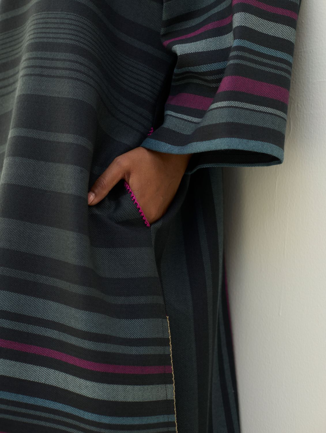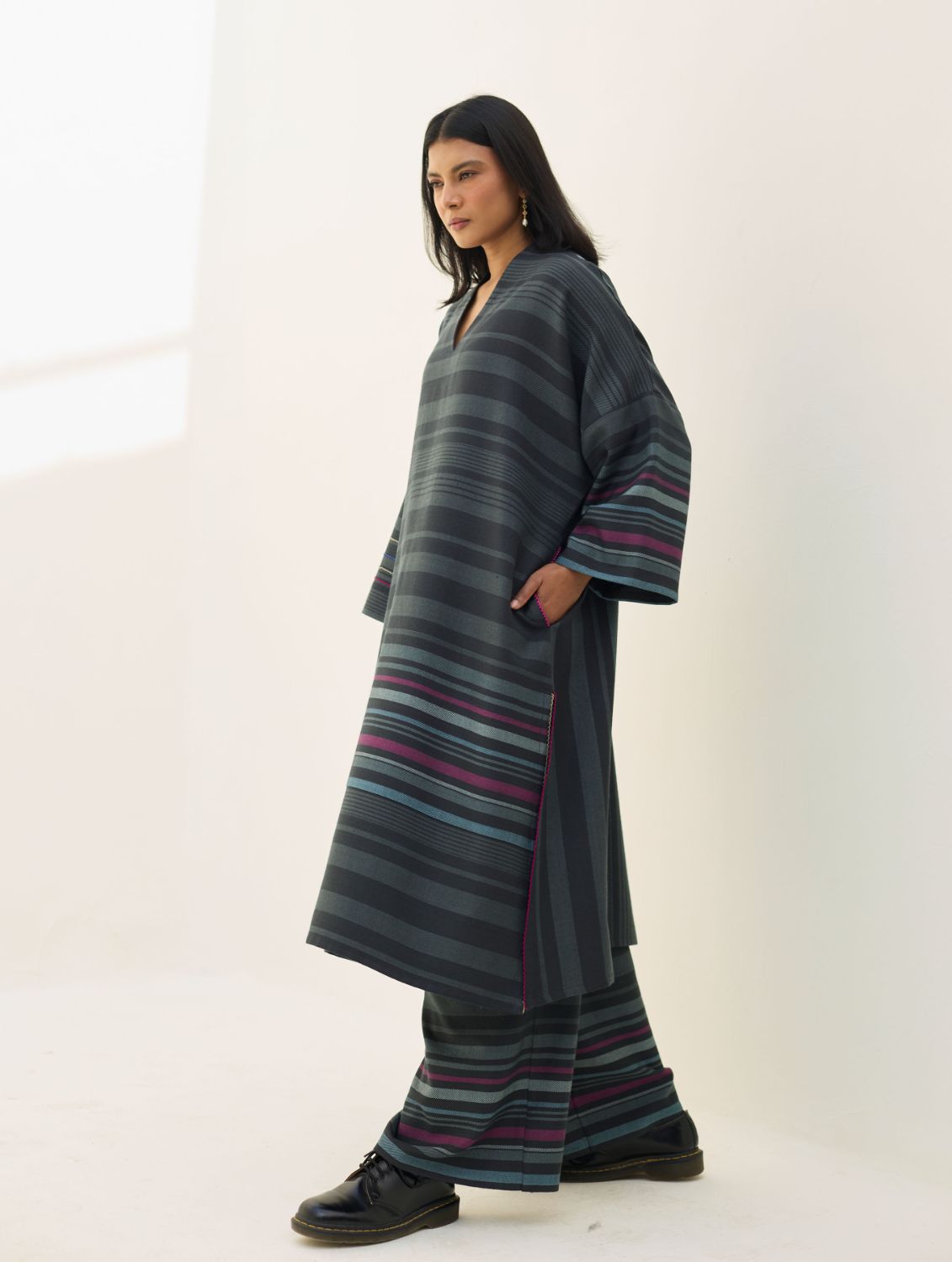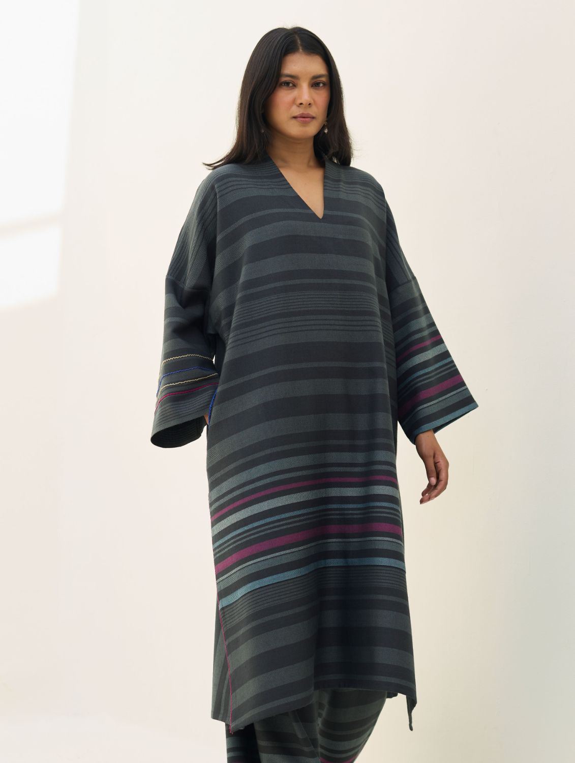Kurta- The Anette Pheran Kurta is handcrafted in our Merino wool fabric woven in a two-toned check pattern with a vibrant multi-coloured striped border. Designed in a relaxed fit, with a soft V-neckline, drop shoulders, and wool-lined side pockets for everyday ease and functionality. Accentuated with delicate picoting details on sleeves with long side-slits and intricate texture hand-stitch knotting along the pockets. Elevated yet effortless, the Annette pheran brings together comfort, structure, and warmth.