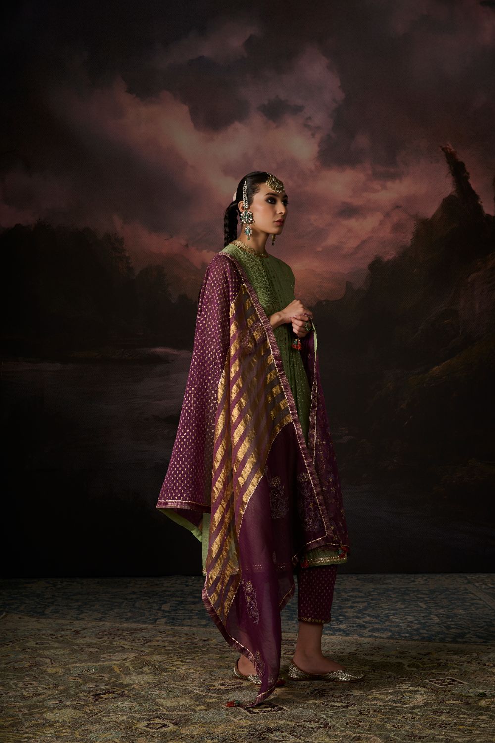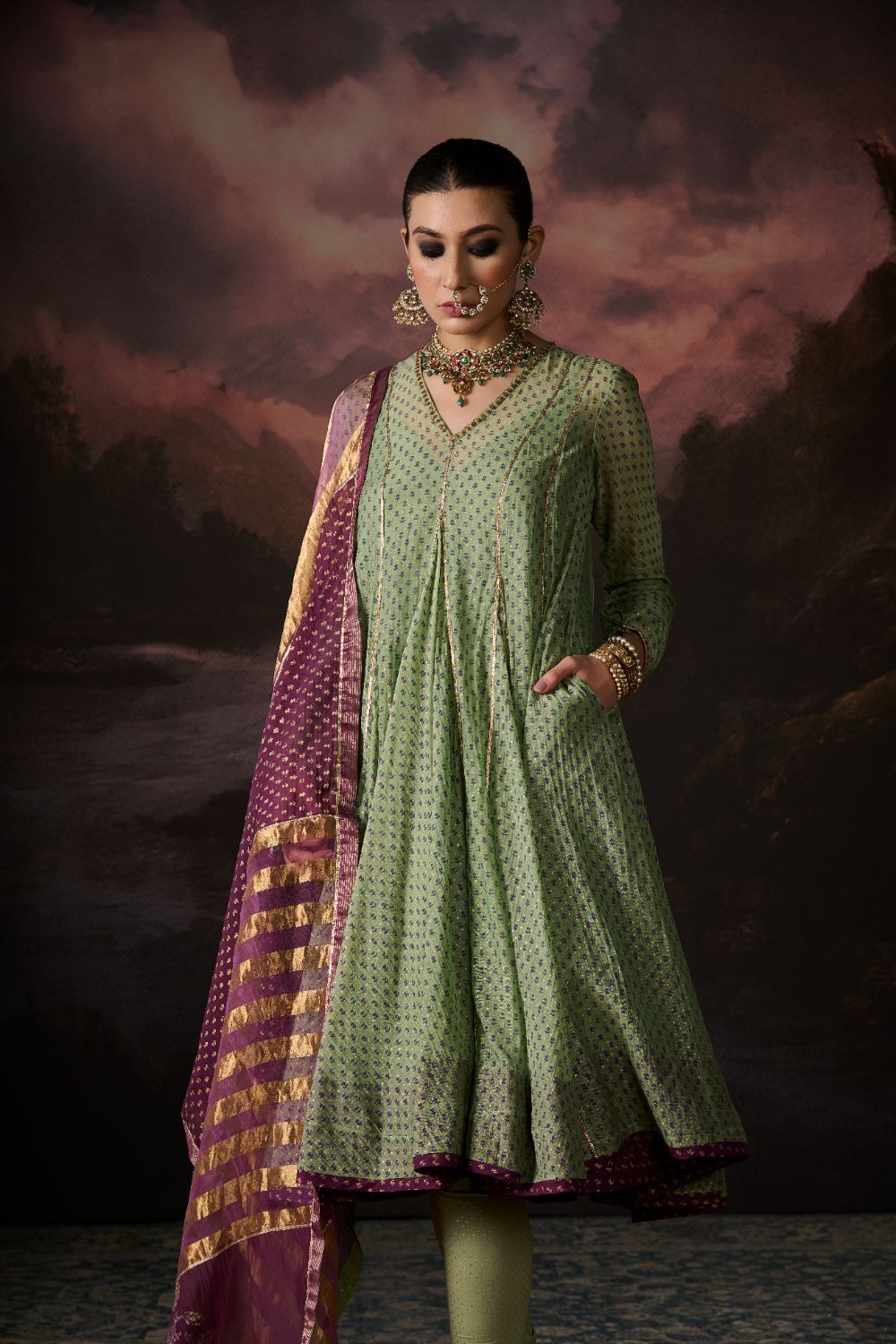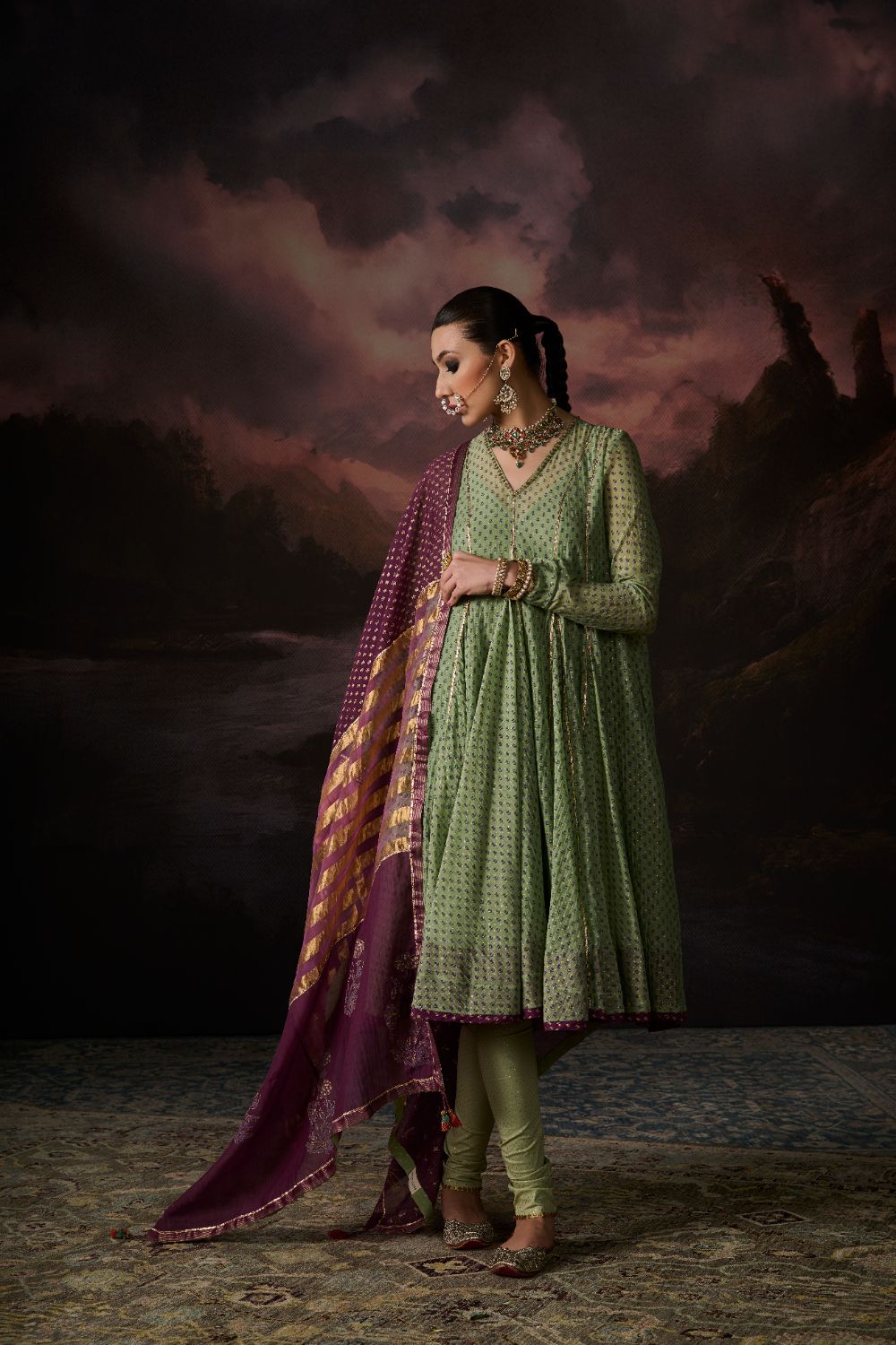 Her Chanderi carries its signature translucence and soft sheen, but with a subtlety that feels almost ethereal — printed slowly, consciously, through hand block printing that heightens the fabric's inherent delicacy.