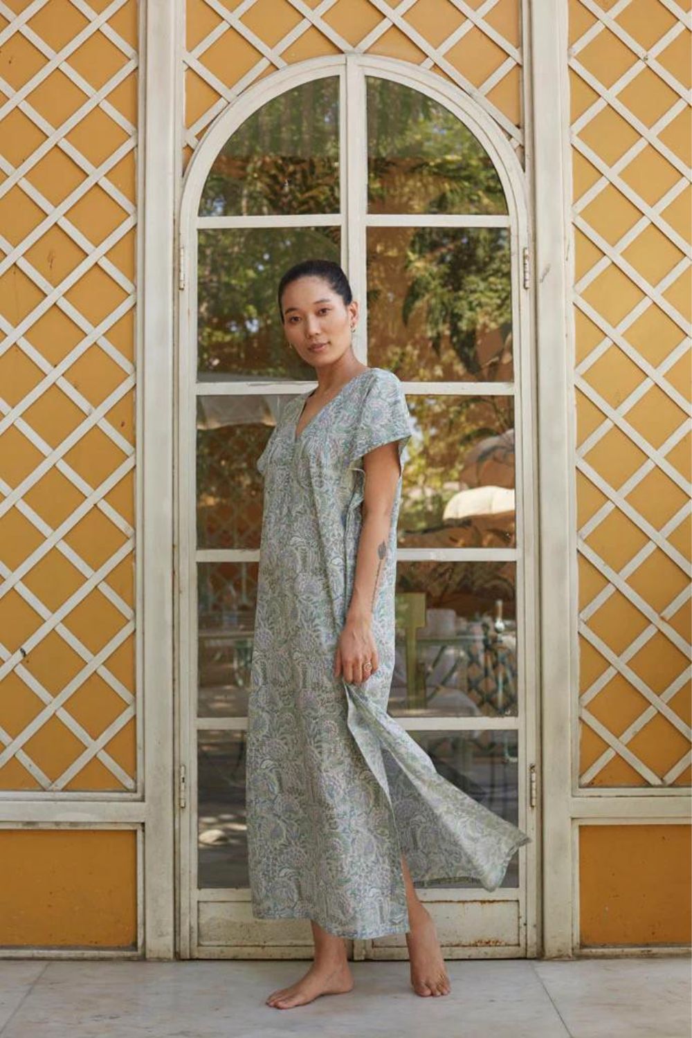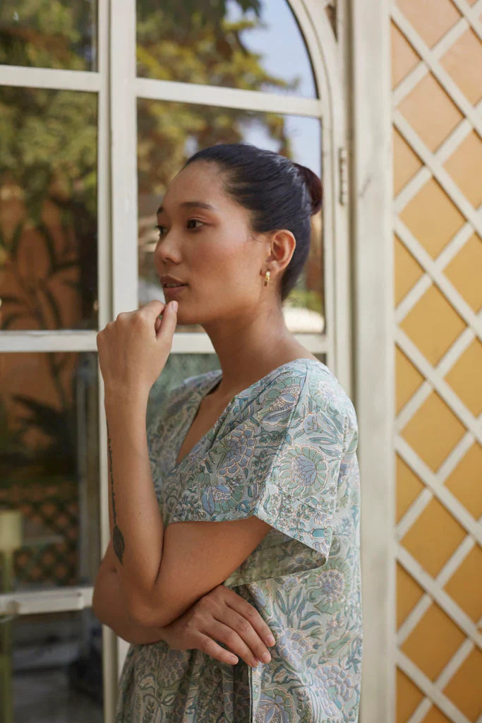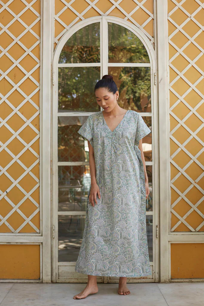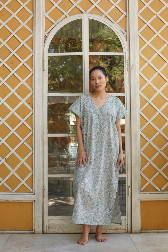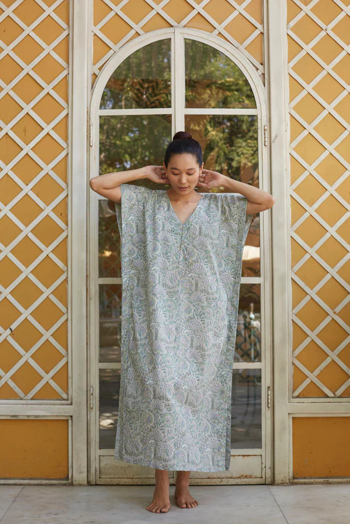Hand printed kaftaan ,in cotton mulmul with a belted waist.All our