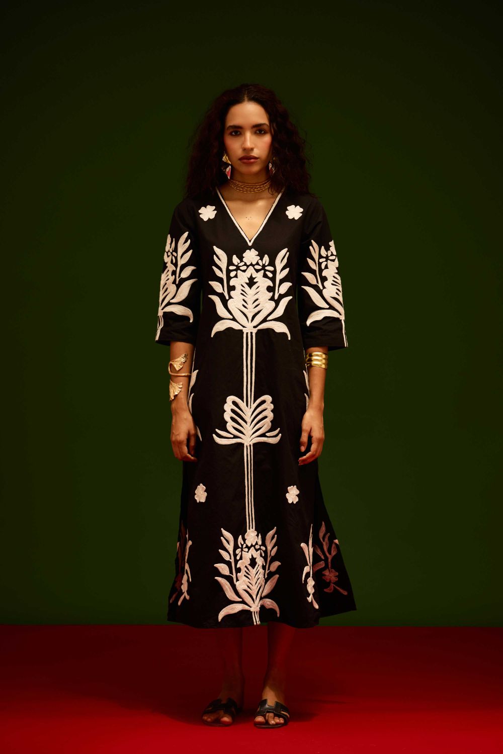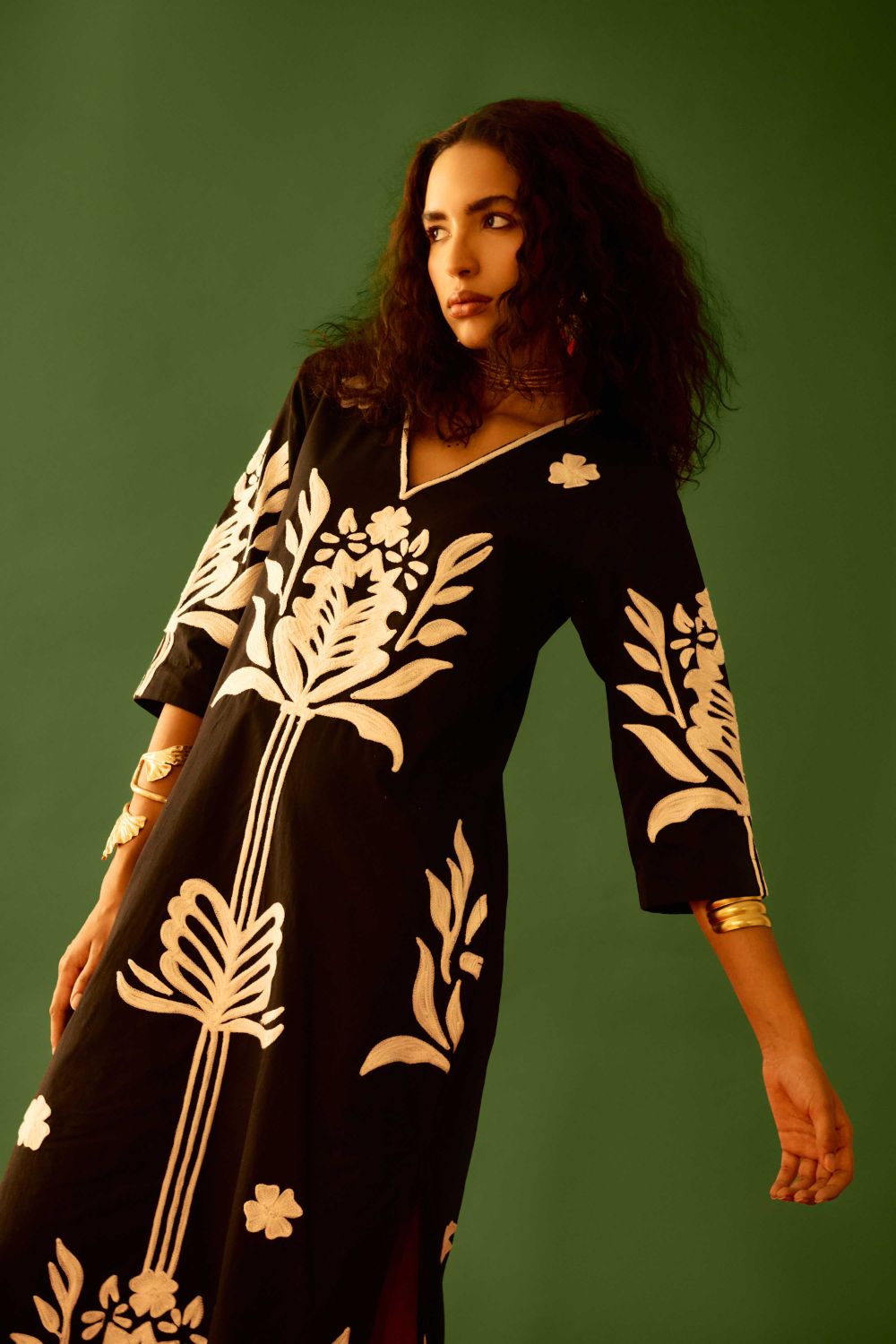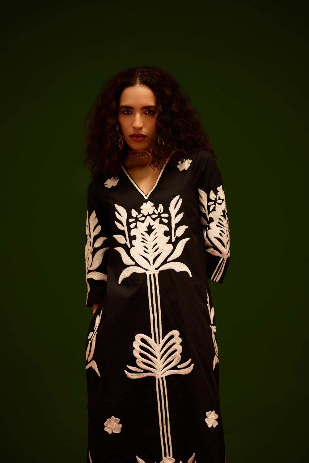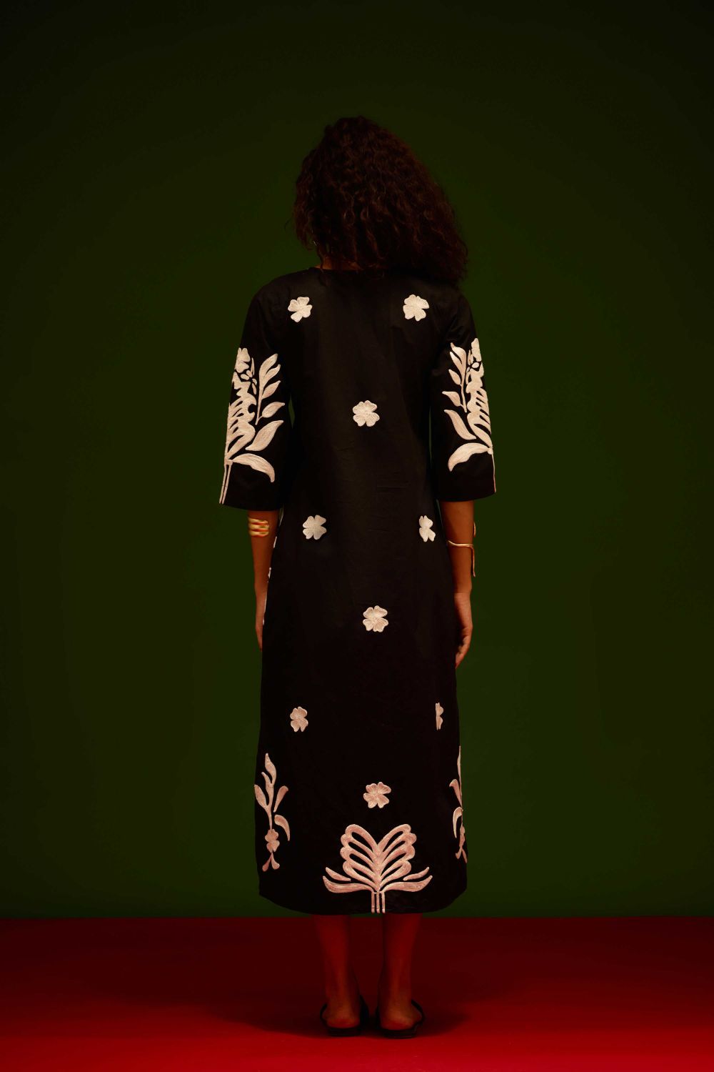 Black Cotton Maxi Dress with Ivory Tulip Thread Embroidery