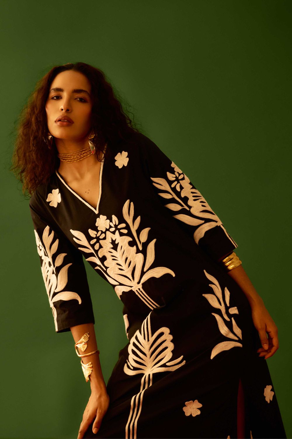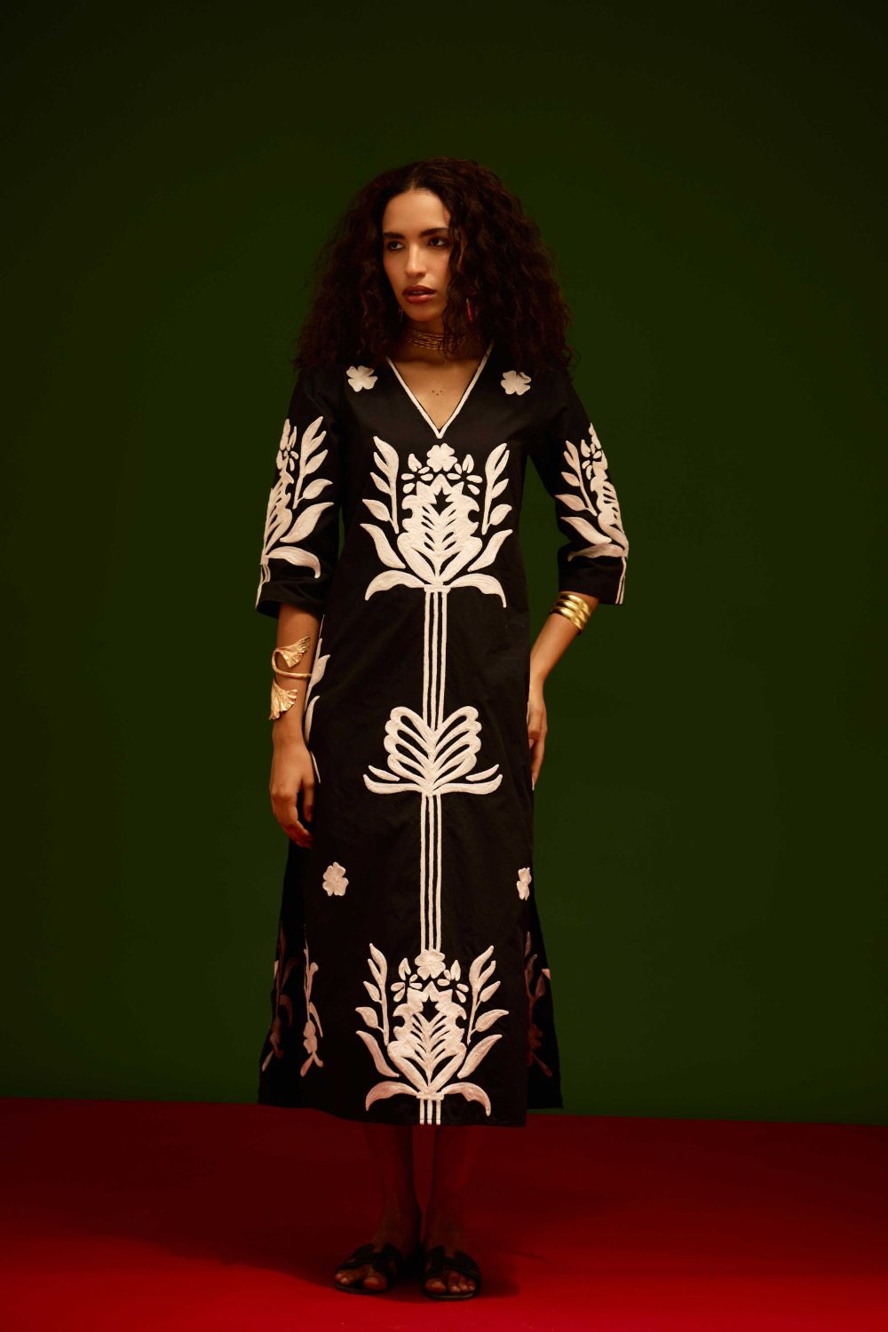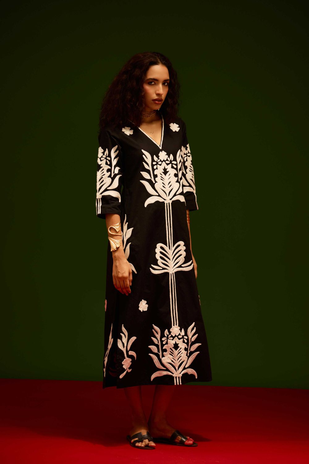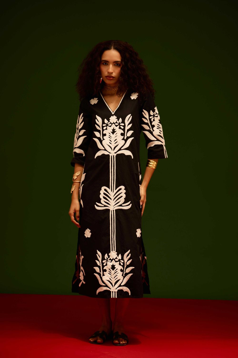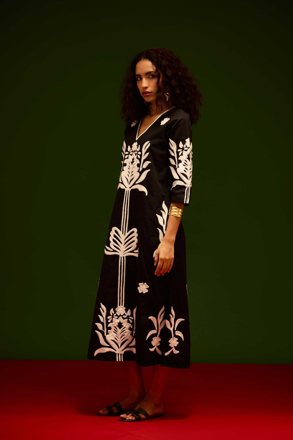 Black Cotton Maxi Dress with Ivory Tulip Thread Embroidery