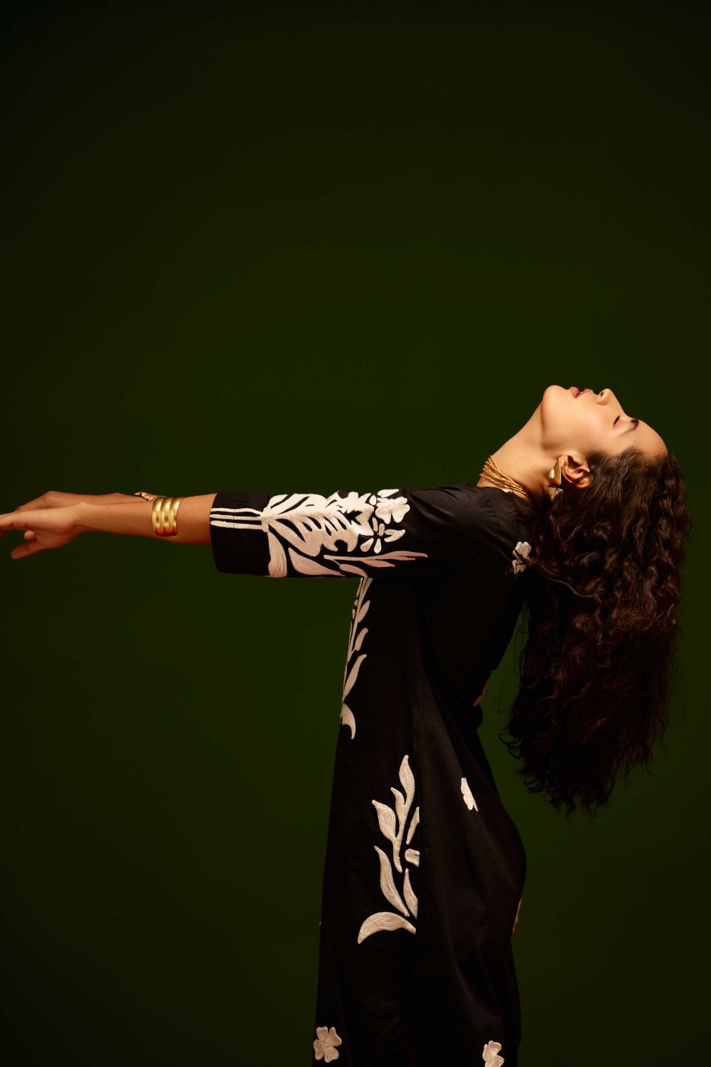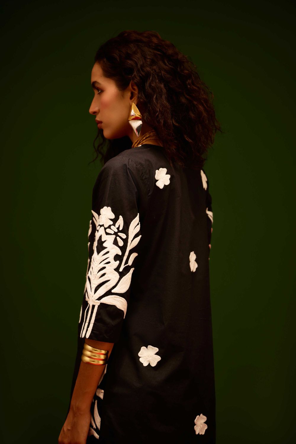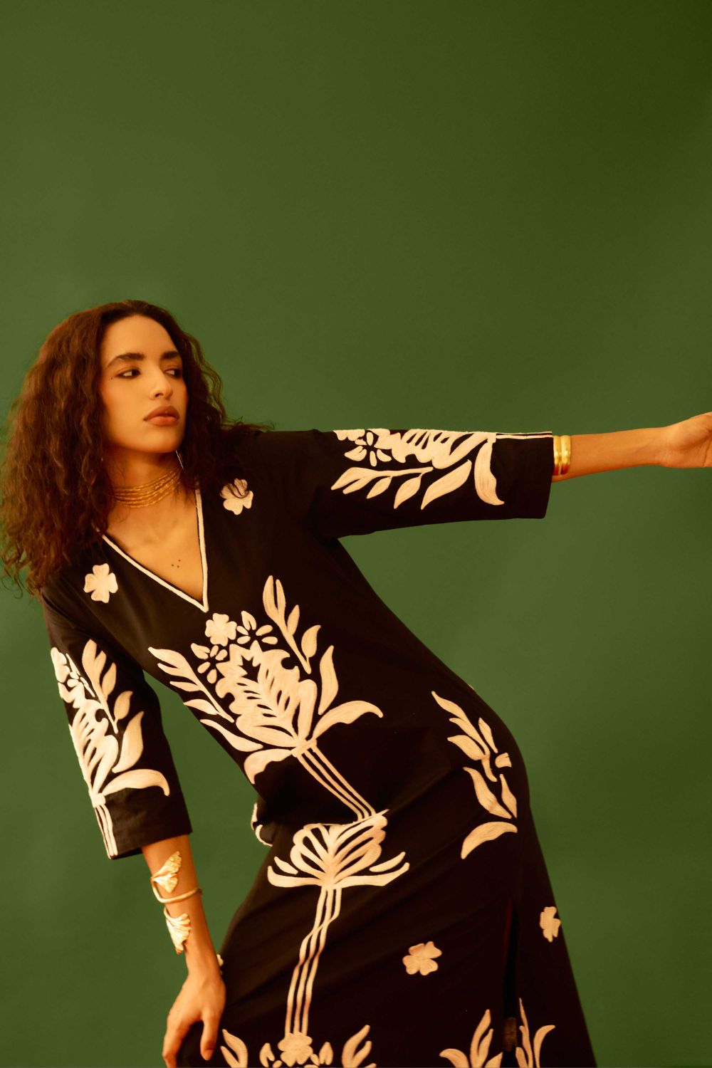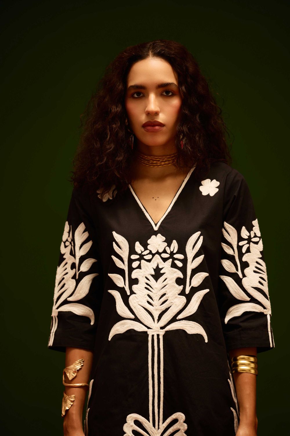 Black Cotton Maxi Dress with Ivory Tulip Thread Embroidery