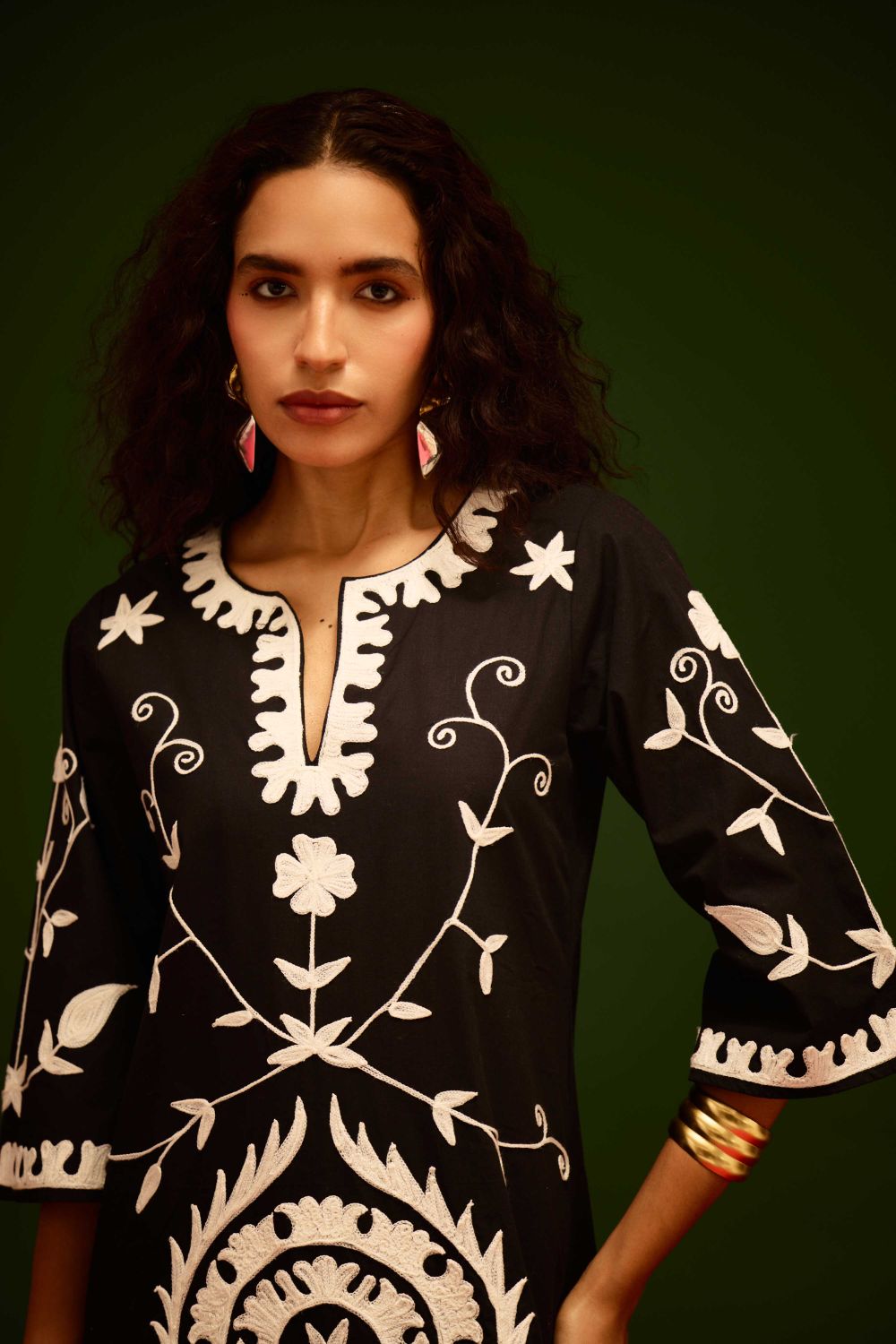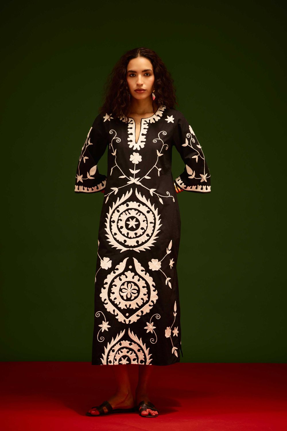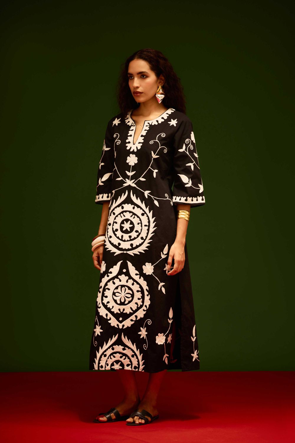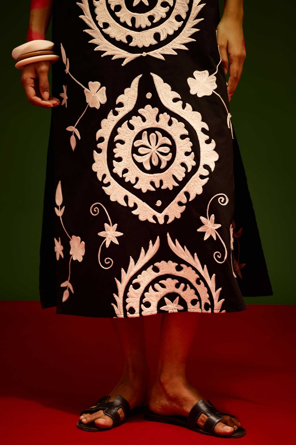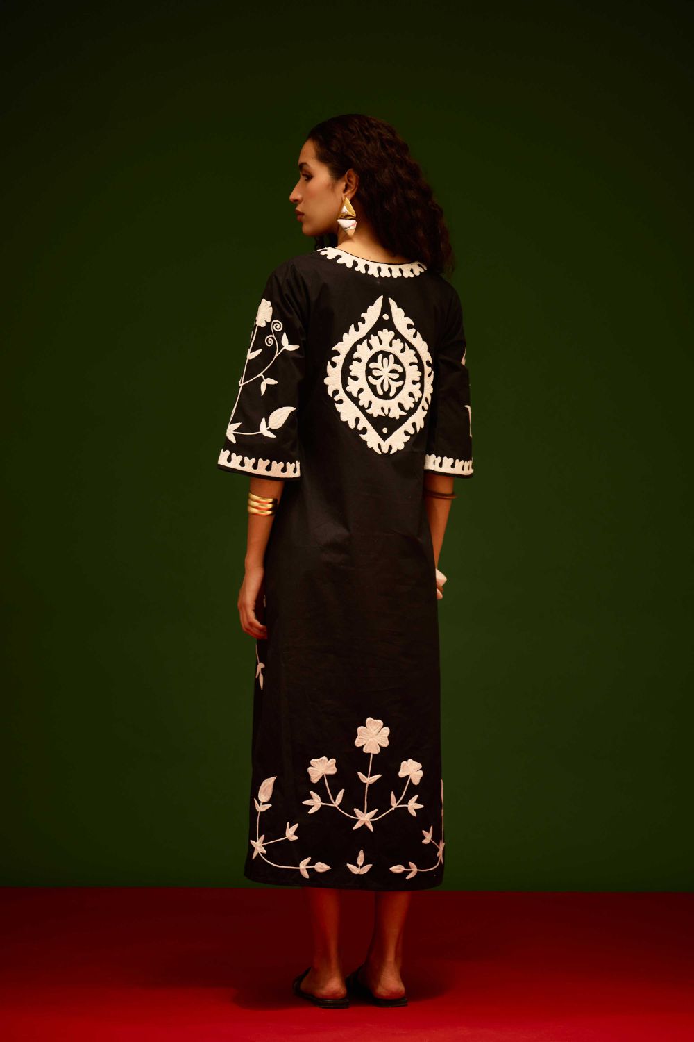 Black Cotton Maxi Dress with Ivory Wave Thread Embroidery