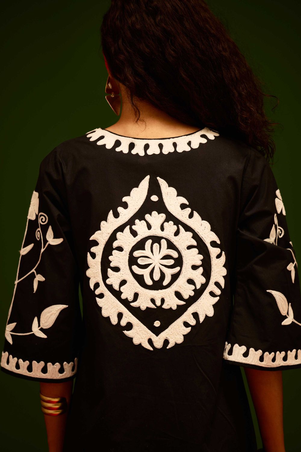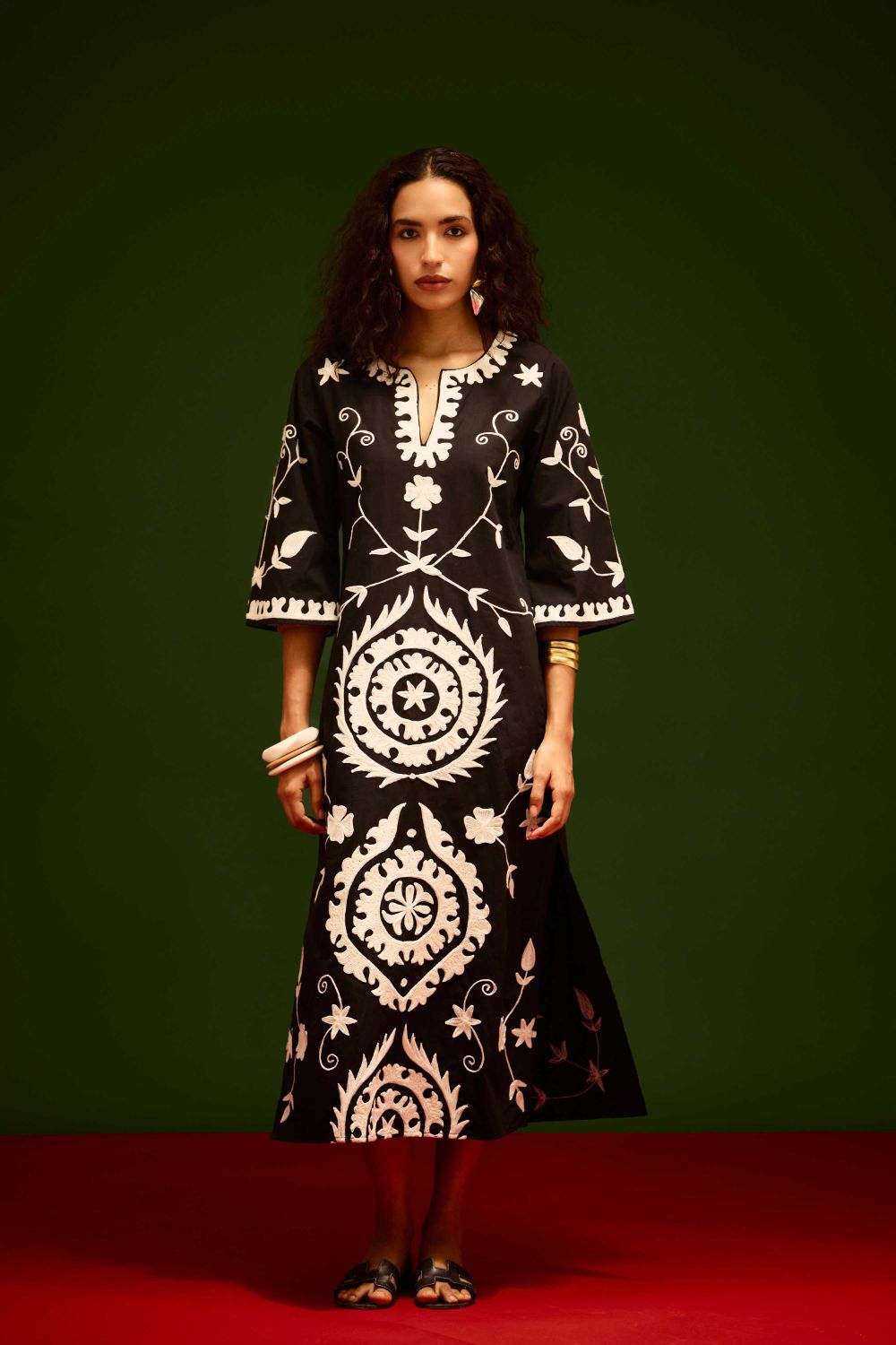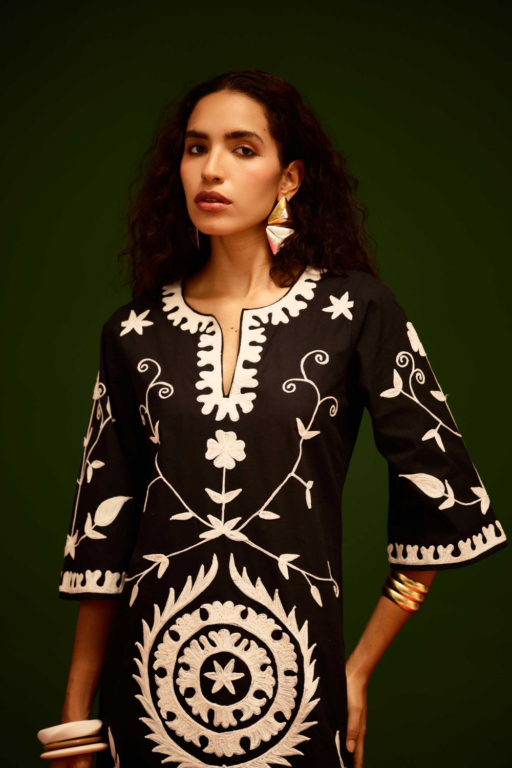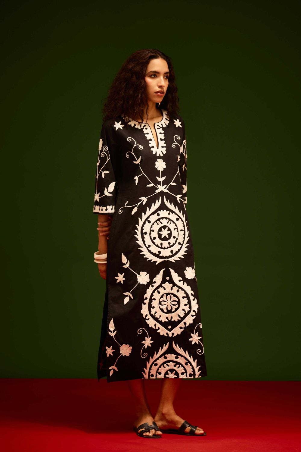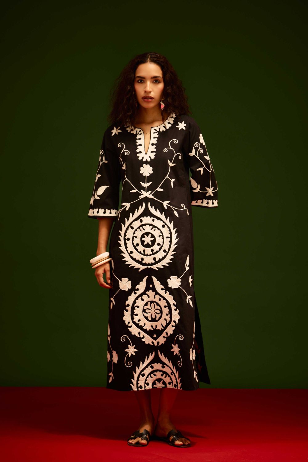 Black Cotton Maxi Dress with Ivory Wave Thread Embroidery