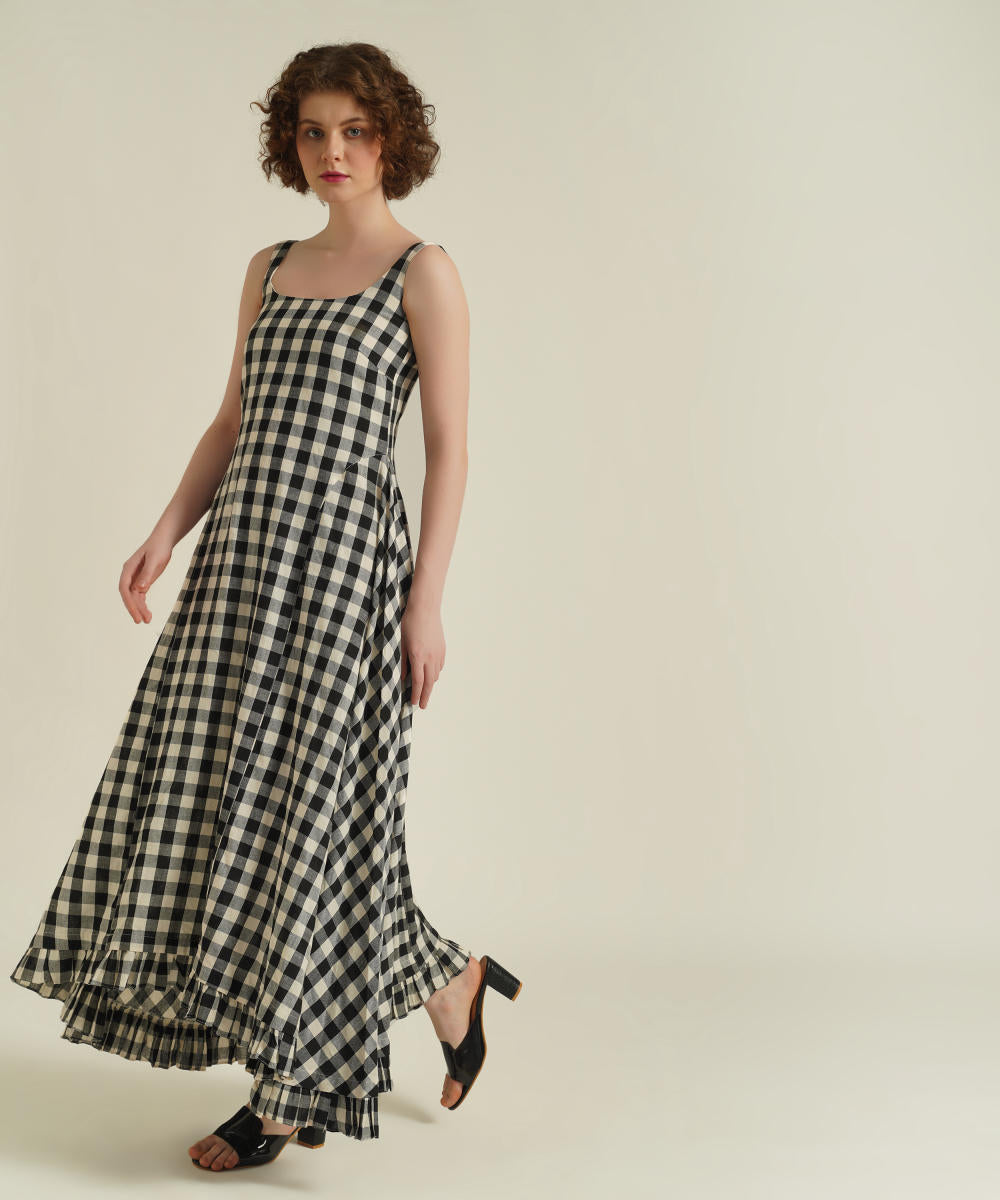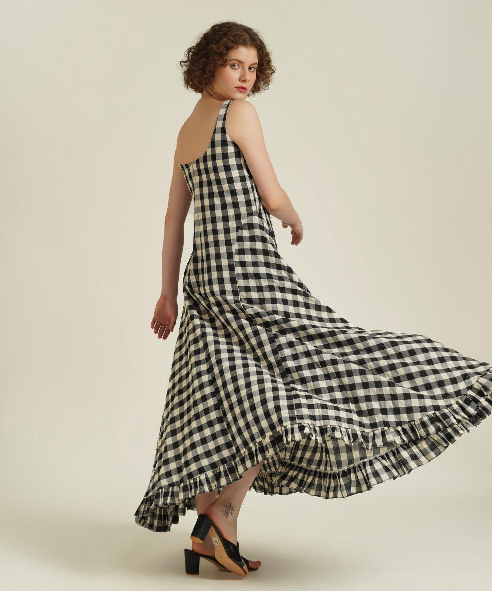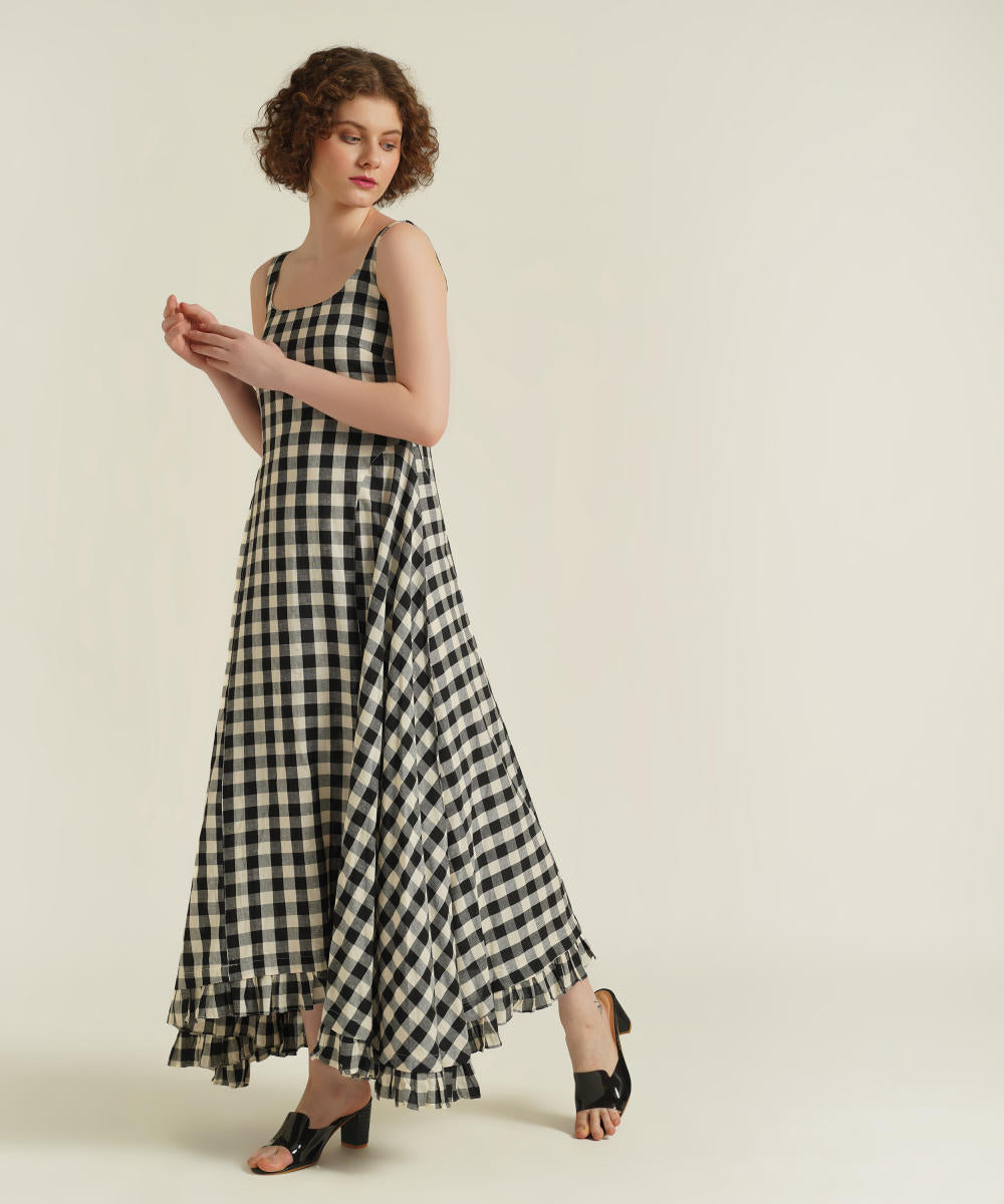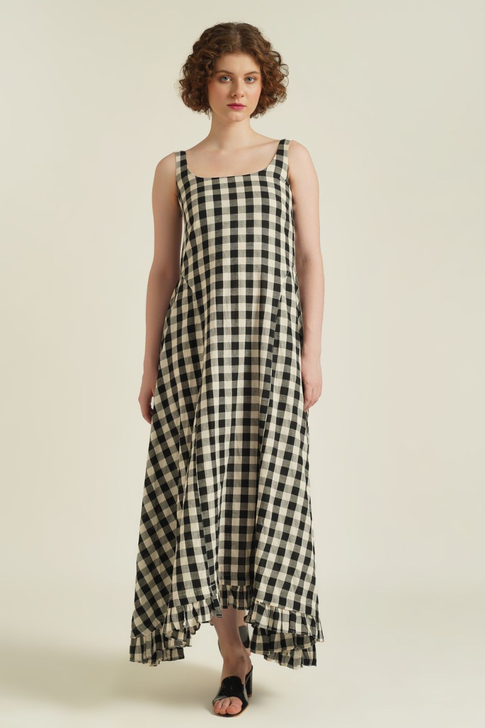 Our signature style flare dress features romantic silhouette, deep square neck, circular panel on the side for a breezy flare, back zipper fastening and frill detailing at the hem.