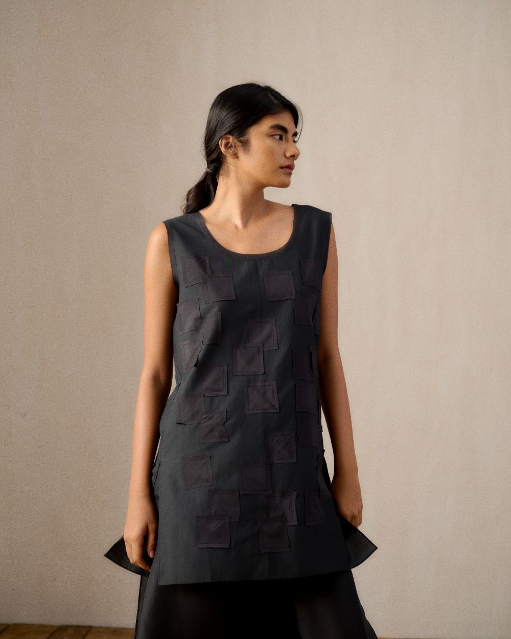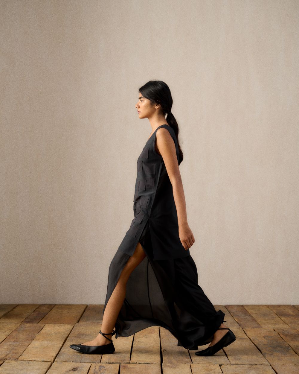 Sensual minimalism in motion, featuring silk appliqué work on a cotton-silk tunic, paired with airy, drawstring pure silk pants and delicate appliqué, lending it an understated elegance that moves effortlessly from day to night.