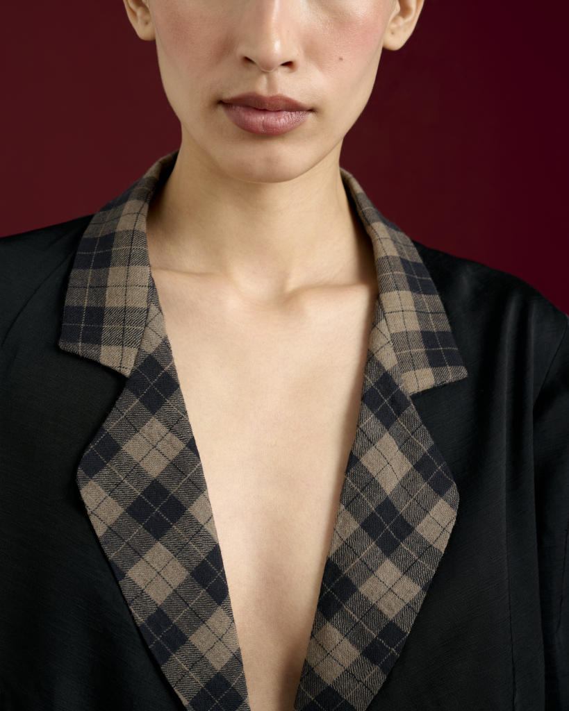 Hidden button under the lapel for versatile styling options