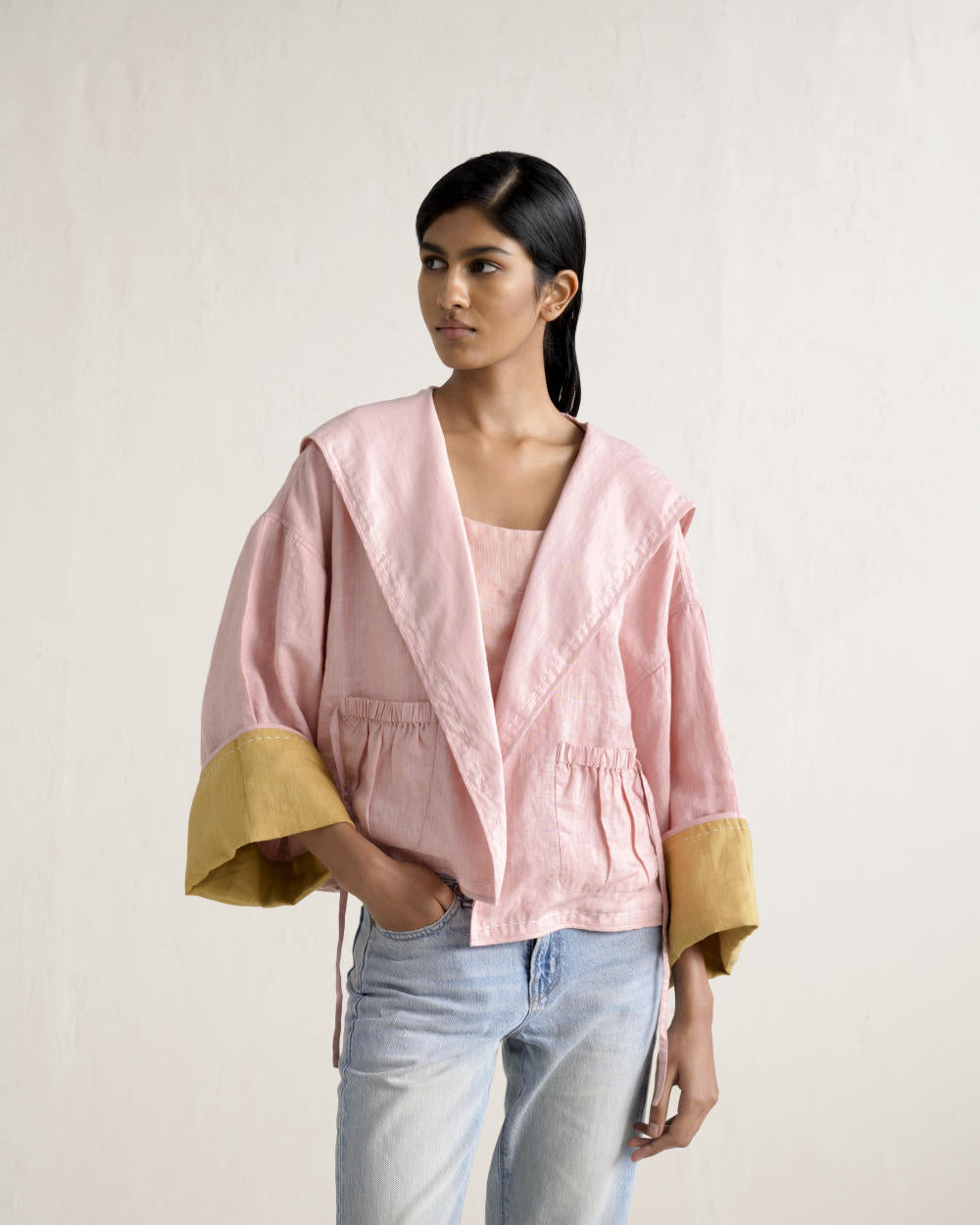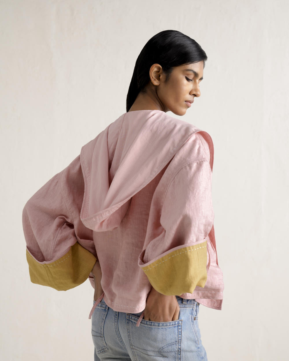 Featuring luxurious linen one side and soft cotton on the other, this reversible jacket is accented with our signature stitching. With functional pockets and a hooded silhouette, it can be styled in multiple ways for a versatile look.