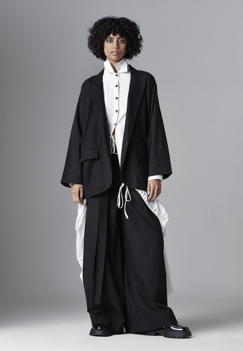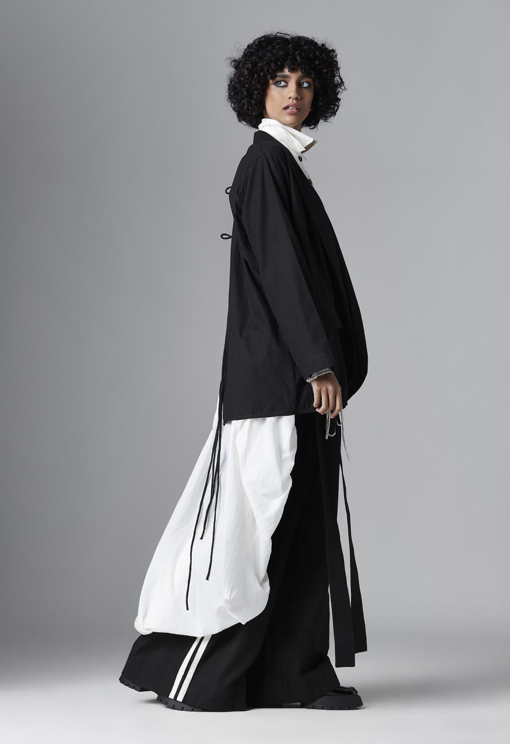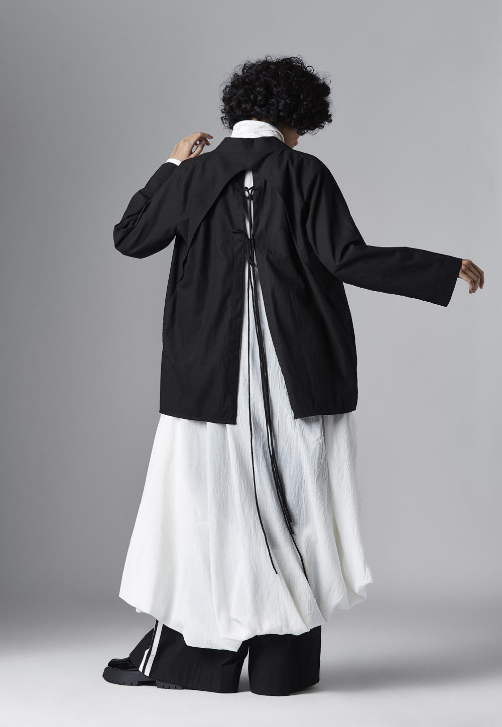 JACKET WITH LAPEL, FULL SLEEVES, CURVED HEM, DEEP U BACK FLAP AND BACK TIE UP OPENING