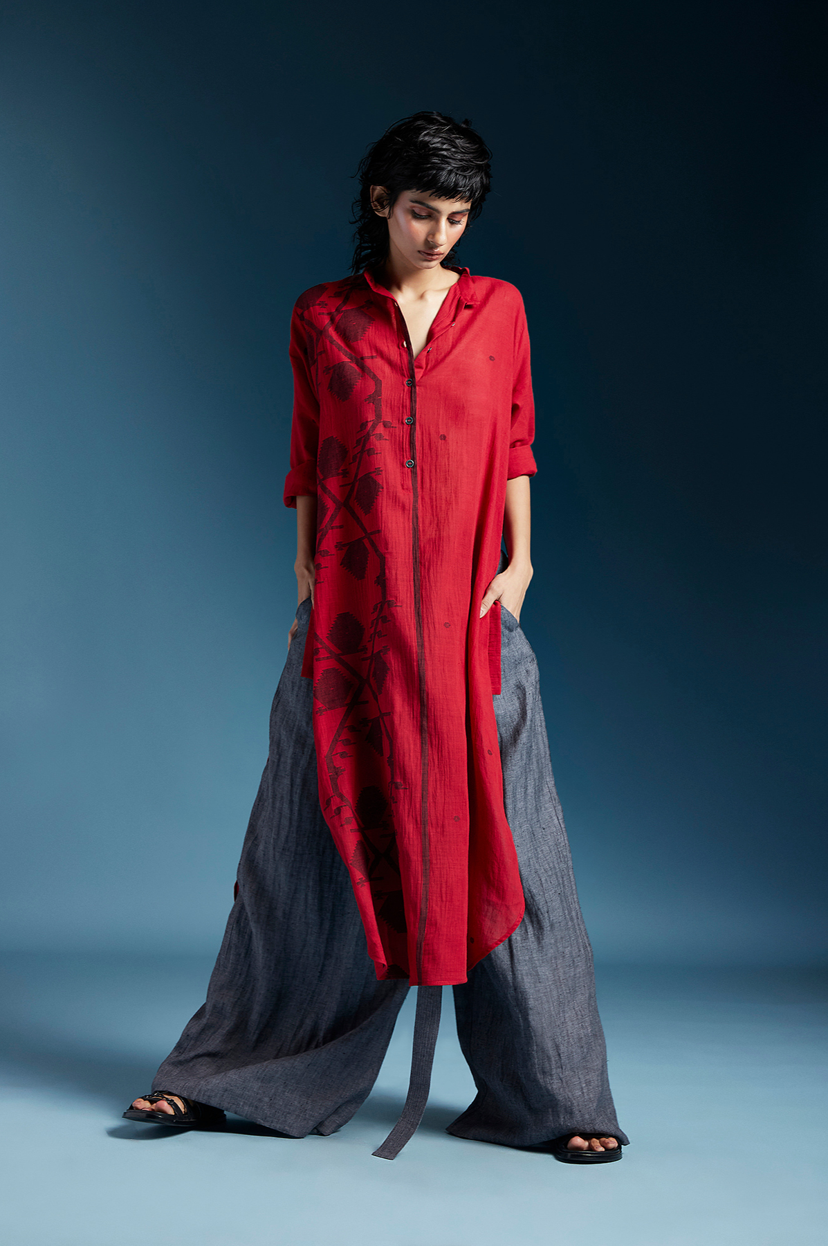 LONG TOP WITH BAND COLLAR, HALF FRONT BUTTON PLACKET, FULL SLEEVES, BACK FLAP AND SIDE BUTTON DETAILS