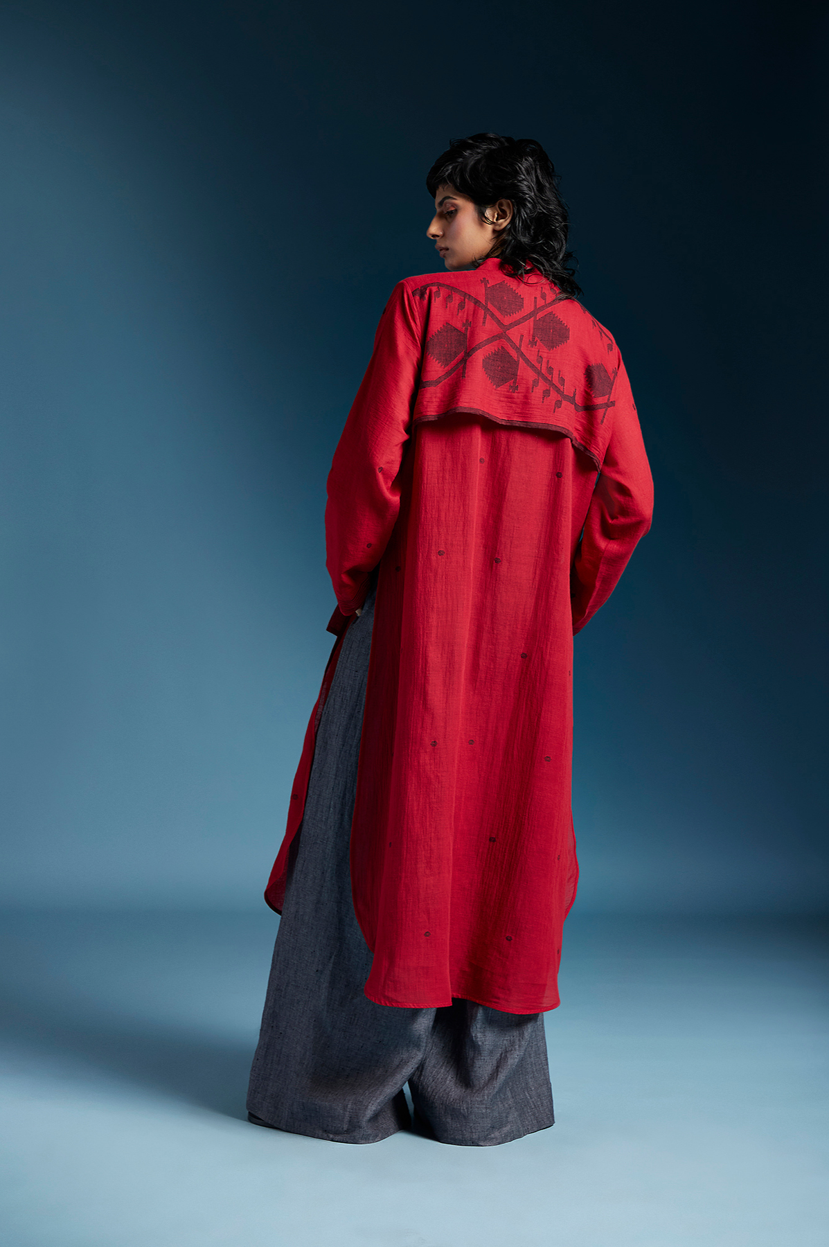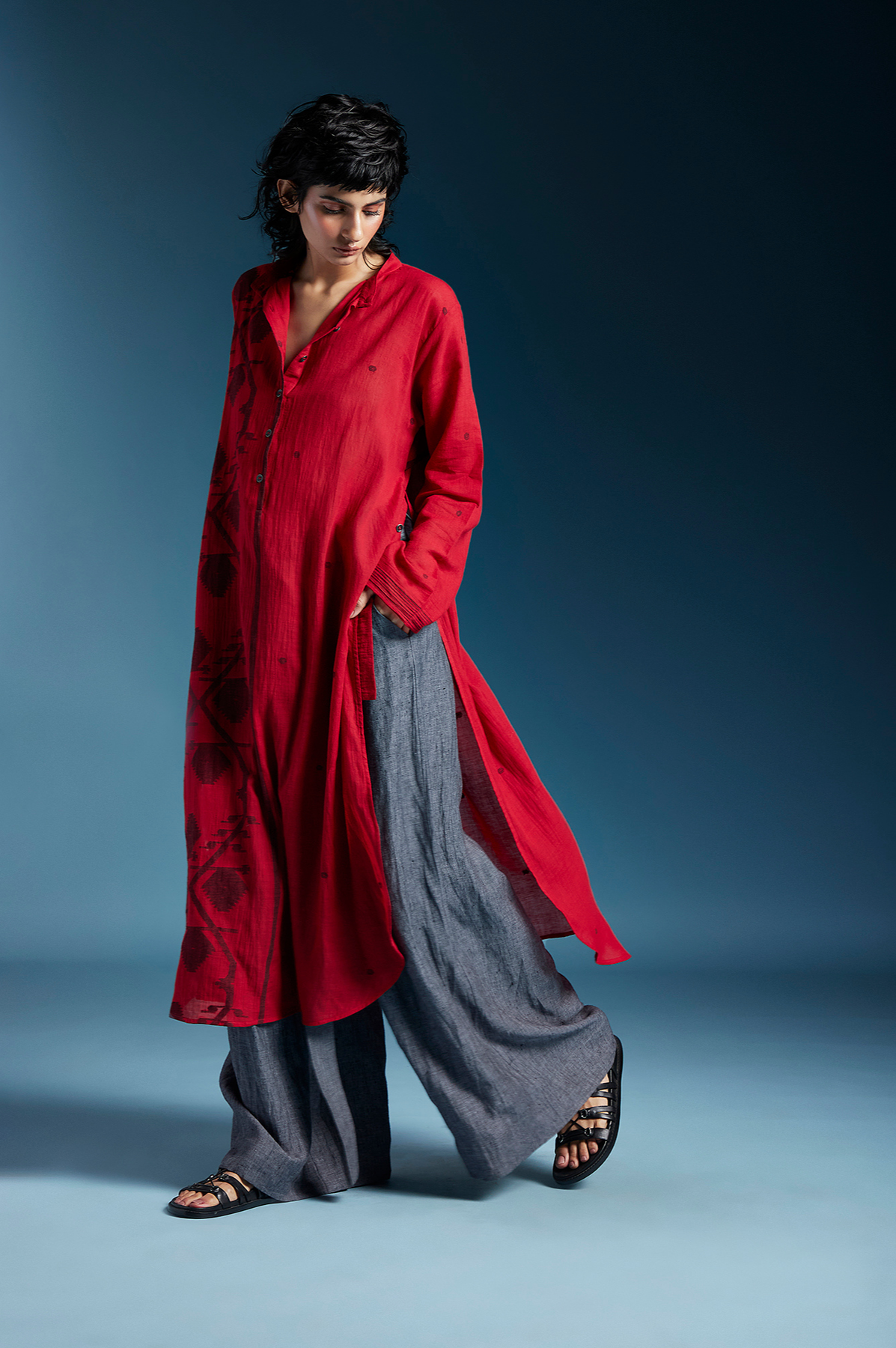 Chola’s universe begins with thoughtful materials. Recycled cottons, post-consumer fabrics, and free-cutting techniques come together in a kind of mindful choreography—one that honours form without creating waste, and prioritises movement over rigidity. This is clothing that feels lived-in yet architectural; pared-back yet quietly avant-garde.