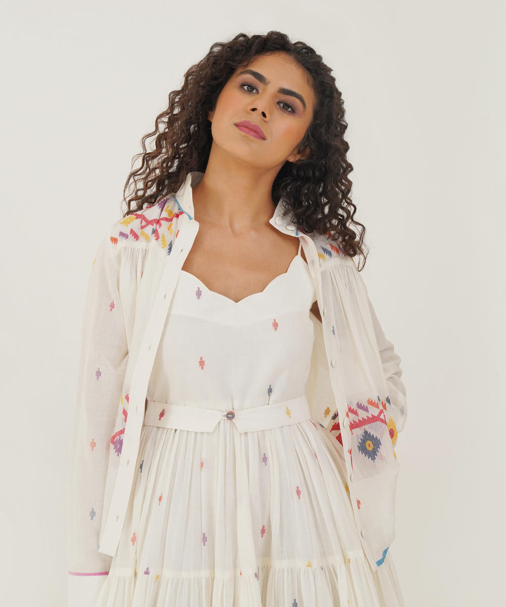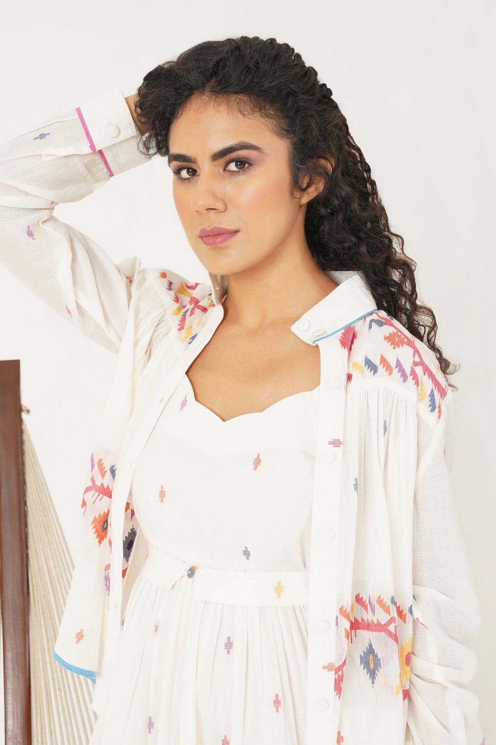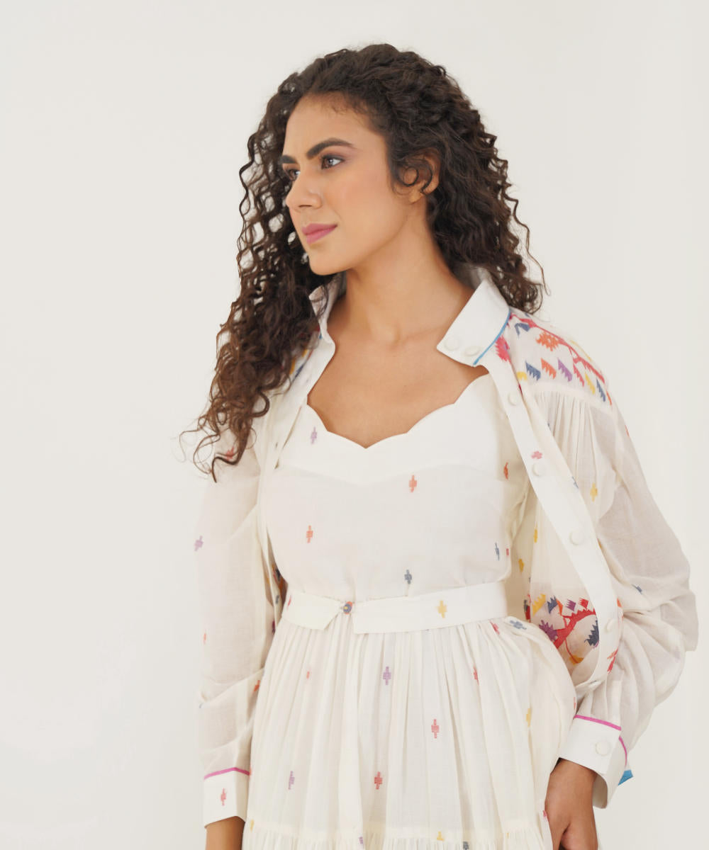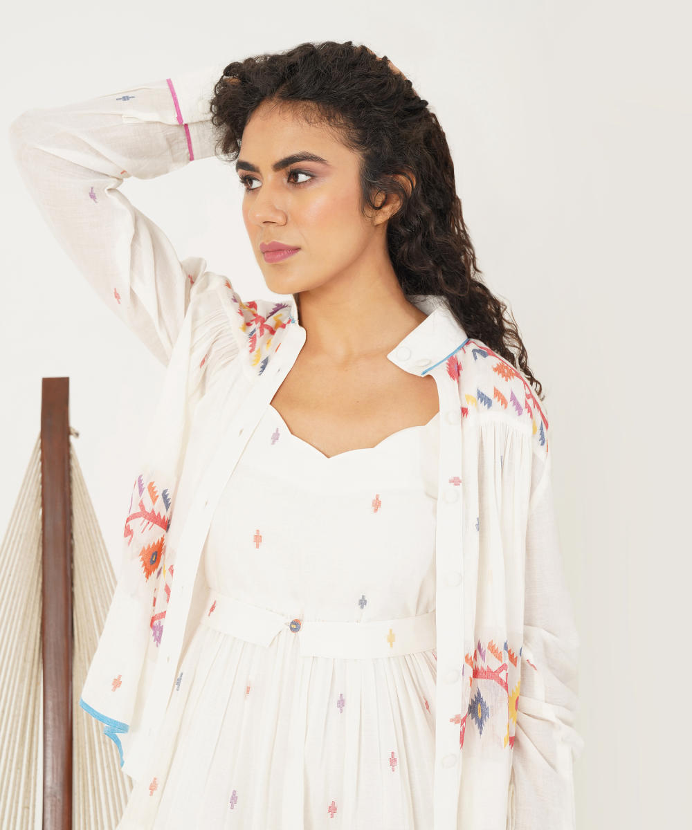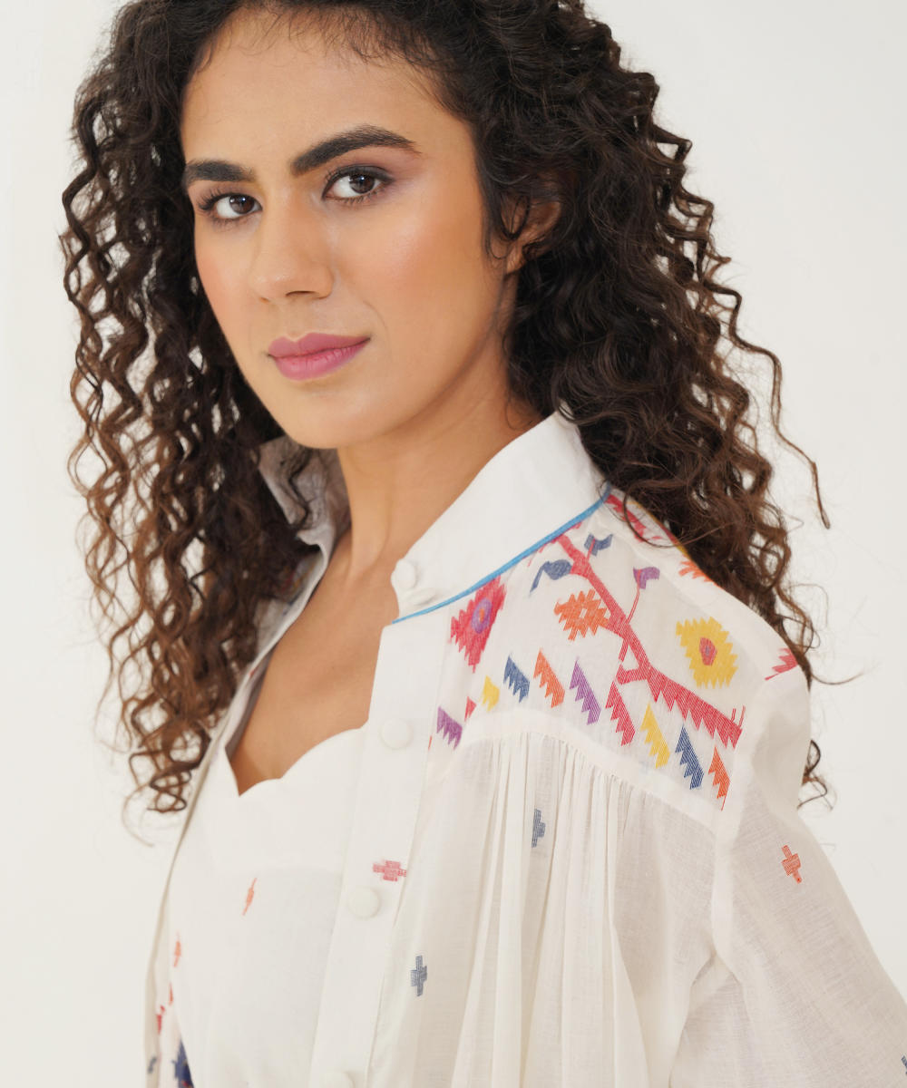 Elevate your wardrobe with our intricately handwoven button-down top, designed to double as a sophisticated overlay. The high collar and cuffed sleeves add a touch of refined elegance, while gentle gathers at both the front and back provide fluidity and ease of movement. This versatile piece beautifully merges traditional craftsmanship with modern versatility, making it a standout addition to any collection.