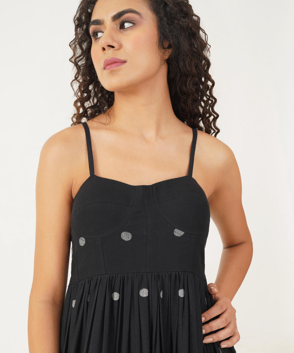 Discover the allure of our Jamdani bralette dress, crafted with delicate noodle straps and adorned with gentle gathers that enhance its elegant silhouette. The back zipper fastening ensures a seamless fit, while the thoughtful inseam pockets offer both functionality and a sleek finish. This dress combines classic craftsmanship with modern convenience, making it a chic and versatile addition to any wardrobe.
