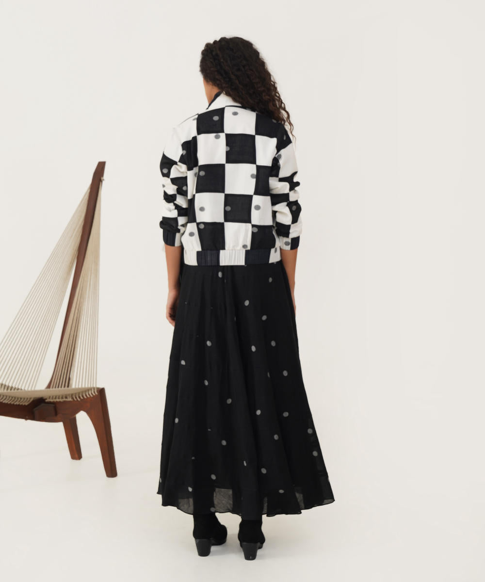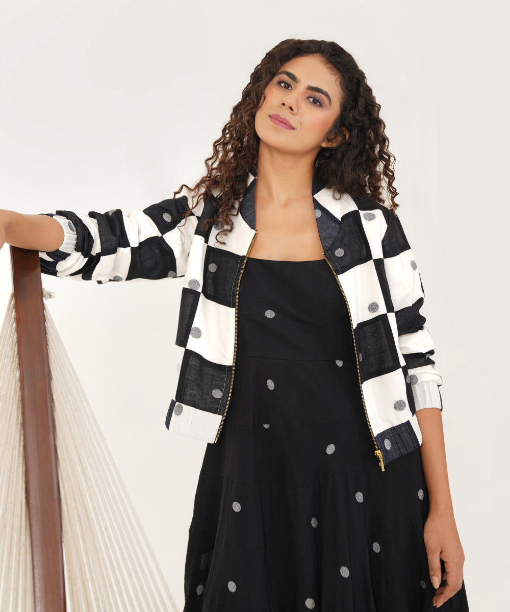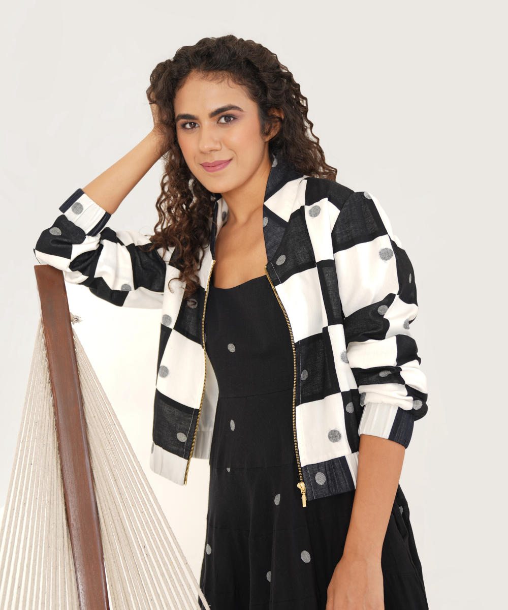 Handcrafted by skilled Indian artisans, this checkered Jamdani bomber jacket, adding a touch of contemporary flair to a timeless design.