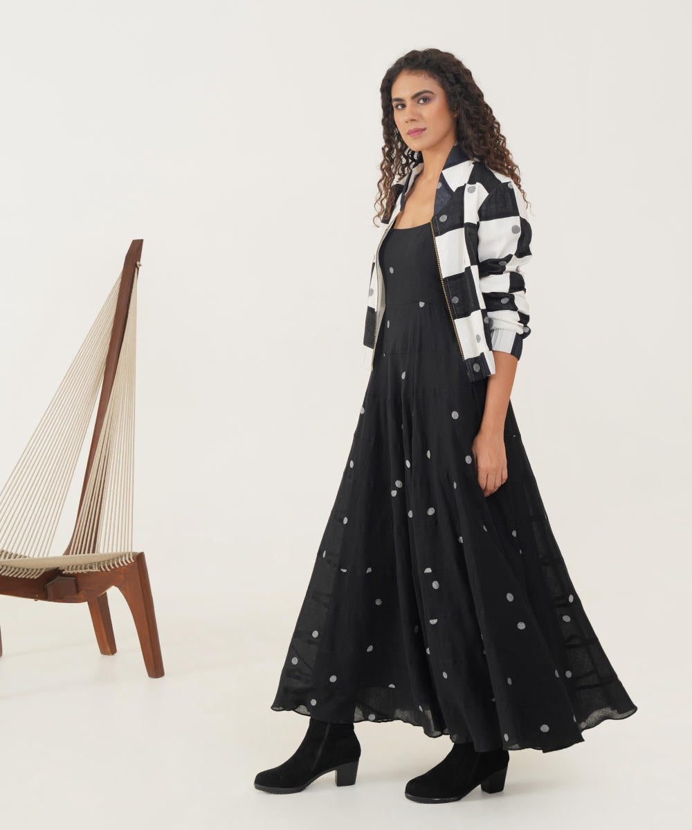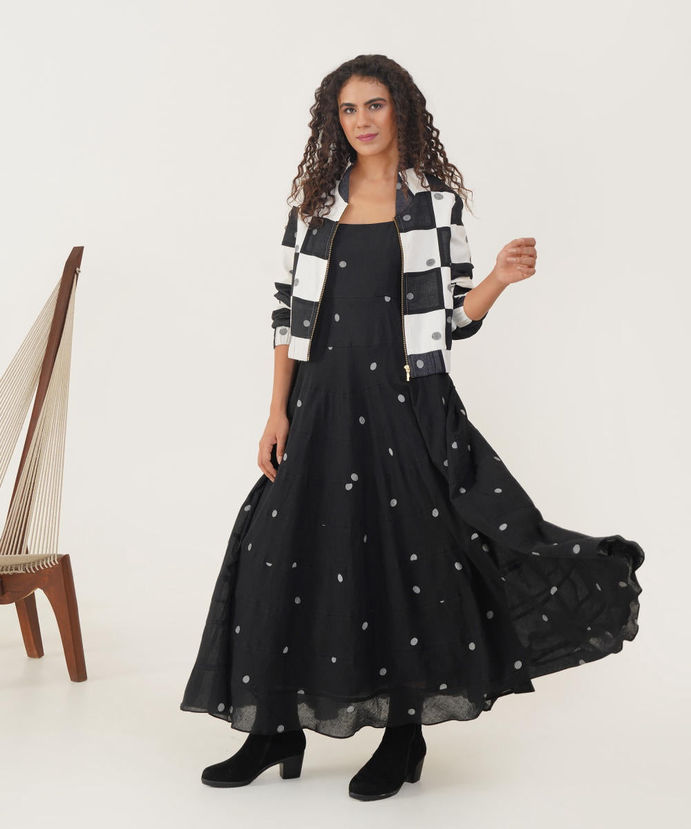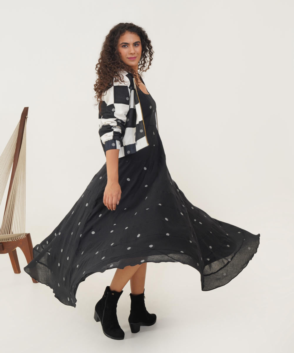 Handcrafted by skilled Indian artisans, this checkered Jamdani bomber jacket, adding a touch of contemporary flair to a timeless design.