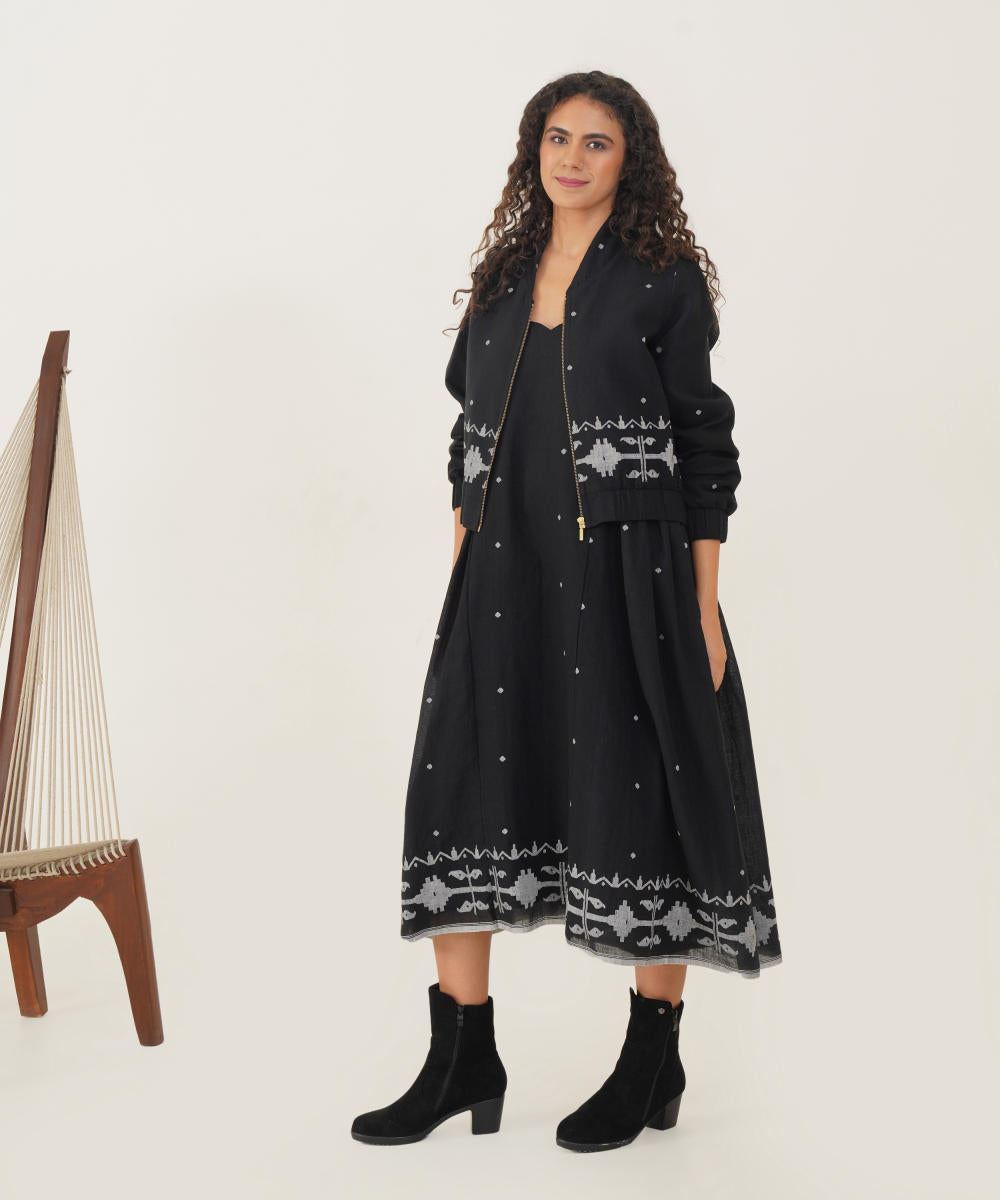 Discover the allure of timeless sophistication with our classic Jamdani ensemble. The scalloped neckline dress, adorned with delicate spaghetti straps and gentle side gathers, offers a flattering and elegant silhouette. Complemented by an intricately woven Jamdani bomber jacket, this set seamlessly blends traditional craftsmanship with modern style. Together, they create a look that is both refined and unique, perfect for making a lasting impression.