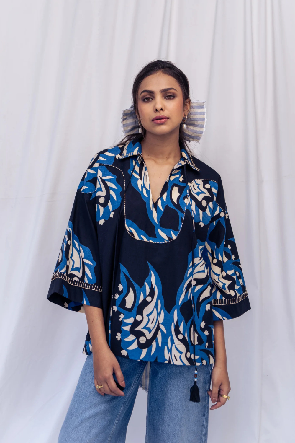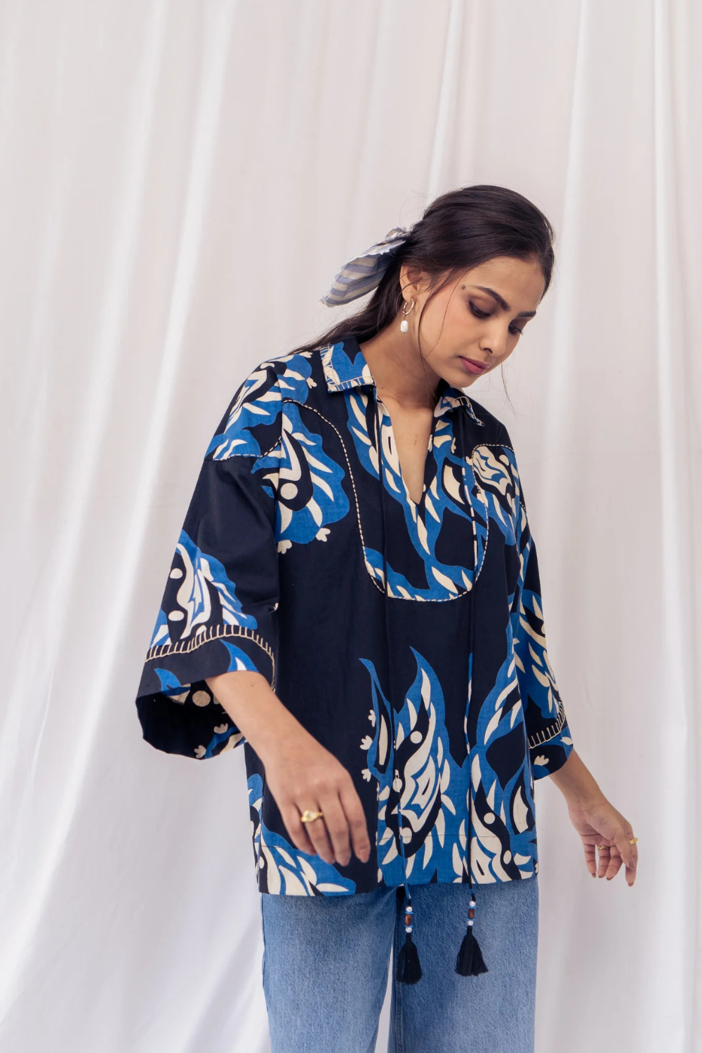 The blouse has delicate embroidered off-white stitching along the collar, yoke and sleeves. It’s an ideal pick for exploring far-flung locales on your vacation. Made from soft cotton with a screen-printed design, with neck strings and a bead detail at the tie-up. We believe customers have a right to know how their product was made. 2.5 metres of cotton fabric sourced from Jaipur has been used for this piece. Hand-printed by our artisans in Jaipur, manufactured in our workshop at Pune, India. Our product is handprinted in Jaipur, India, using traditional techniques. Subtle variations in patterns are natural to this process. We believe this makes each creation unique and charming. Some call it je ne sais quoi. We call it JODI. If you wish to have the length of the garment altered, please mention your request in the special instructions section at checkout, with your desired length.